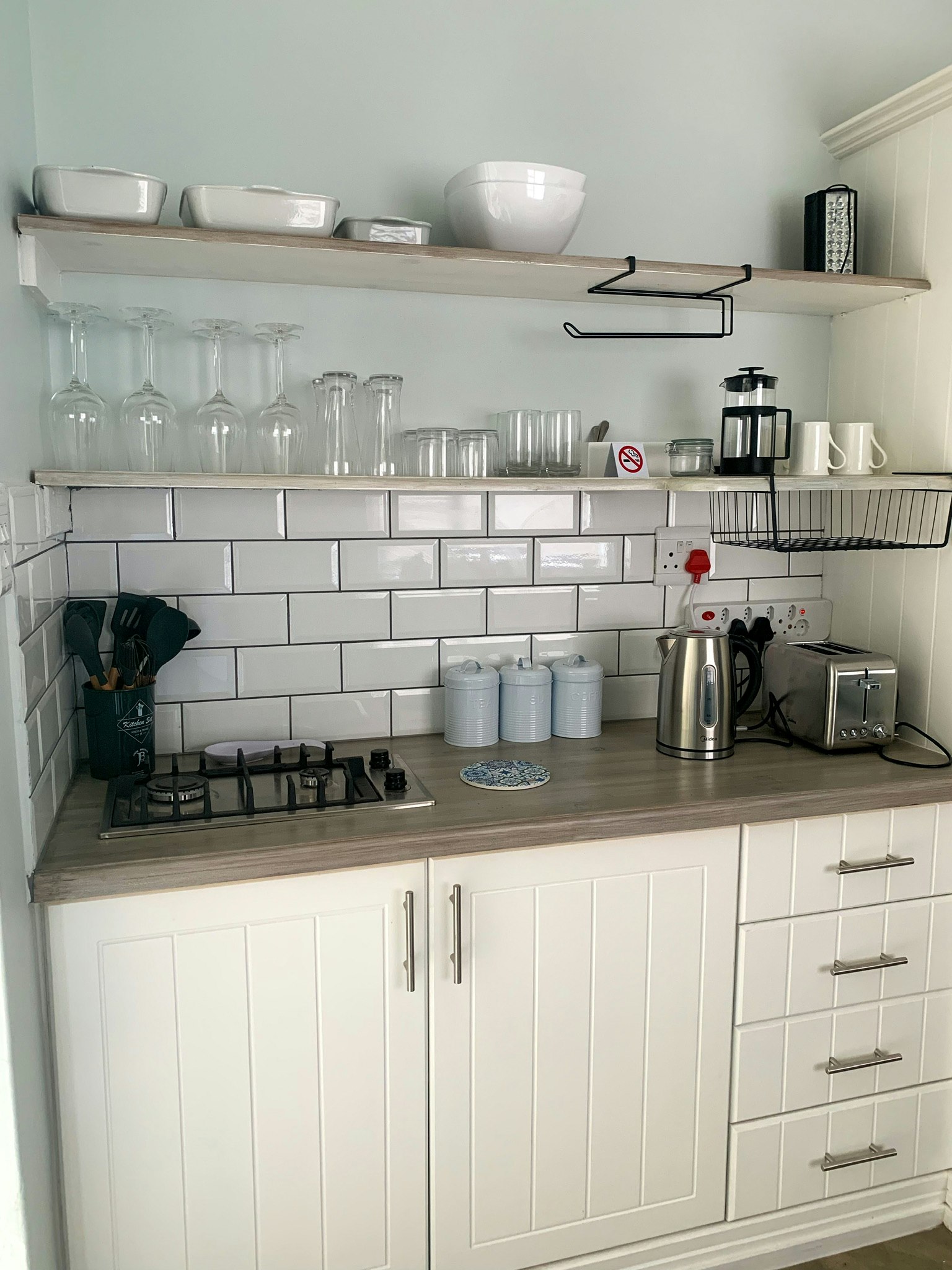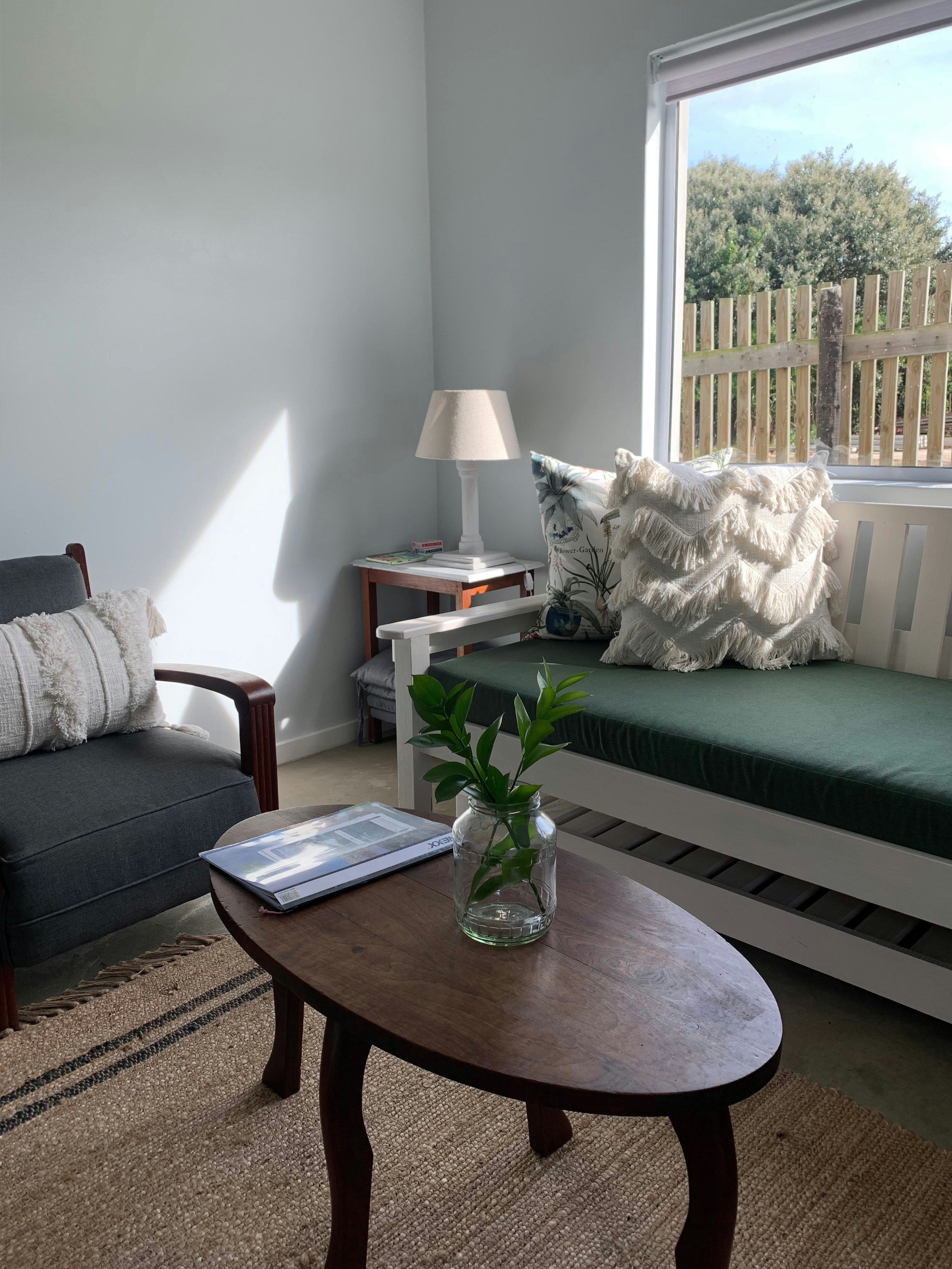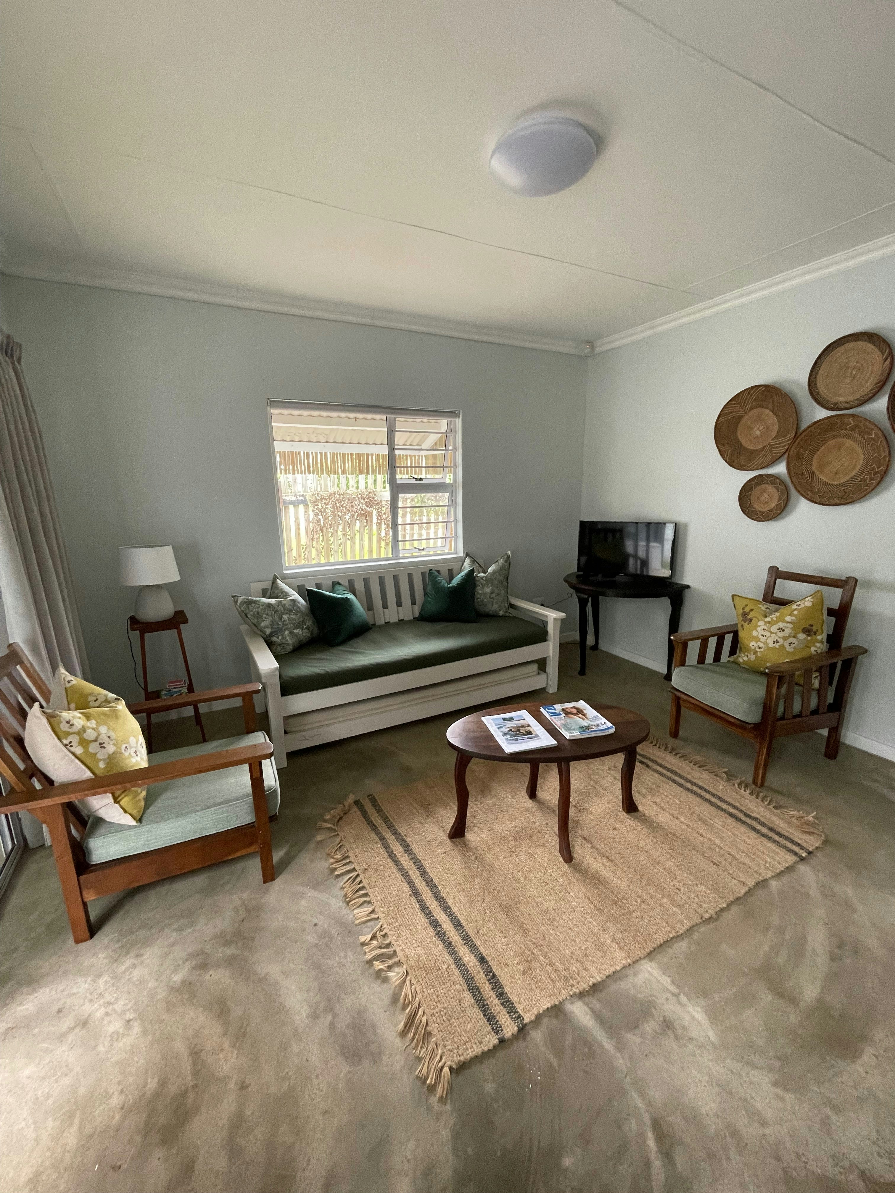 The open-plan kitchenette is equipped with a fridge-freezer, gas stove, oven, microwave, basic cutlery, crockery, and tea- and coffee-making facilities. It leads into the lounge area furnished with comfy couches and features a single sleeper couch for an extra person.