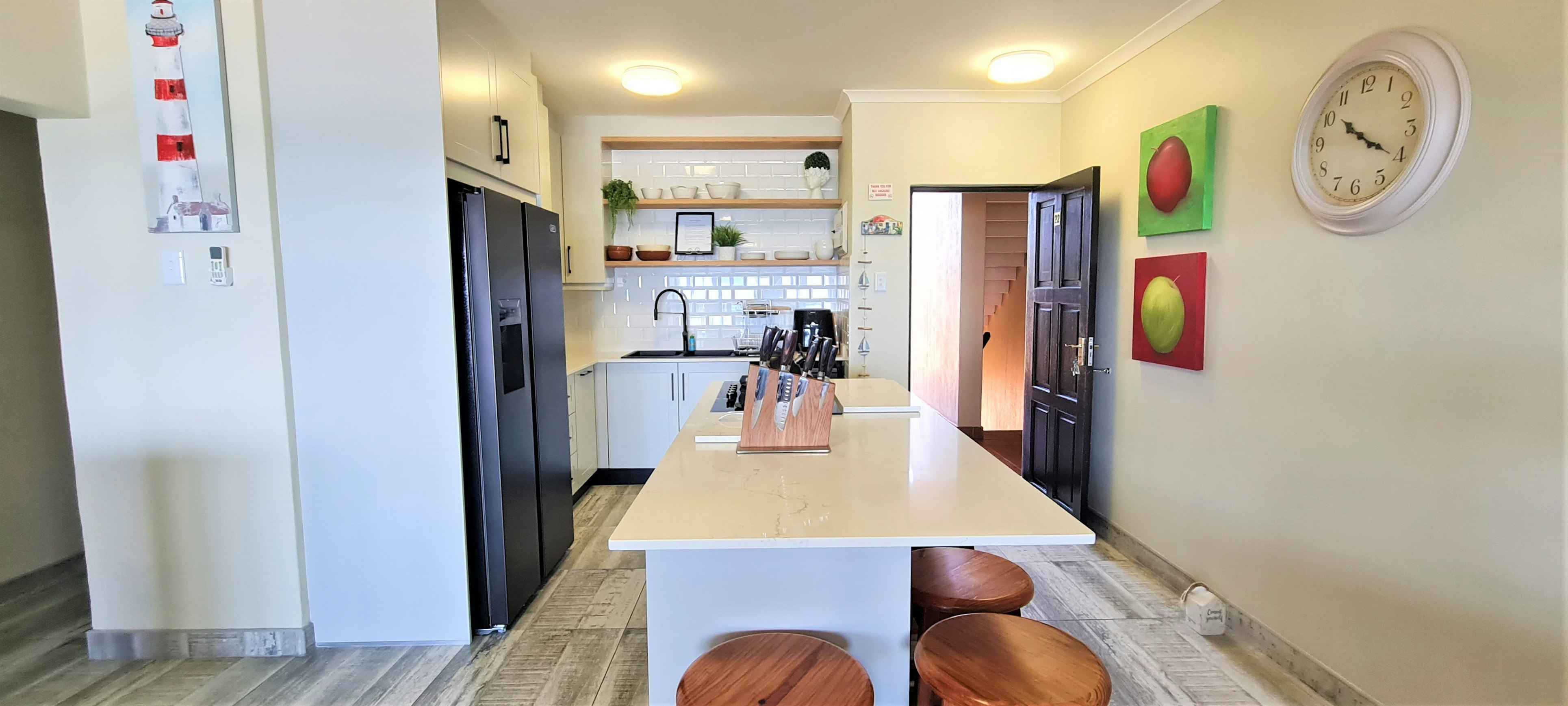 The kitchen is fully equipped with a gas stove, an electric oven, an air-fryer, a fridge with a freezer, a microwave, and a dishwasher. Laundry facilities include a washing machine and a tumble dryer. The unit has an inverter to power certain items during load shedding or power failures