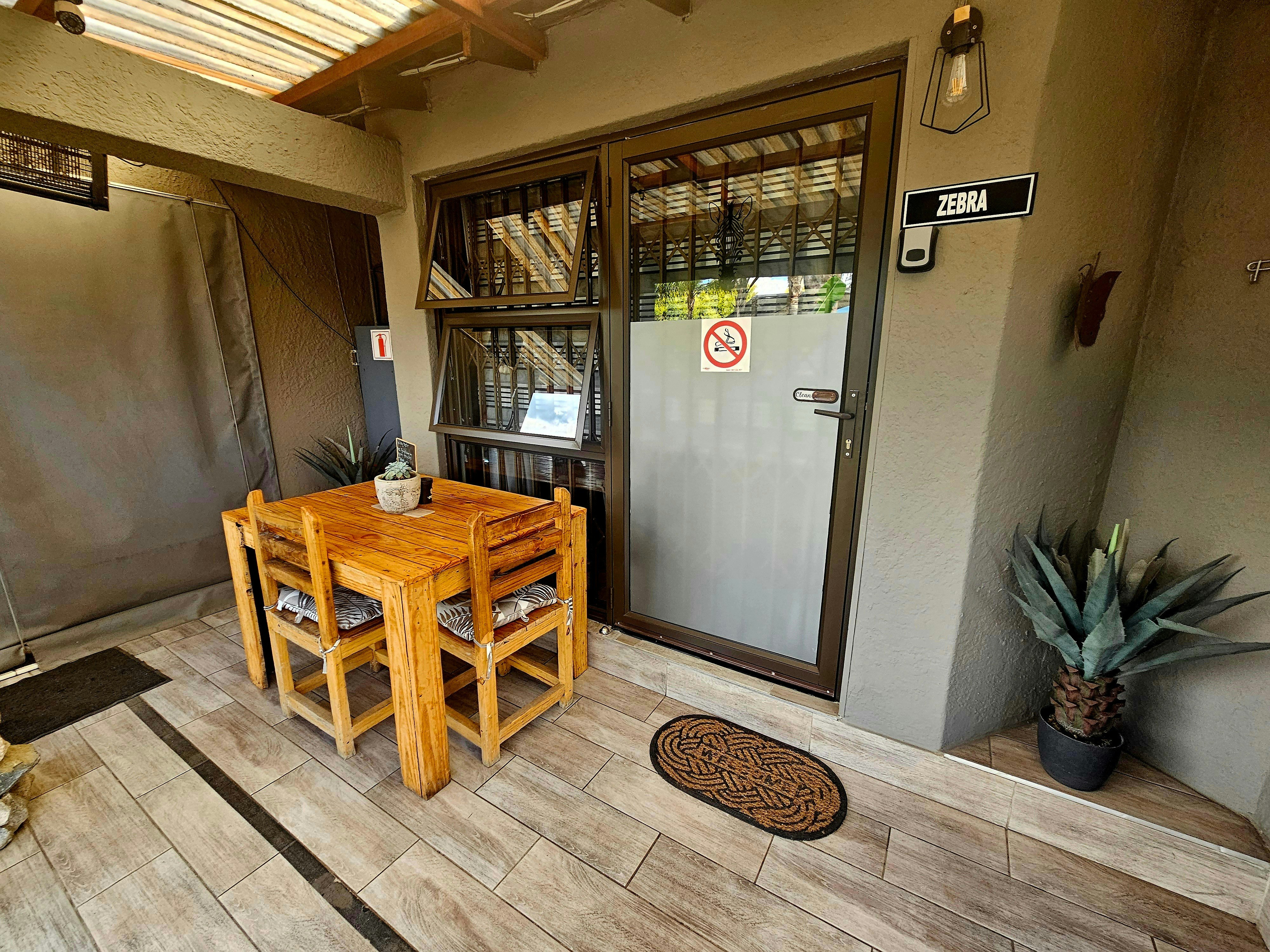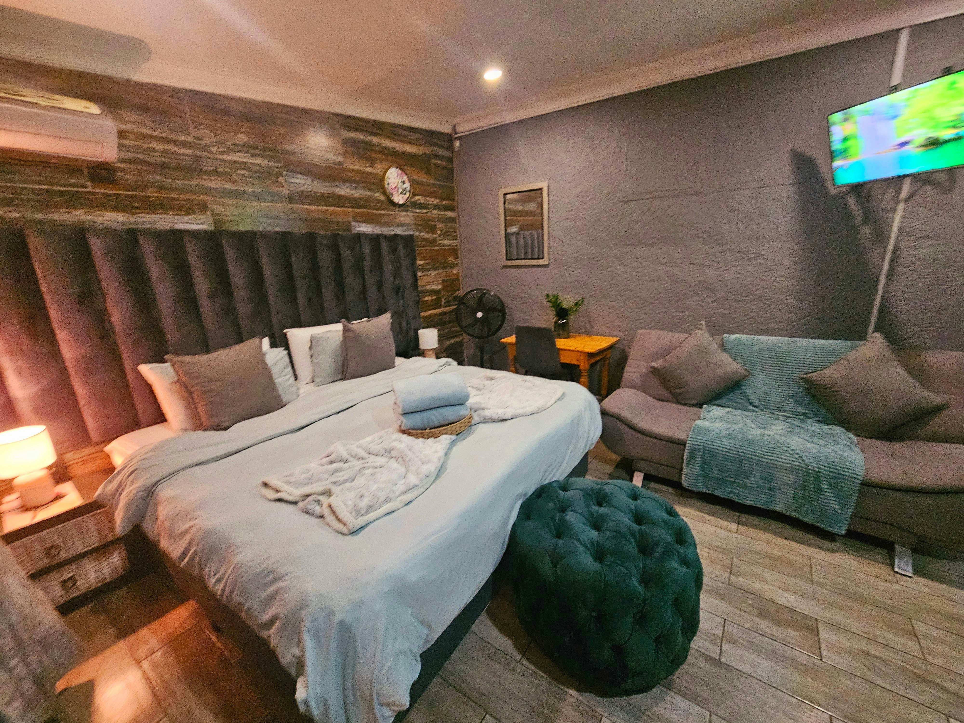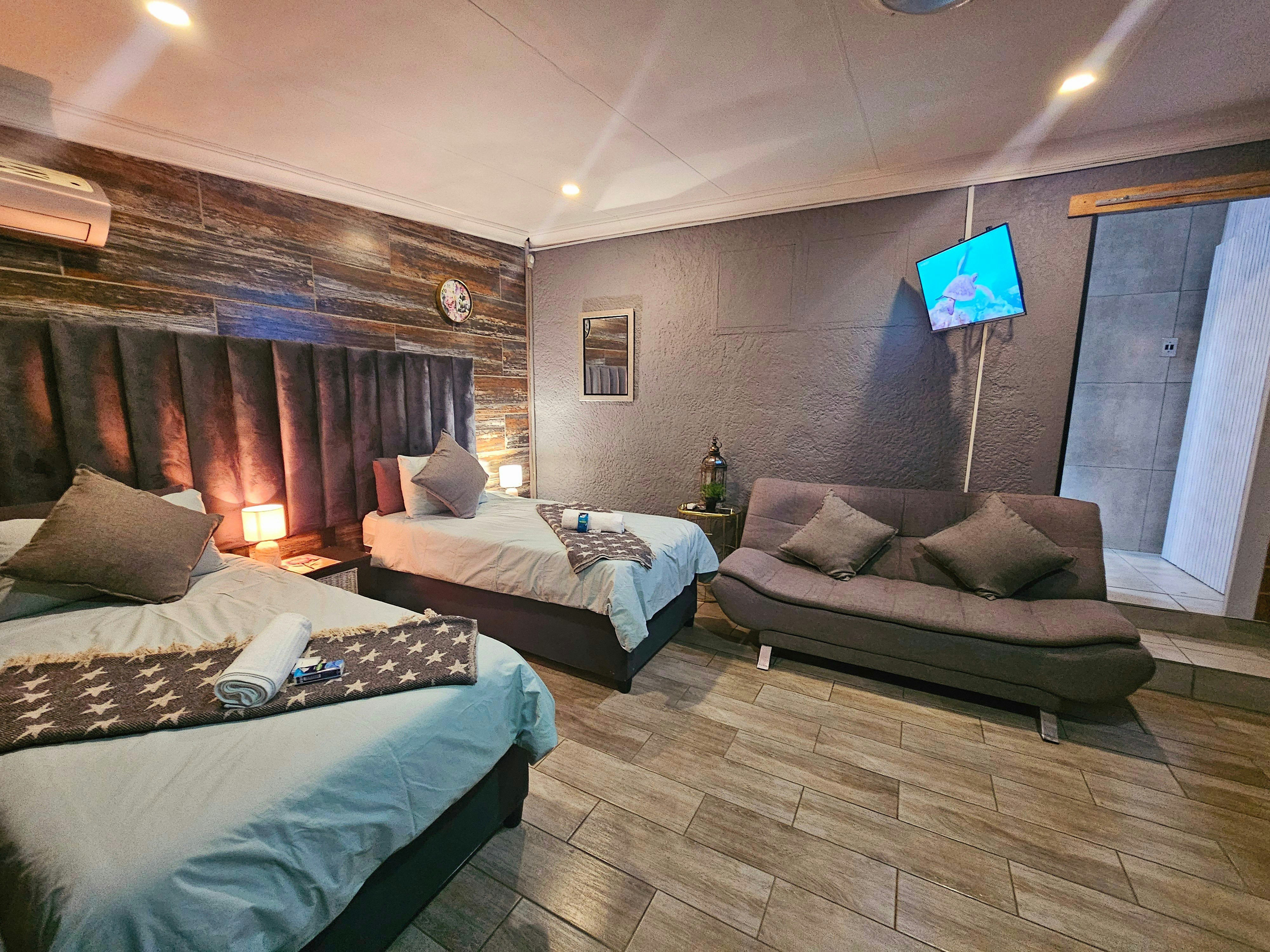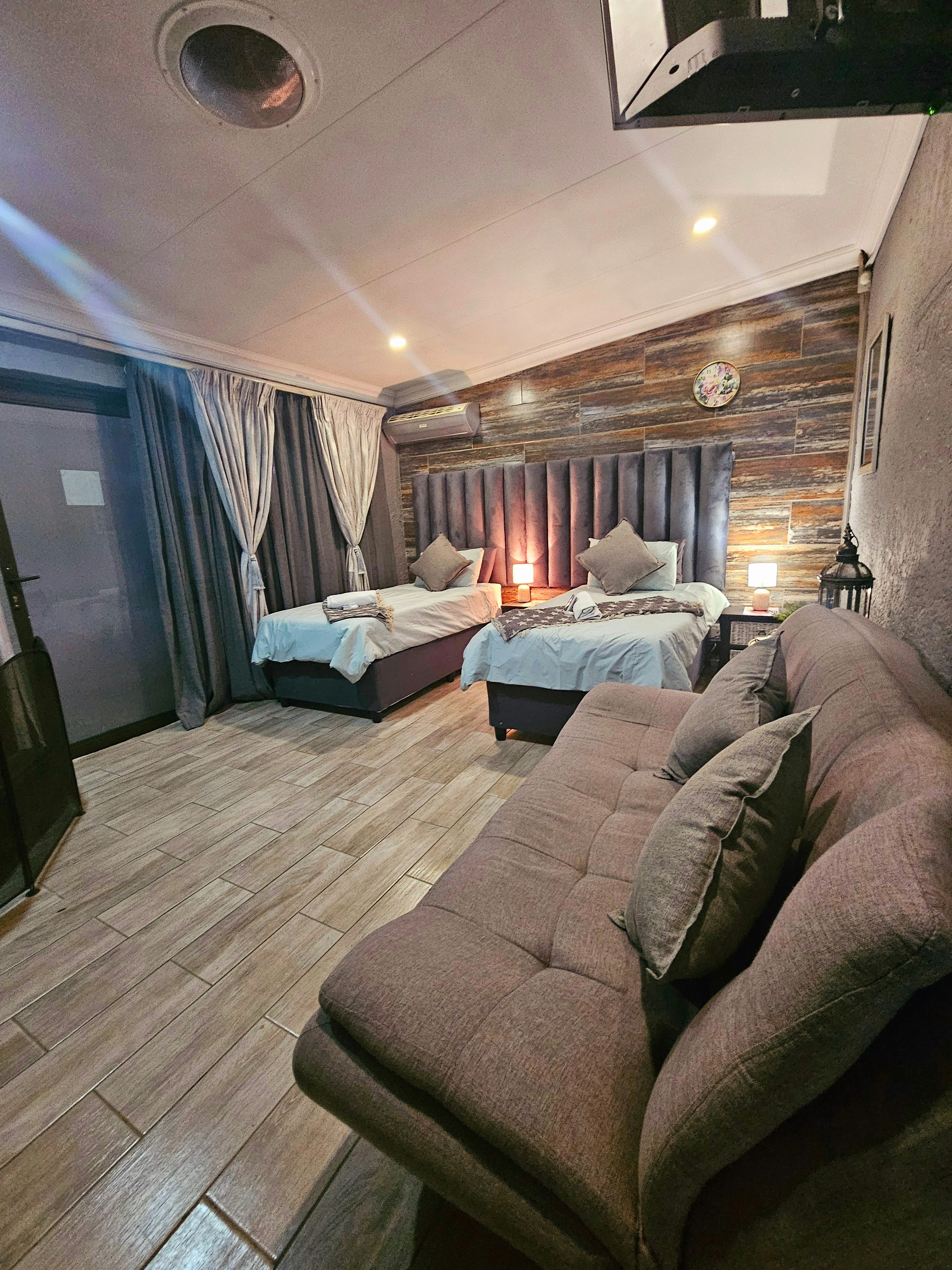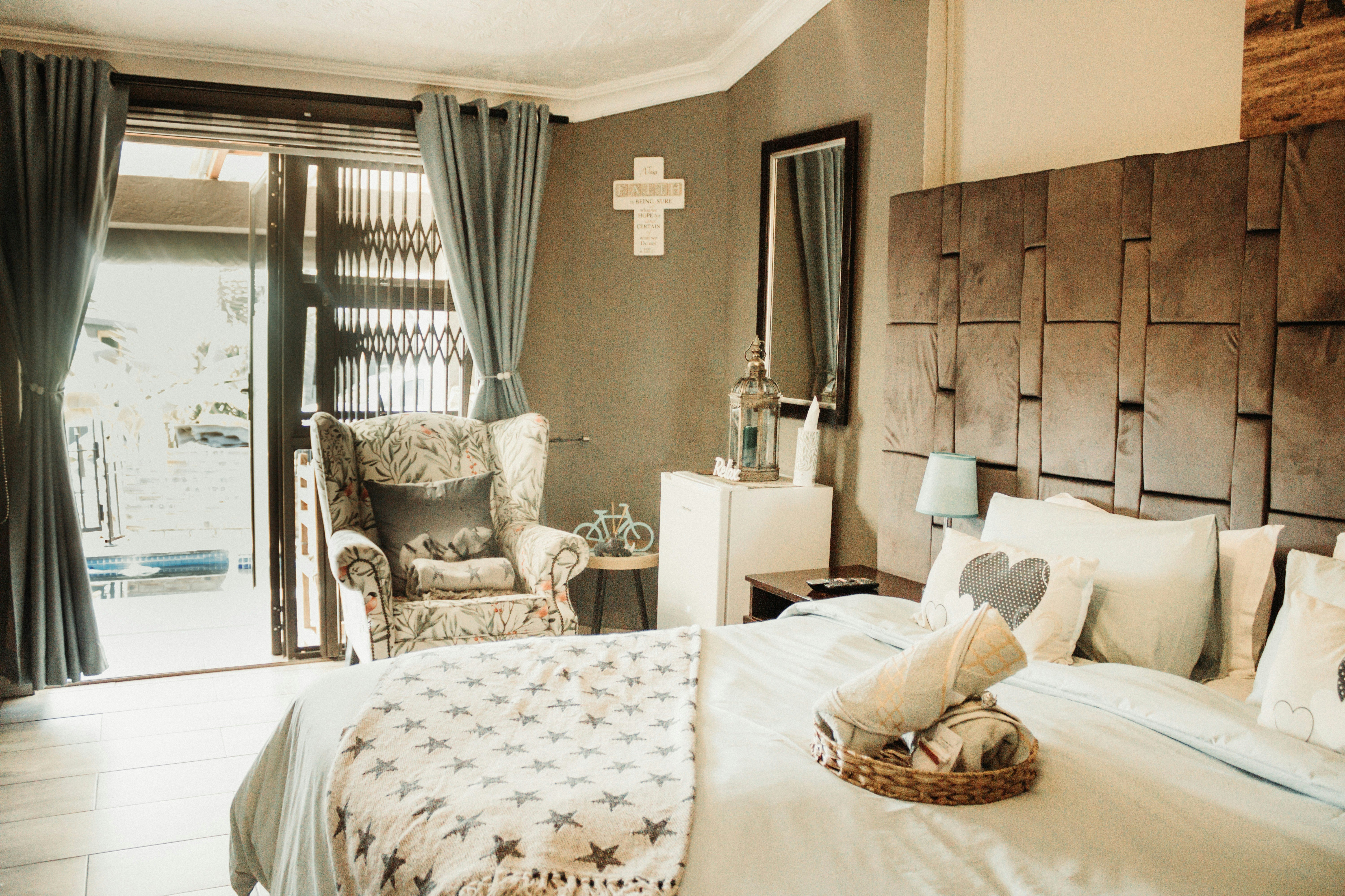 Verblyf word in 5 gastekamers voorsien. Elke eenheid maak oop na 'n patio met 'n lieflike sitarea. Die patio kyk uit oor die swembad. Die slaapkamers is gemeubileer met 'n koningingrootte bed, met ekstra slaapbanke in die gesinskamers, en 'n en suite-badkamer met 'n stort, toilet en wasbak. Kamergeriewe sluit in ingeboude kaste, 'n TV met Netflix, WiFi, 'n yskas, 'n mikrogolfoond en tee- en koffiemaakgeriewe. Gaste kan by DStv aanmeld met hul eie besonderhede.