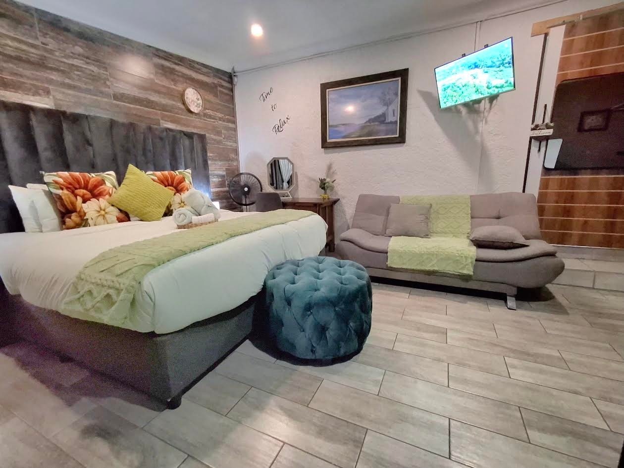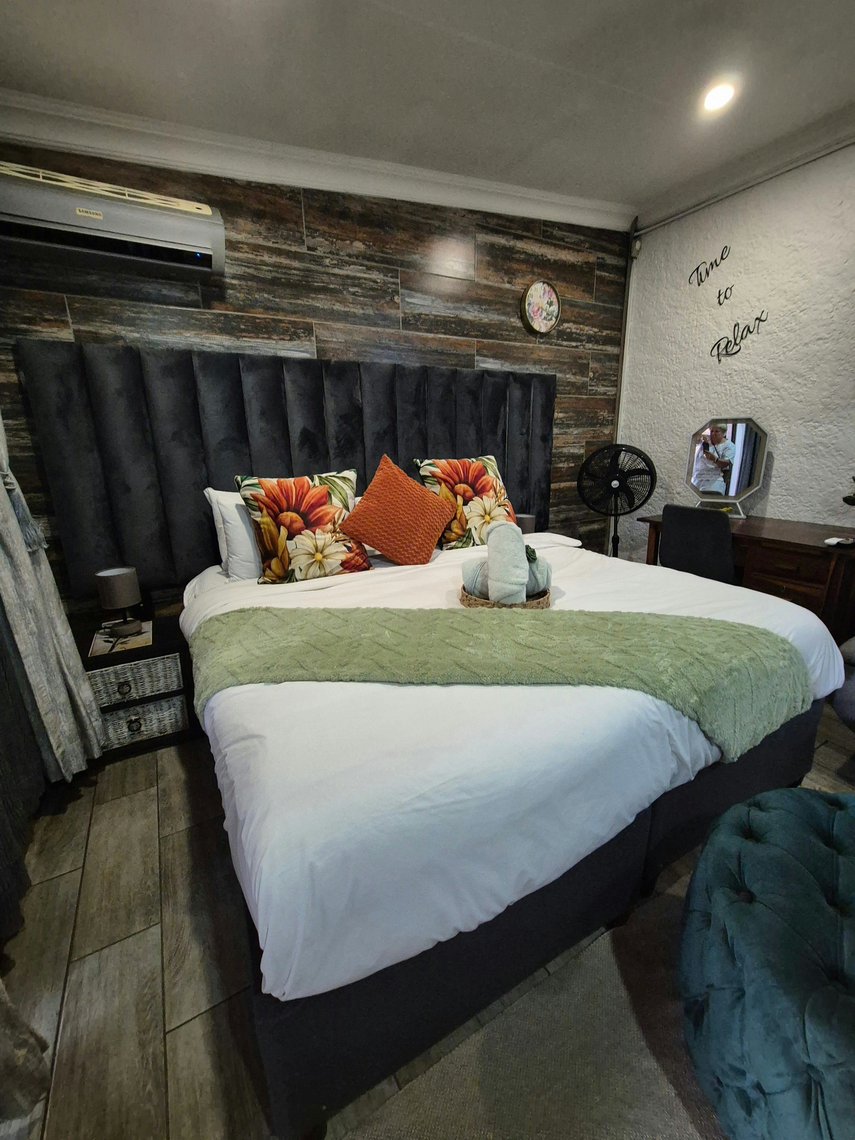 Accommodation is provided in 5 guest rooms. Each unit opens onto a patio with a lovely seating area. The patio overlooks the swimming pool. The bedrooms are furnished with a queen-size bed, with extra sleeper couches in the family rooms, and an en-suite bathroom with a shower, toilet, and basin. Room amenities include built-in cupboards, a TV with Netflix, WiFi, a fridge, a microwave, and tea and coffee-making facilities. Guests can log in to DStv using their own details.