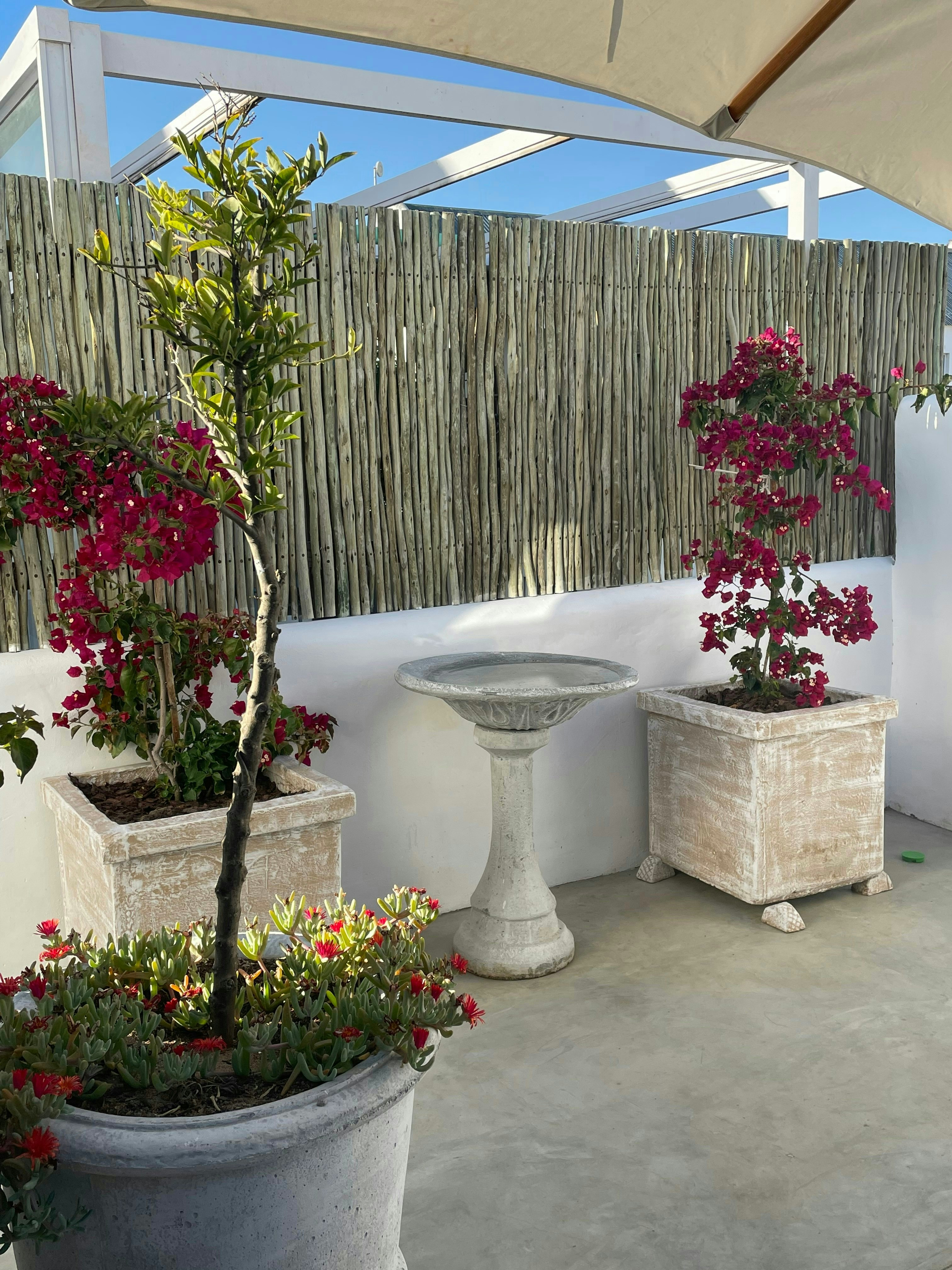 The property features 2 well-appointed accommodation options that can sleep 2 guests each and a separate cottage that can accommodate 4 guests. Bougain Villa Studio 1 is a ground-floor unit furnished with a queen-size bed, while Bougain Villa Studio 2 is a spacious first-floor unit featuring twin beds that can be converted into a king-size bed. Both studios have private bathrooms fitted with a walk-in shower, basin, and toilet. Linen and towels are provided for your convenience. The cottage comprises two bedrooms with a queen-sized bed and 2 single beds, both rooms have an en-suite fitted with a shower, basin and toilet.