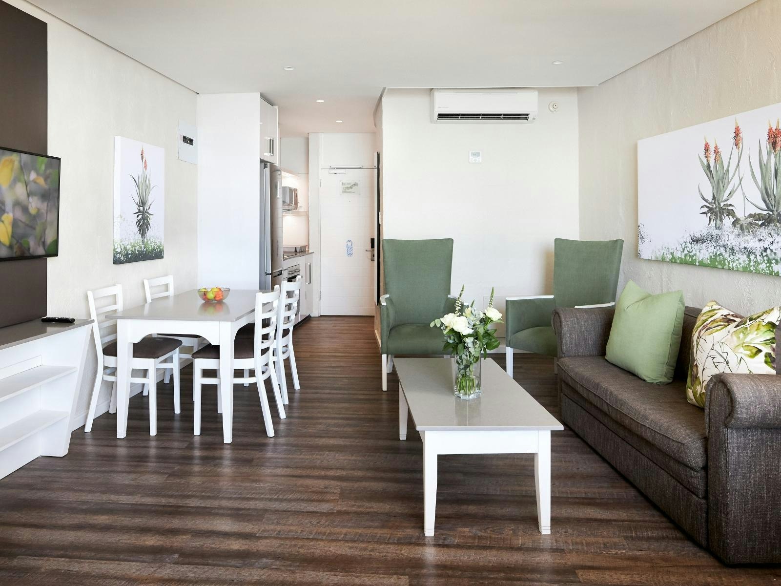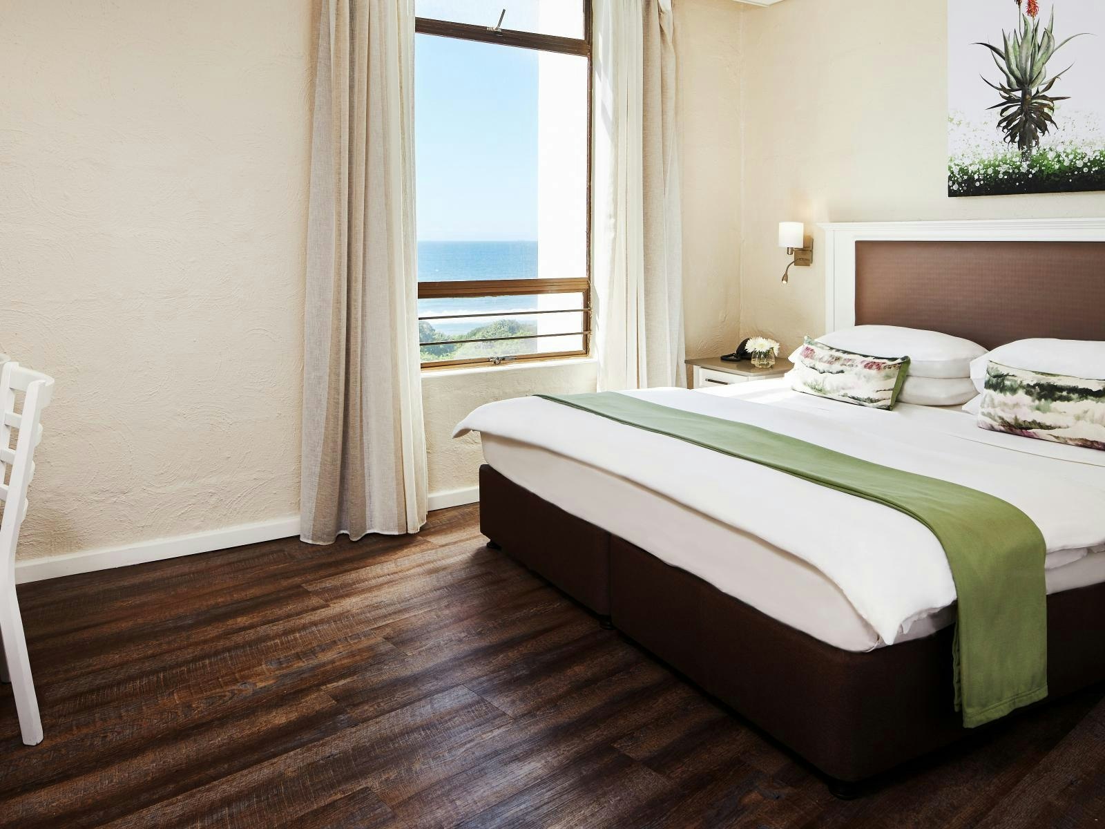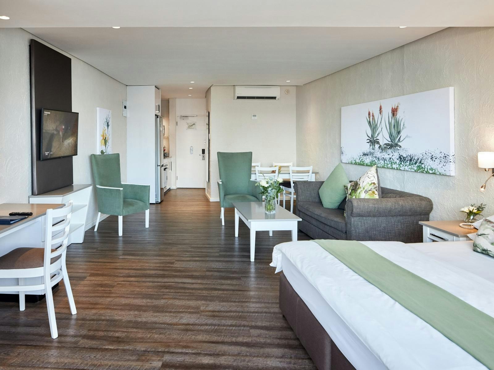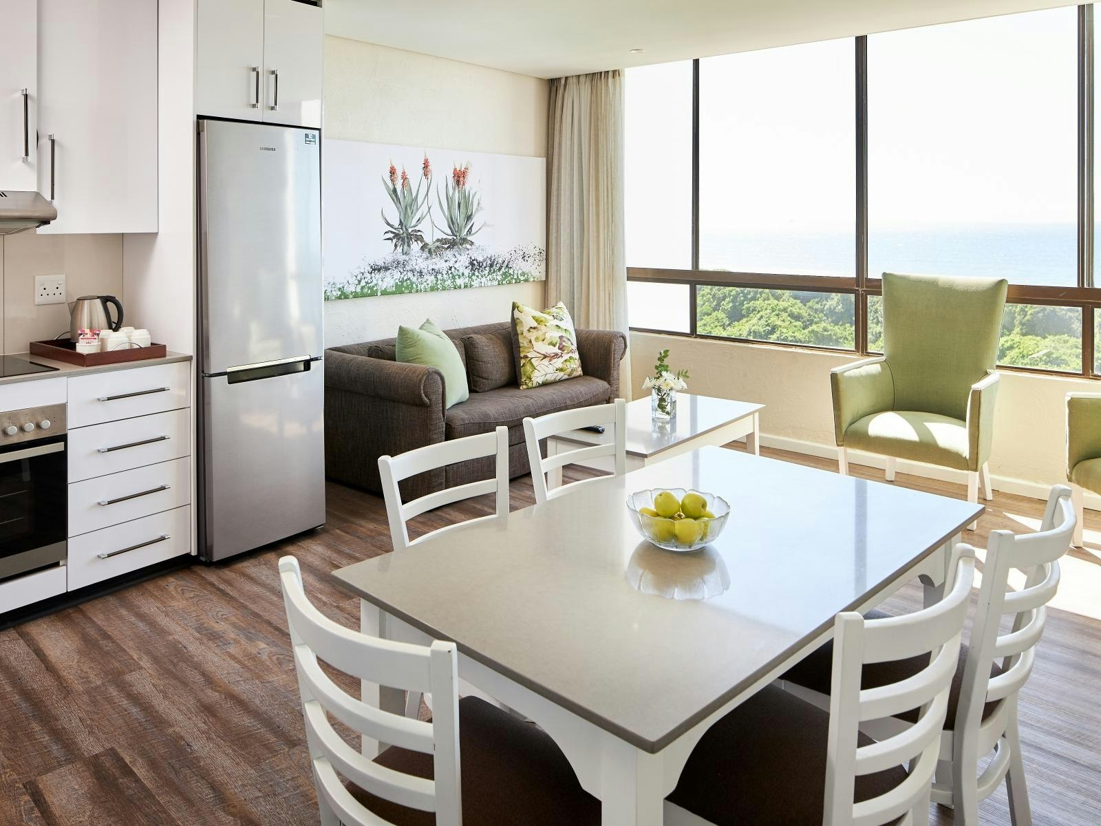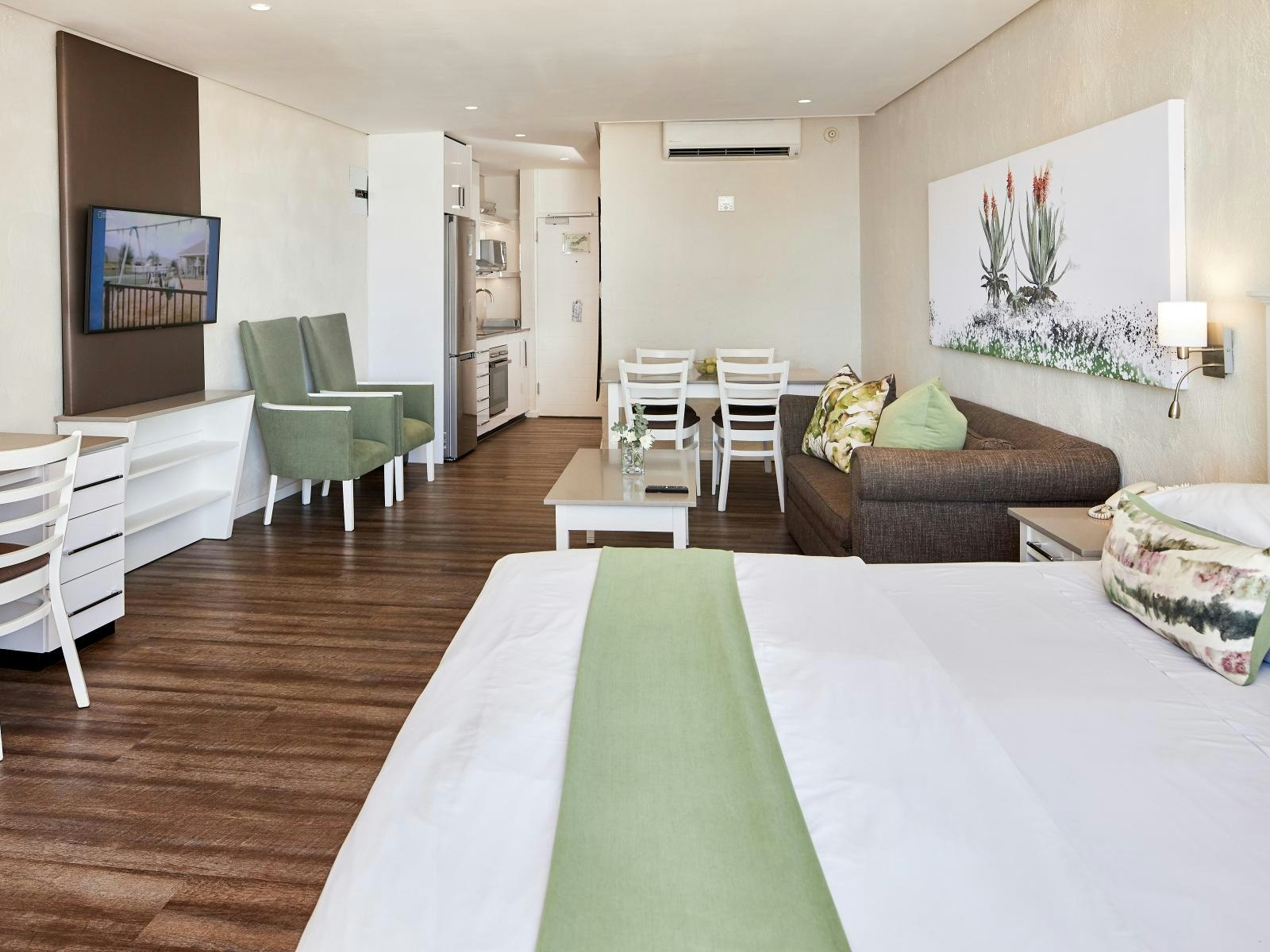 Guests are immediately struck by the futuristic horseshoe design of the resort, which overlooks an attractive swimming pool and offers panoramic views of the garden and coastal area. Self-catering accommodation is offered in open-plan studio apartments and 2-bedroom family apartments. Each unit has its own kitchen facilities equipped with a microwave, fridge, hob, under-counter oven, electric kettle, toaster, pots, glassware, crockery, cutlery and utensils. The lounge areas feature a TV with selected DStv channels. The air-conditioned units are provided with telephones, electronic safes and hairdryers, and are serviced on a daily basis.