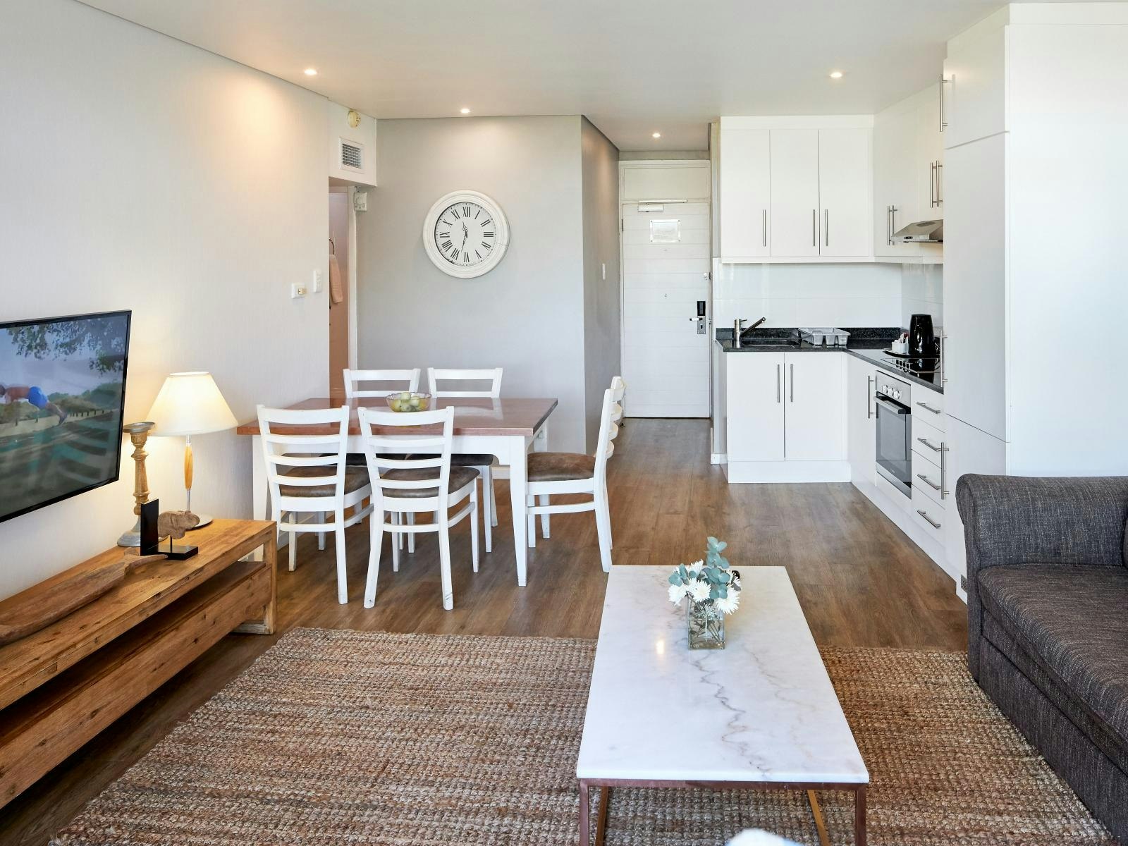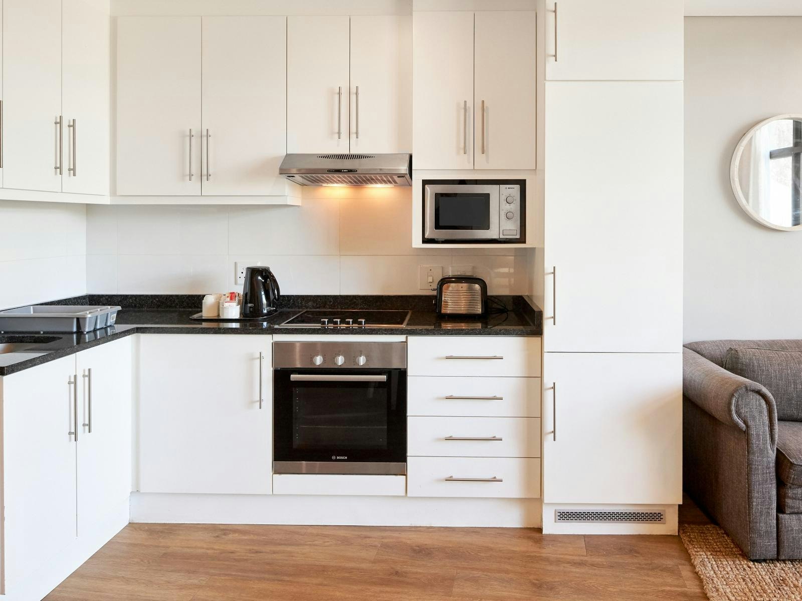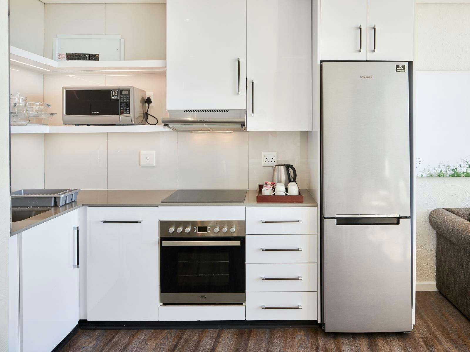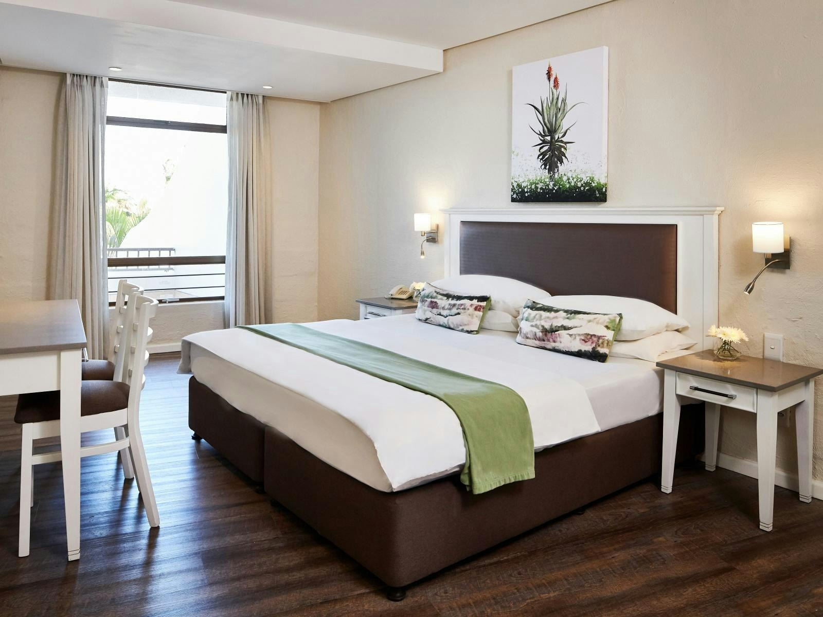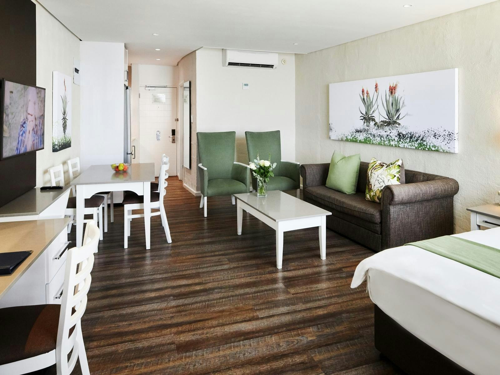 Guests are immediately struck by the futuristic horseshoe design of the resort, which overlooks an attractive swimming pool and offers panoramic views of the garden and coastal area. Self-catering accommodation is offered in open-plan studio apartments and 2-bedroom family apartments. Each unit has its own kitchen facilities equipped with a microwave, fridge, hob, under-counter oven, electric kettle, toaster, pots, glassware, crockery, cutlery and utensils. The lounge areas feature a TV with selected DStv channels. The air-conditioned units are provided with telephones, electronic safes and hairdryers, and are serviced on a daily basis.