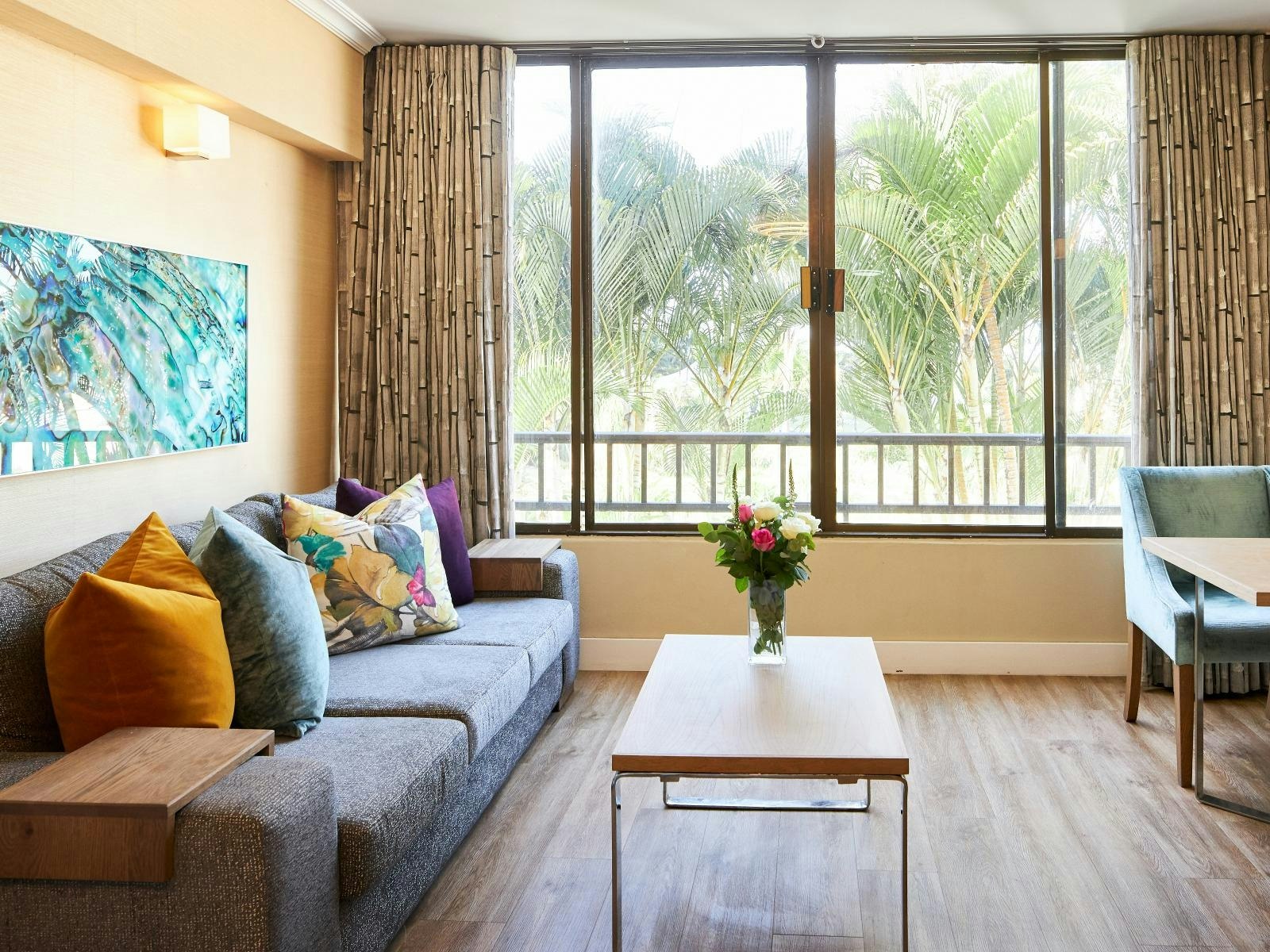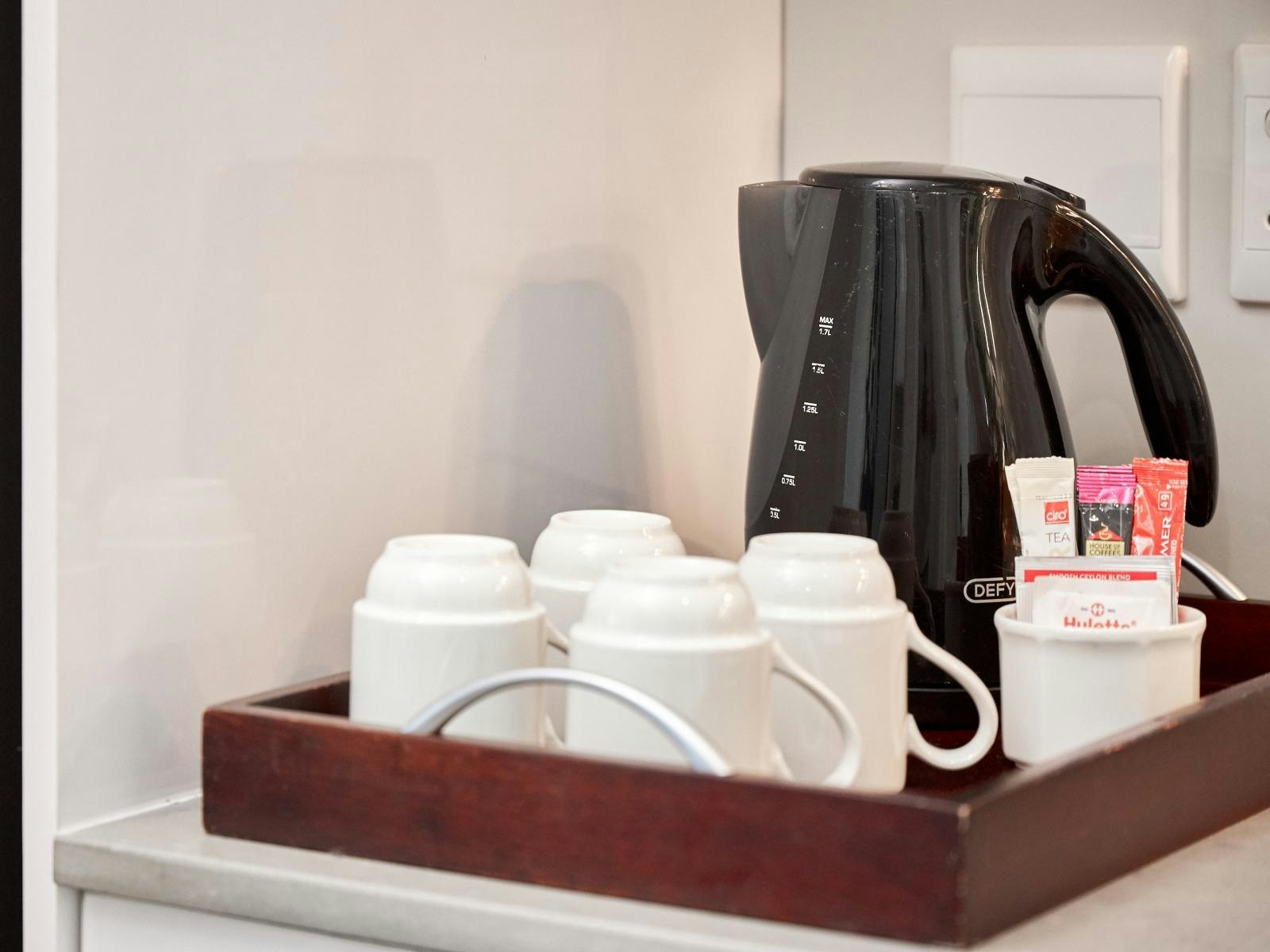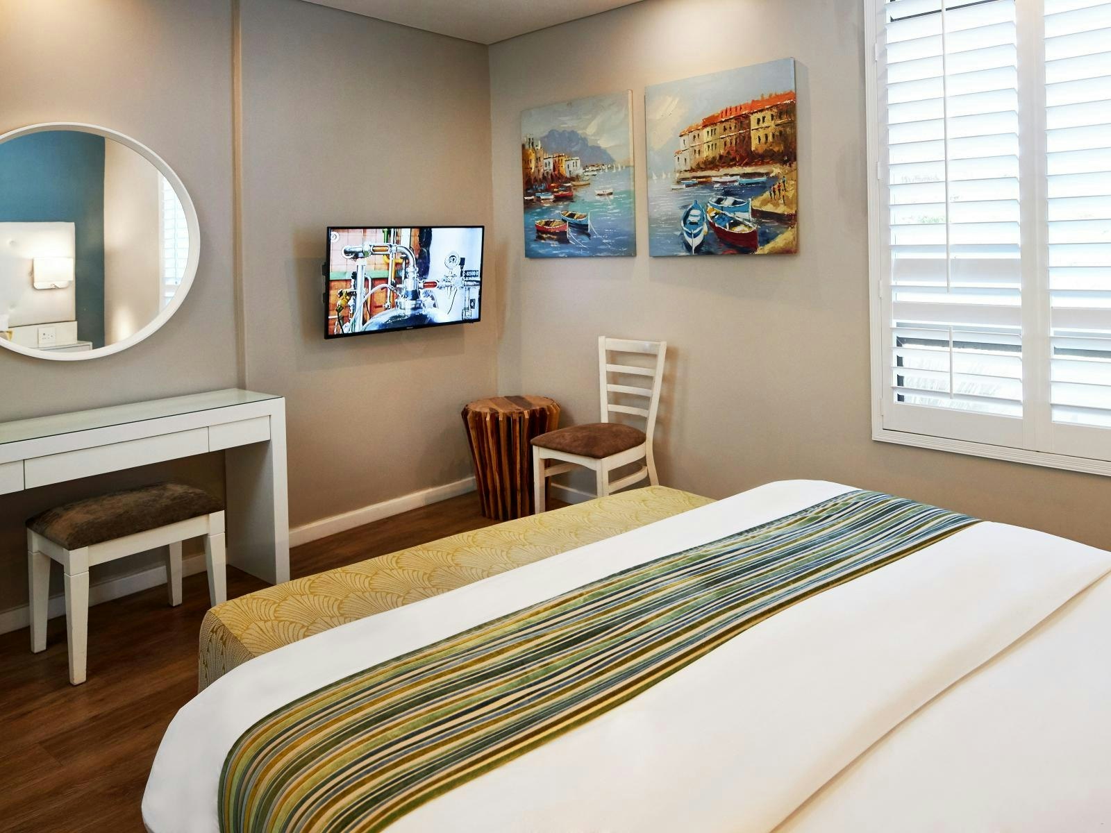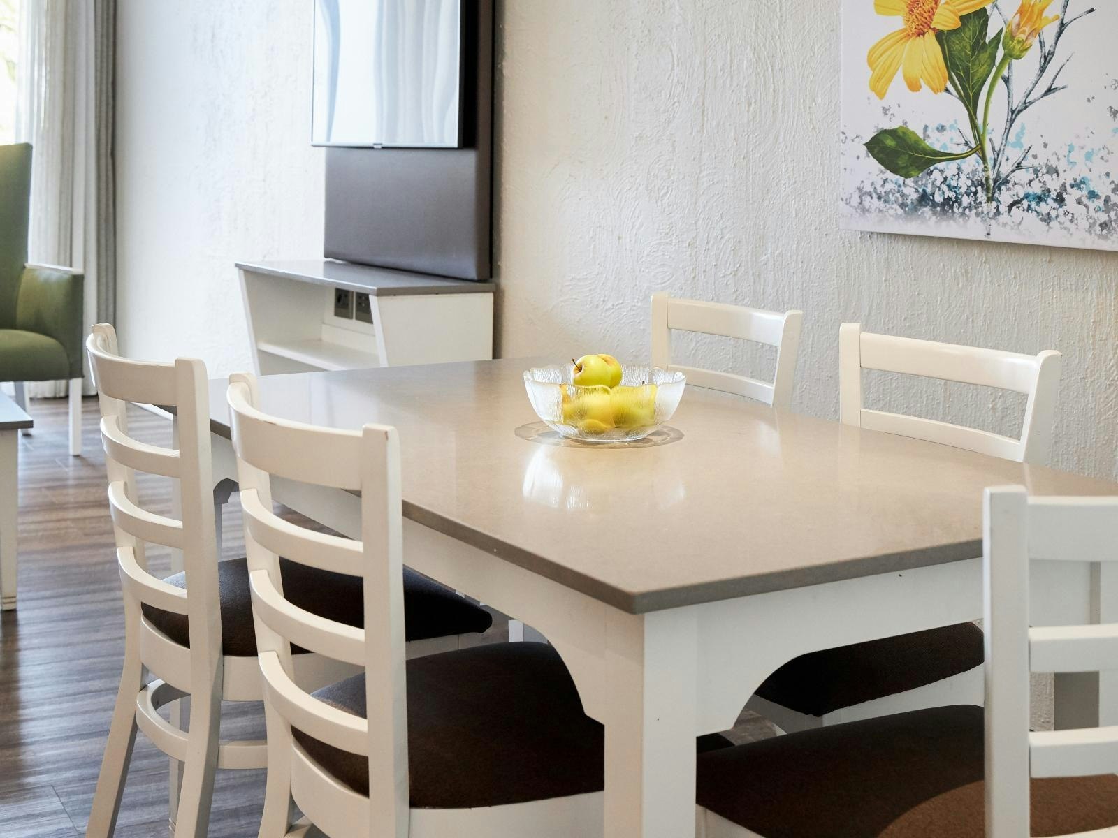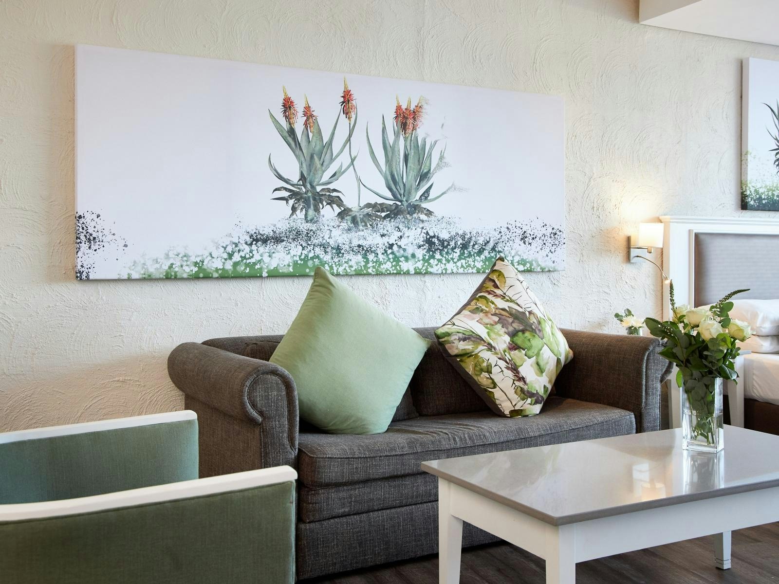 Guests are immediately struck by the futuristic horseshoe design of the resort, which overlooks an attractive swimming pool and offers panoramic views of the garden and coastal area. Self-catering accommodation is offered in open-plan studio apartments and 2-bedroom family apartments. Each unit has its own kitchen facilities equipped with a microwave, fridge, hob, under-counter oven, electric kettle, toaster, pots, glassware, crockery, cutlery and utensils. The lounge areas feature a TV with selected DStv channels. The air-conditioned units are provided with telephones, electronic safes and hairdryers, and are serviced on a daily basis.