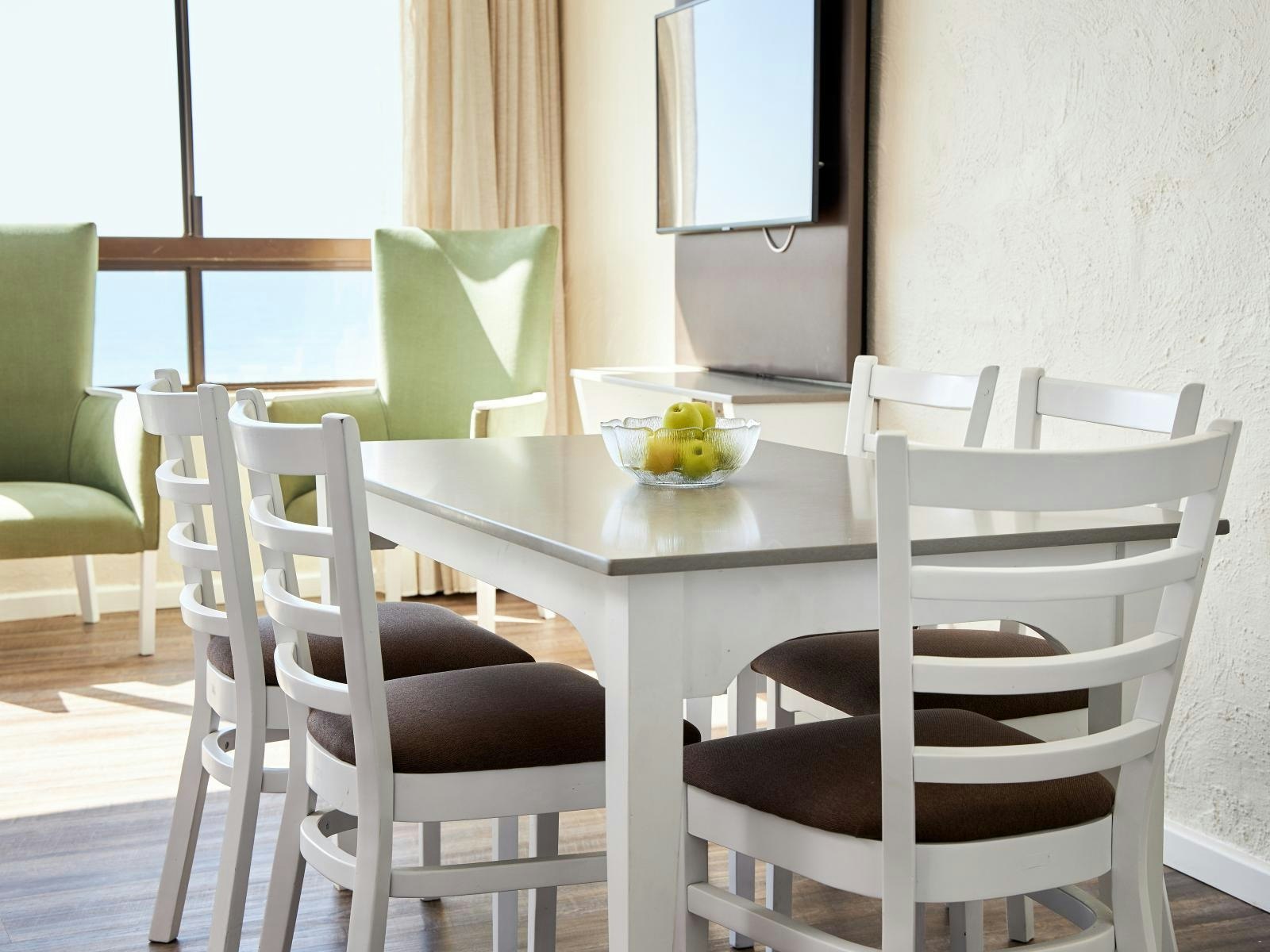 Guests are immediately struck by the futuristic horseshoe design of the resort, which overlooks an attractive swimming pool and offers panoramic views of the garden and coastal area. Self-catering accommodation is offered in open-plan studio apartments and 2-bedroom family apartments. Each unit has its own kitchen facilities equipped with a microwave, fridge, hob, under-counter oven, electric kettle, toaster, pots, glassware, crockery, cutlery and utensils. The lounge areas feature a TV with selected DStv channels. The air-conditioned units are provided with telephones, electronic safes and hairdryers, and are serviced on a daily basis.