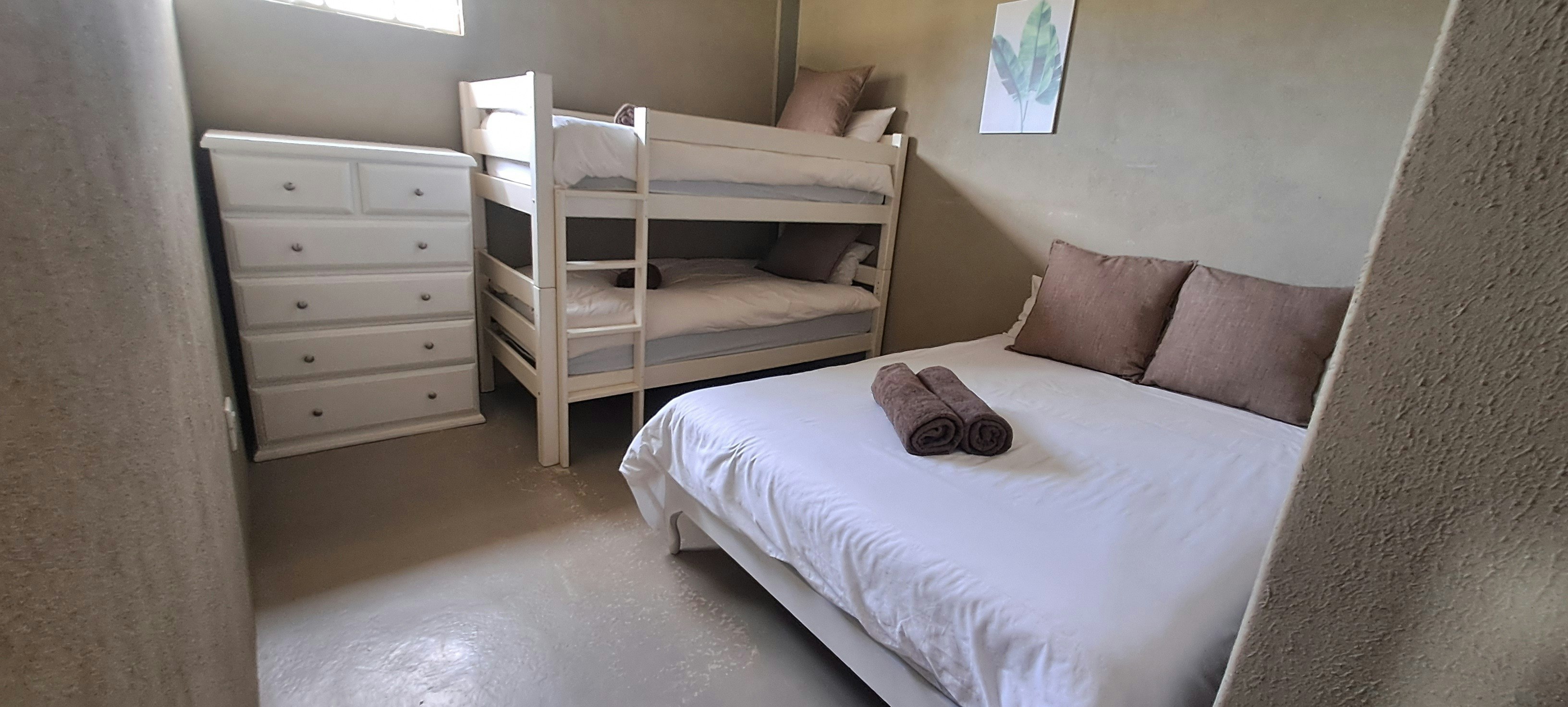 The chalet comprises 2 bedrooms: the main bedroom is furnished with a queen-size bed, and the second bedroom with a bunk bed. The shared bathroom is fitted with a shower, toilet, and basin. The open-plan living area offers a kitchen equipped with a stove, oven, kettle, cutlery, crockery, utensils, microwave, and a fridge-freezer. The lounge is furnished with comfortable seating, a TV with streaming options, DStv, a 6-seater dining table, and walks out onto a porch with outdoor furniture and braai facilities.