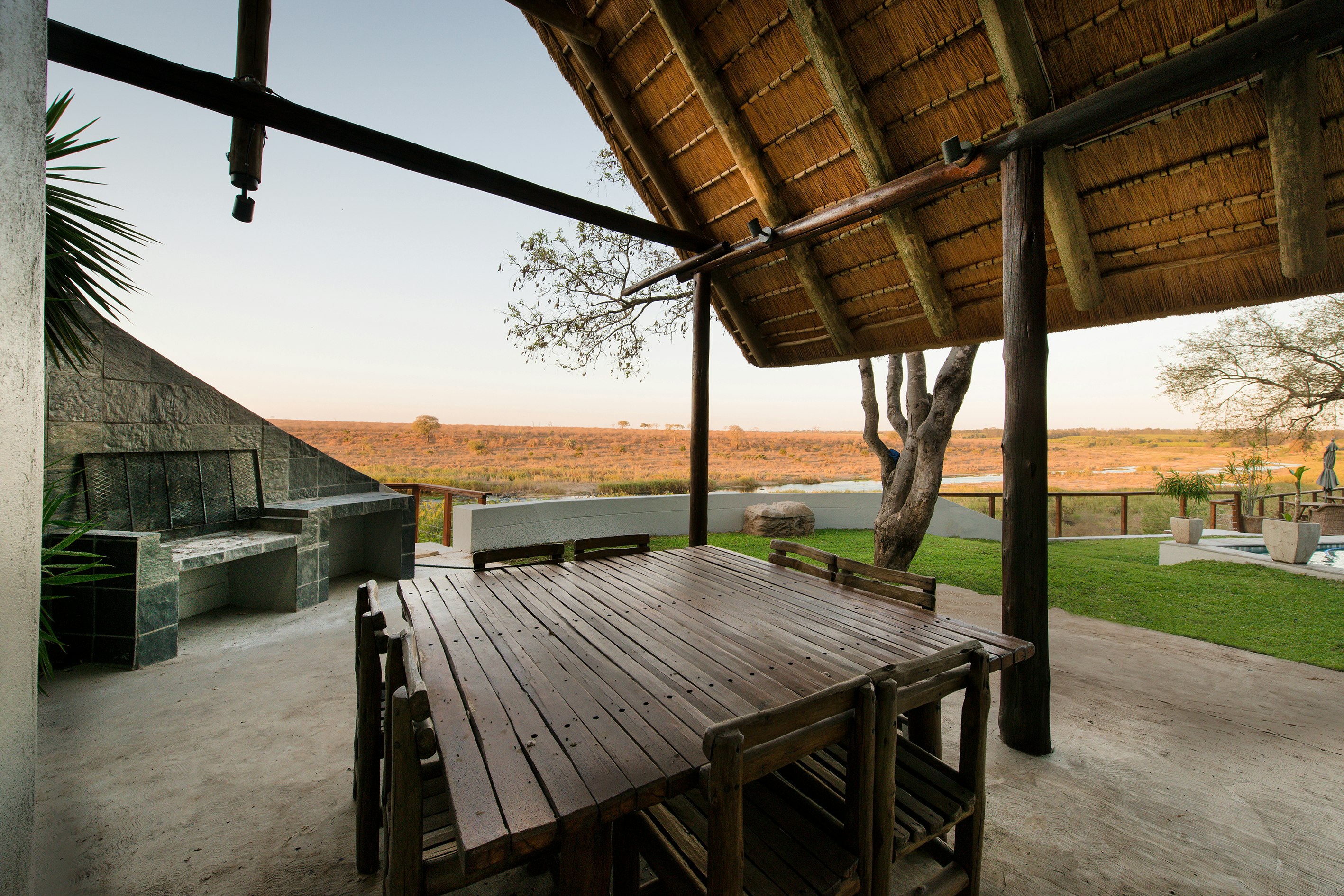 Hierdie grasdakgebou het hoë plafonne en beslaan sowat 5 hektaar se tuine en bosveld. Dit bied 'n pragtige uitsig en is net 'n paar meter vanaf die wêreldbekende Krugerwildtuin.