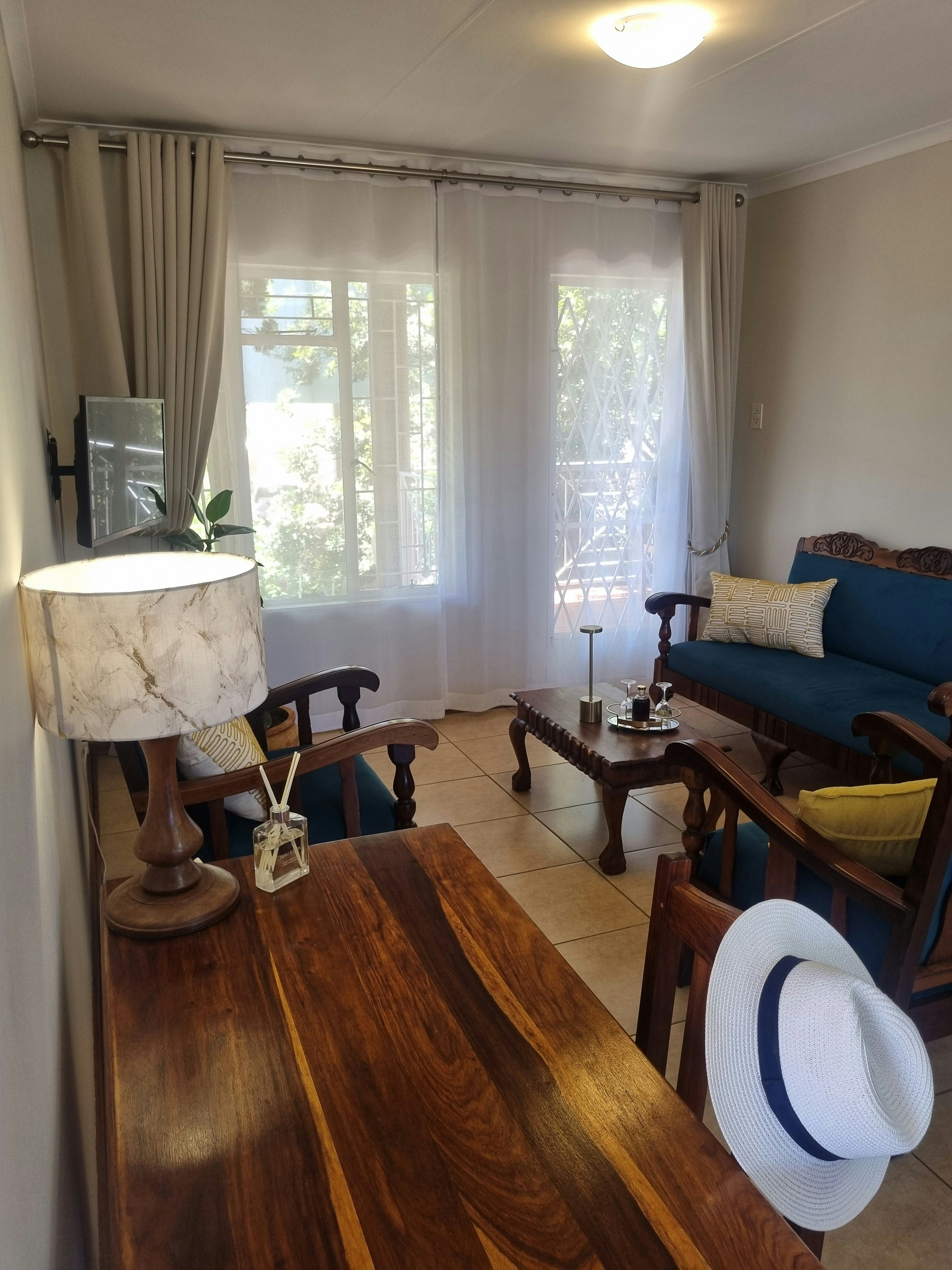 Die leefarea beskik oor 'n toegewyde werkstasie en 'n sitkamer met 'n slim-TV en gemaklike sitplek. Die kombuis sluit 'n ontbyttoonbank in en is volledig toegerus met 'n yskas-vrieskas, stoof, oond, ketel, lugbraaier, broodrooster en mikrogolfoond. 'n Wasmasjien word ook voorsien vir ekstra gerief.