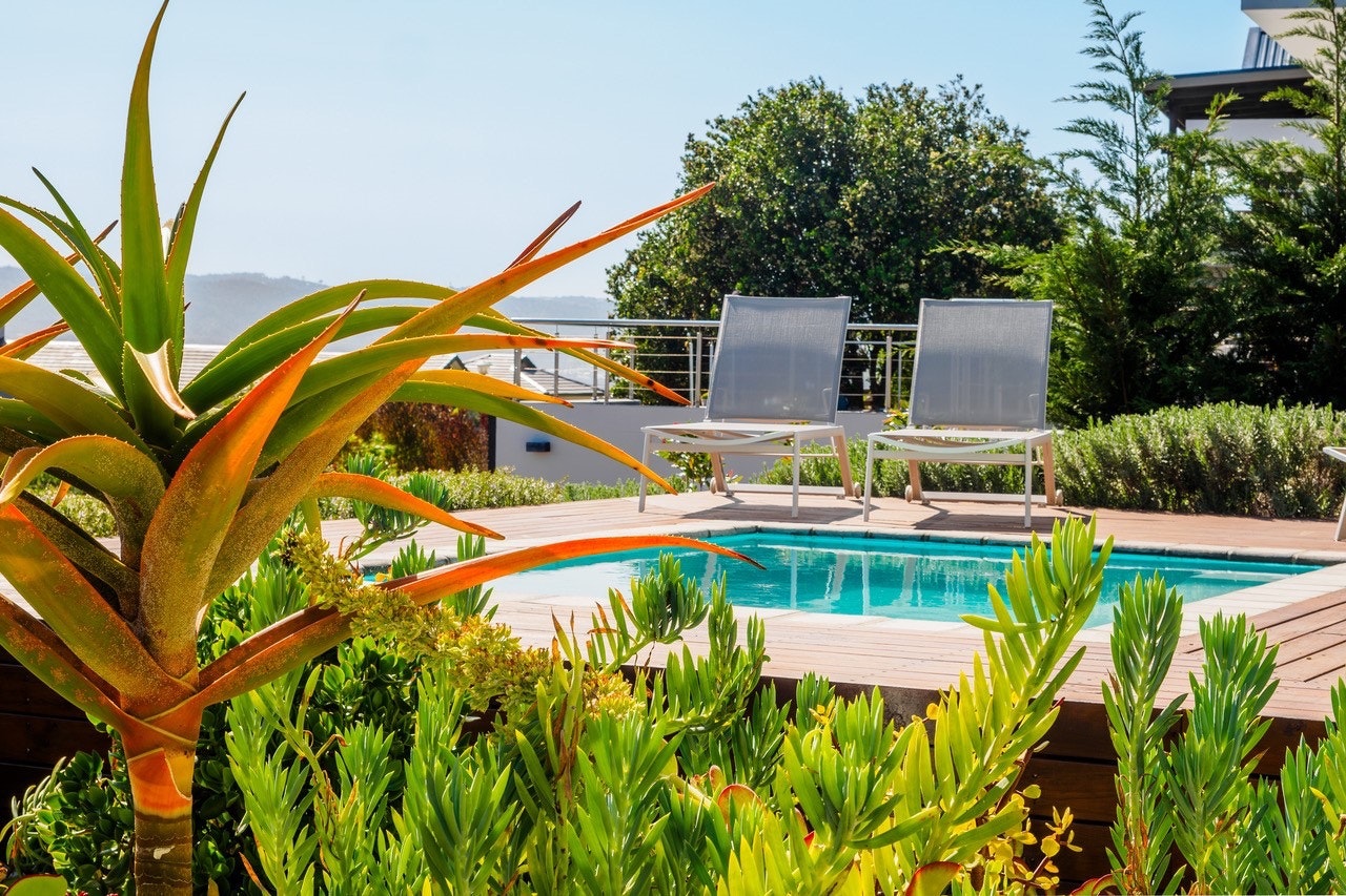 Gaste het toegang tot 'n lieflike tuin en 'n swembad met sonstoele.