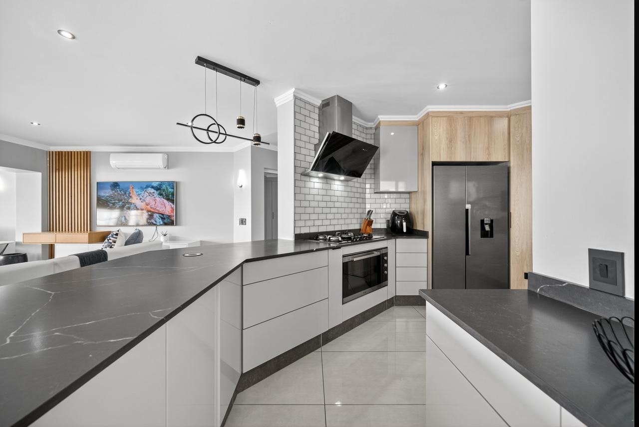 The open-plan living area features a comfortable lounge with a Smart TV and a well-equipped kitchen with a breakfast bar. The kitchen includes a double-door fridge-freezer, stove, oven, microwave, kettle, toaster, Nespresso coffee machine, and dishwasher. A washing machine is also available for guests’ use.