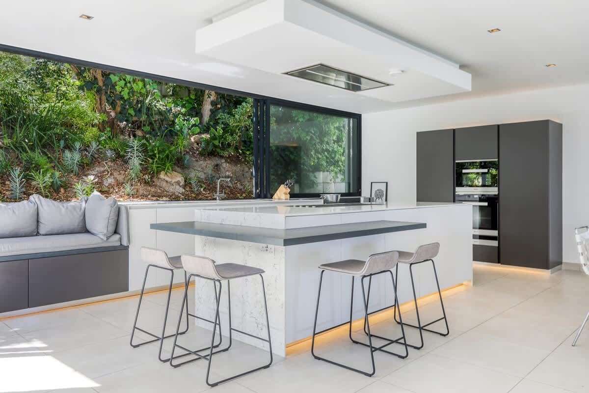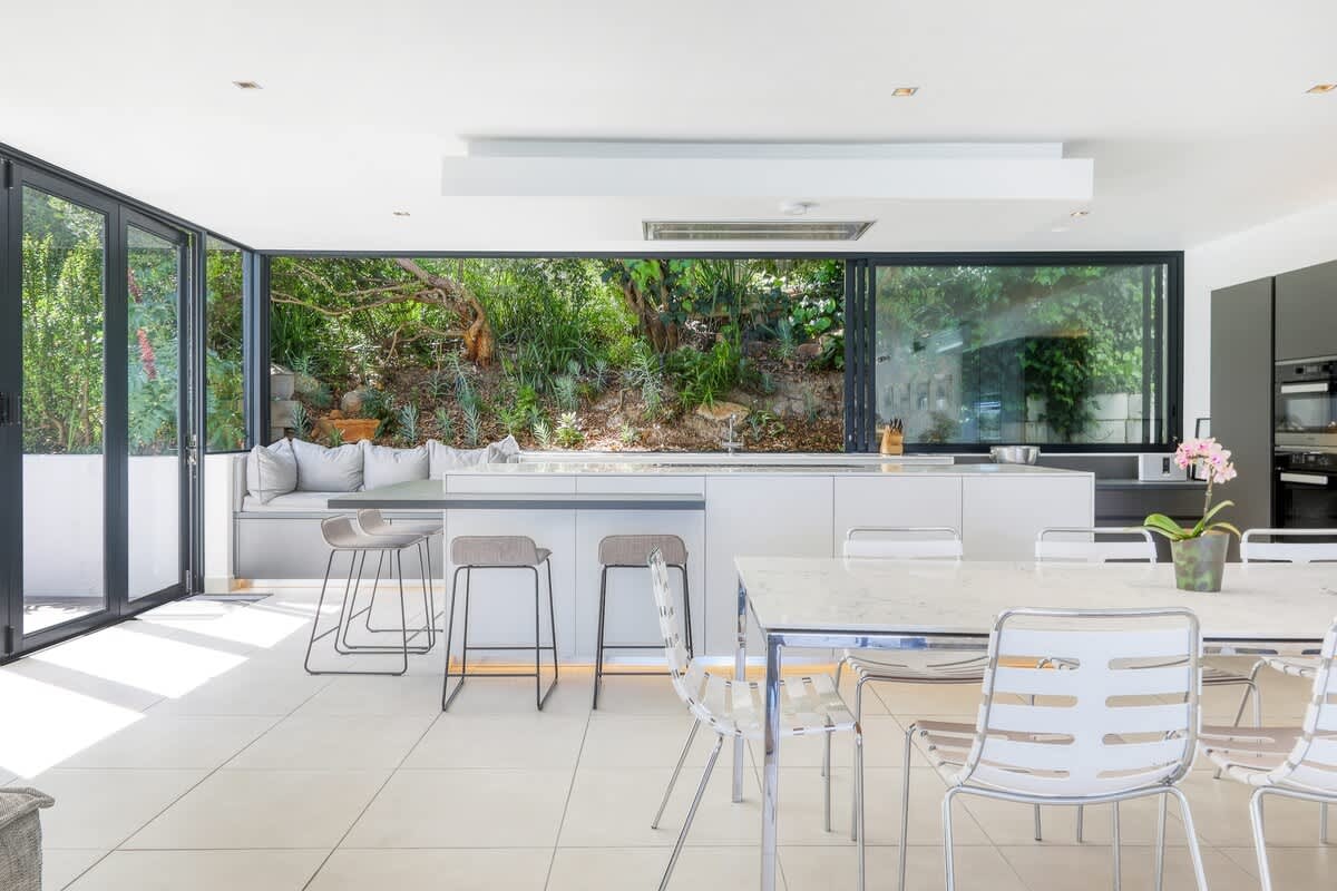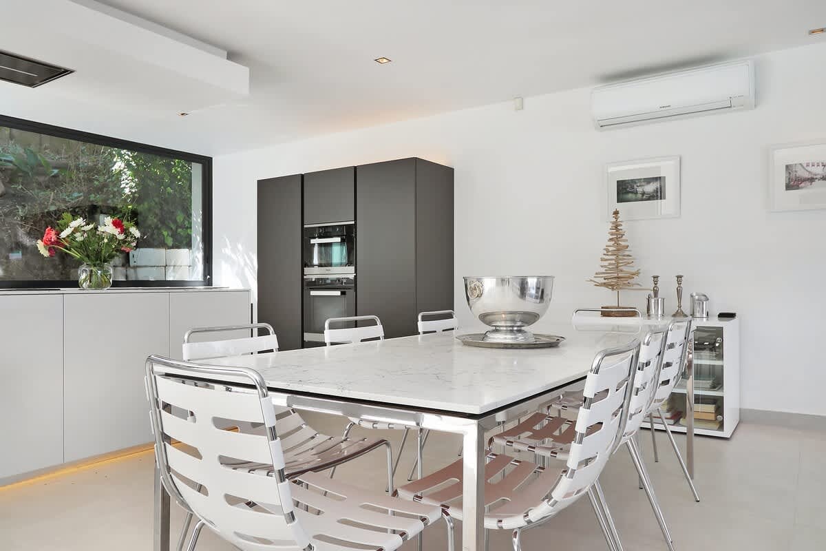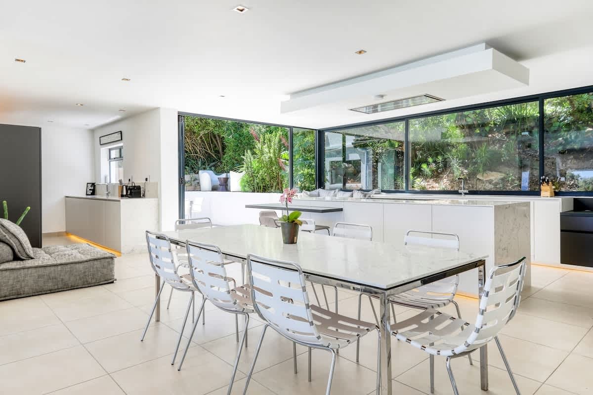 Die villa is deurgaans versier in 'n elegante, kontemporêre styl en is oor 2 vlakke verdeel. By die binnekoms word gaste verwelkom in die oopplan-sitkamer, eetkamer en kombuisarea. Die kombuis is volledig toegerus vir selfsorg en sluit 'n stoof, oond, yskas-vrieskas, mikrogolfoond, eetgerei en breekware in. Die leefarea beskik oor 'n eetkamertafel, gemaklike sitplek en 'n TV.