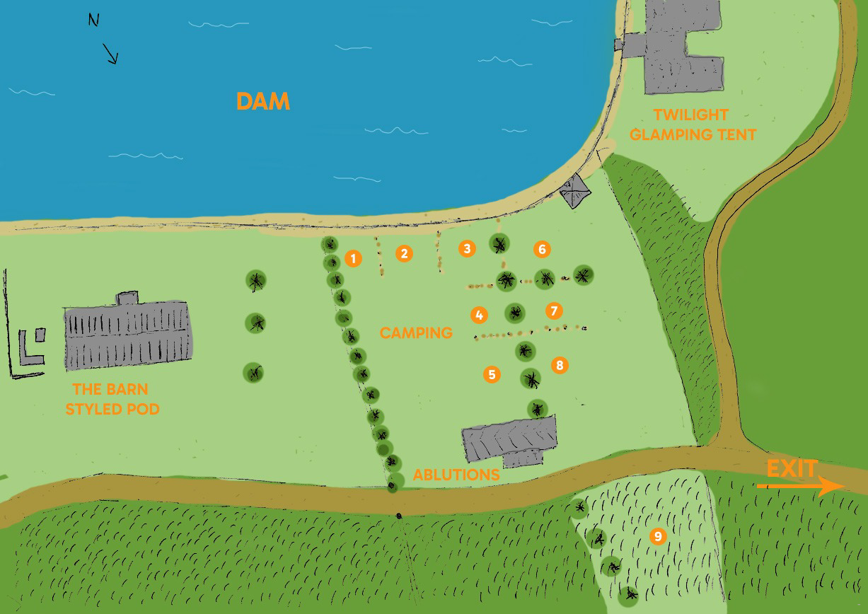 Accommodation is available in 9 campsites, each able to accommodate up to 4 guests. All campers have access to well-maintained ablution facilities, which are thoughtfully divided into male and female sections. Each section is equipped with 2 modern showers and 2 clean toilets, ensuring guests enjoy convenient, private, and comfortable amenities during their stay.