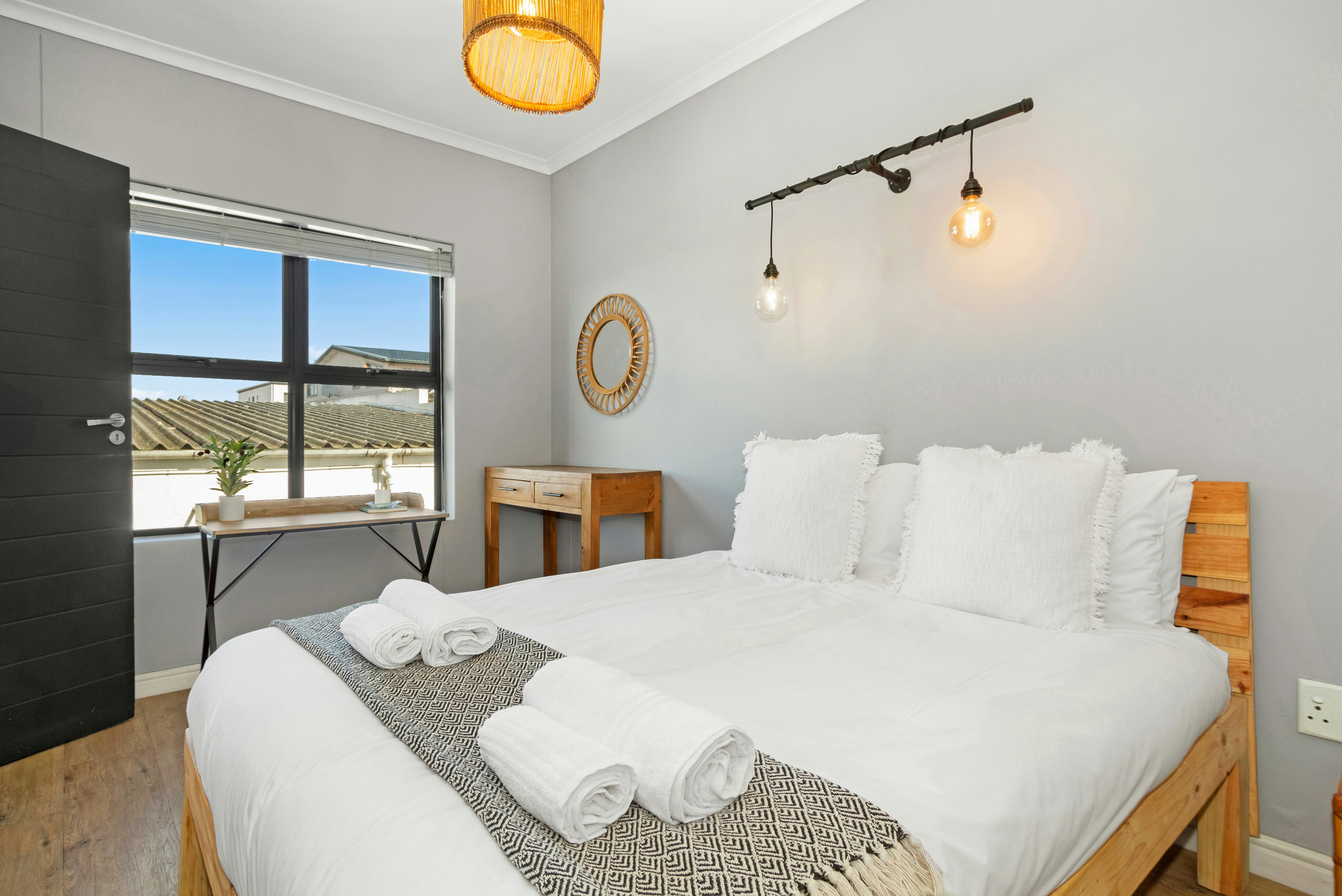 This bohemian-themed apartment can accommodate 4 guests at a time and comprises 2 bedrooms and 2 bathrooms. The main bedroom is furnished with a queen-size bed and features an en-suite bathroom fitted with a shower. The second bedroom contains 2 single beds and makes use of the second bathroom which is also fitted with a shower. Crisp white linen and bath towels are provided.