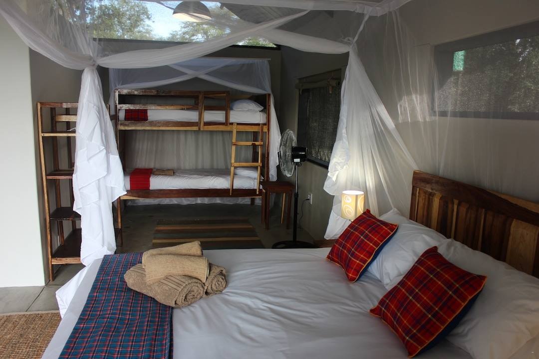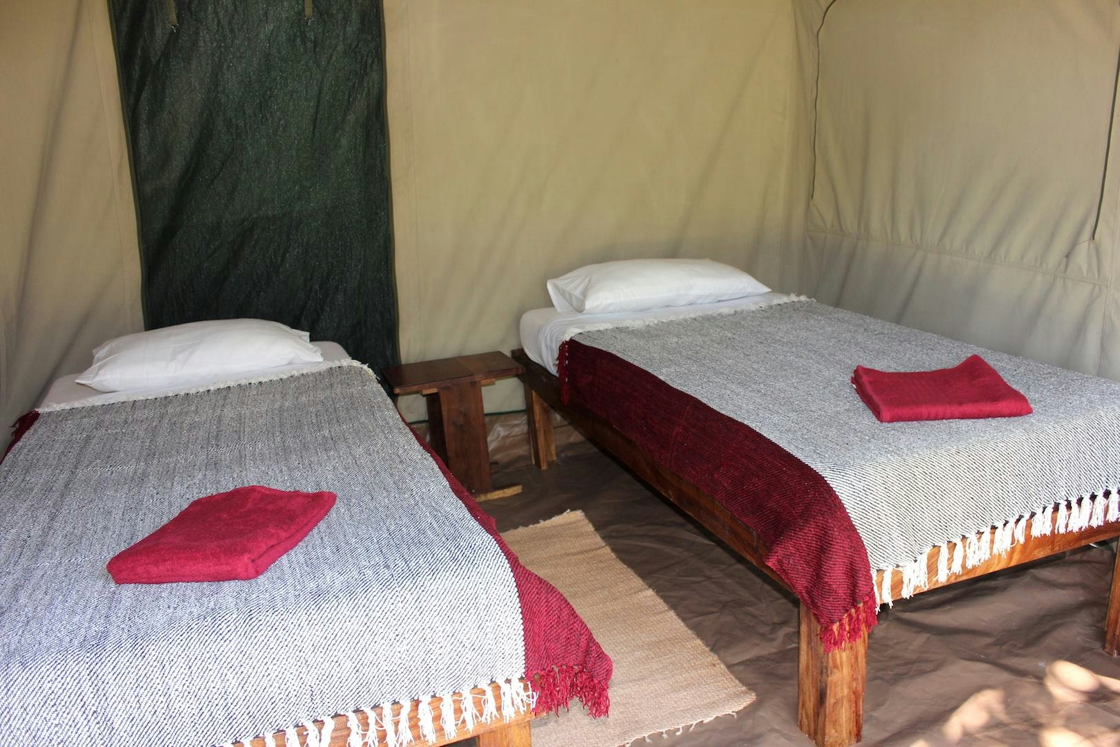 The chalets and luxury tents have been fitted out with bed linen, mosquito nets, fans and lamps. There is electrical power in these rooms. The luxury tents have shared use of a separate communal kitchen with a fridge, gas burner, pots, pans, crockery, cutlery, a table and benches and braai. Only the chalets have their own fridges and tea- and coffee-making facilities, and 4 of the chalets have an outside kitchenette with a gas burner, pots, pans, cutlery, crockery, table, chairs and a braai.