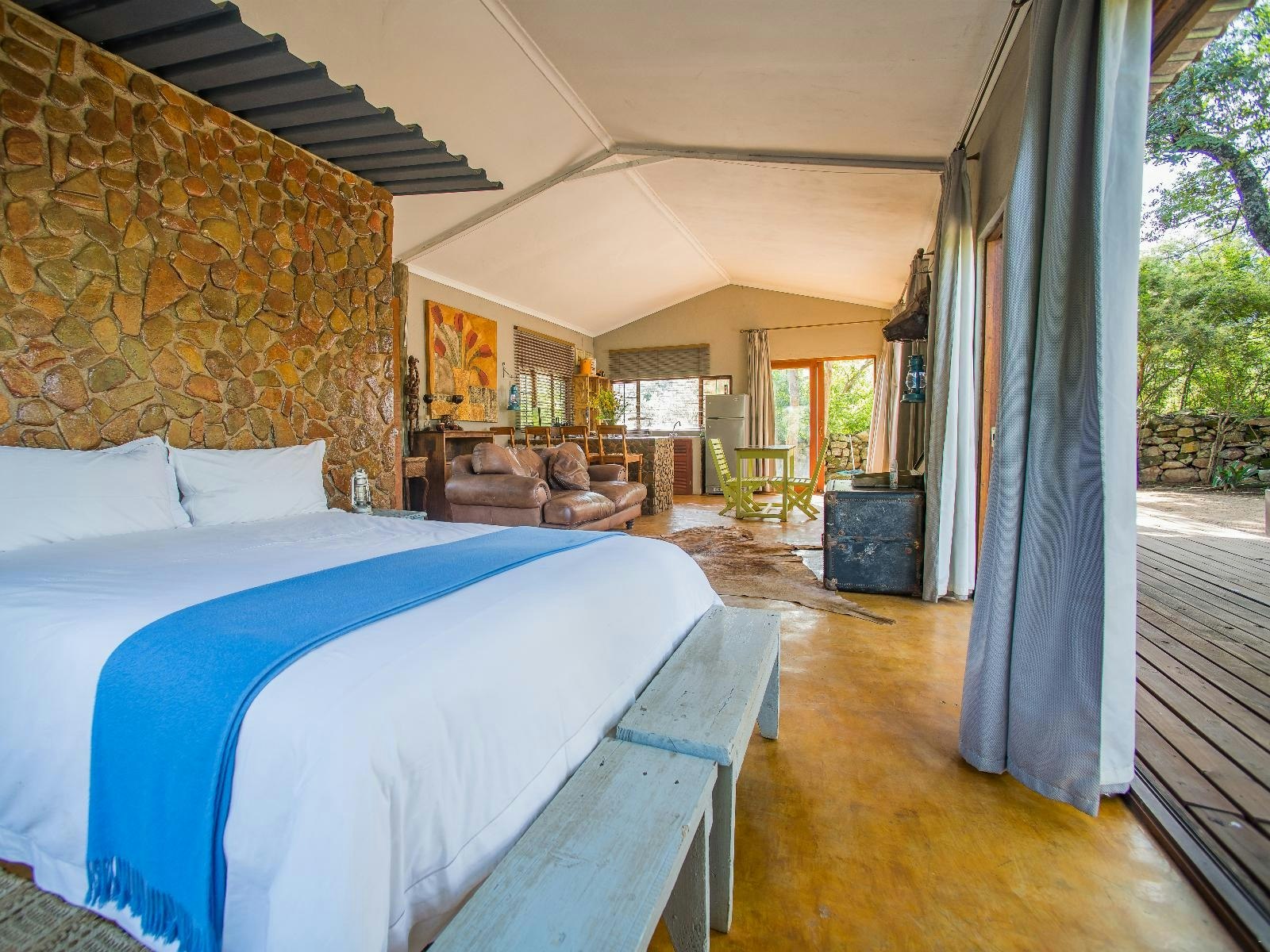 The lodge offers various options of luxury accommodation, each with its own special features aimed at lovers of nature and wildlife. Fig Tree Lodge and Magtree Lodge are bush cottages for couples lit by gas and lamplight, with full self-catering facilities, while Kudu and Nyala Cottages are two-bedroom cottages, each with electricity and all amenities for self-catering.