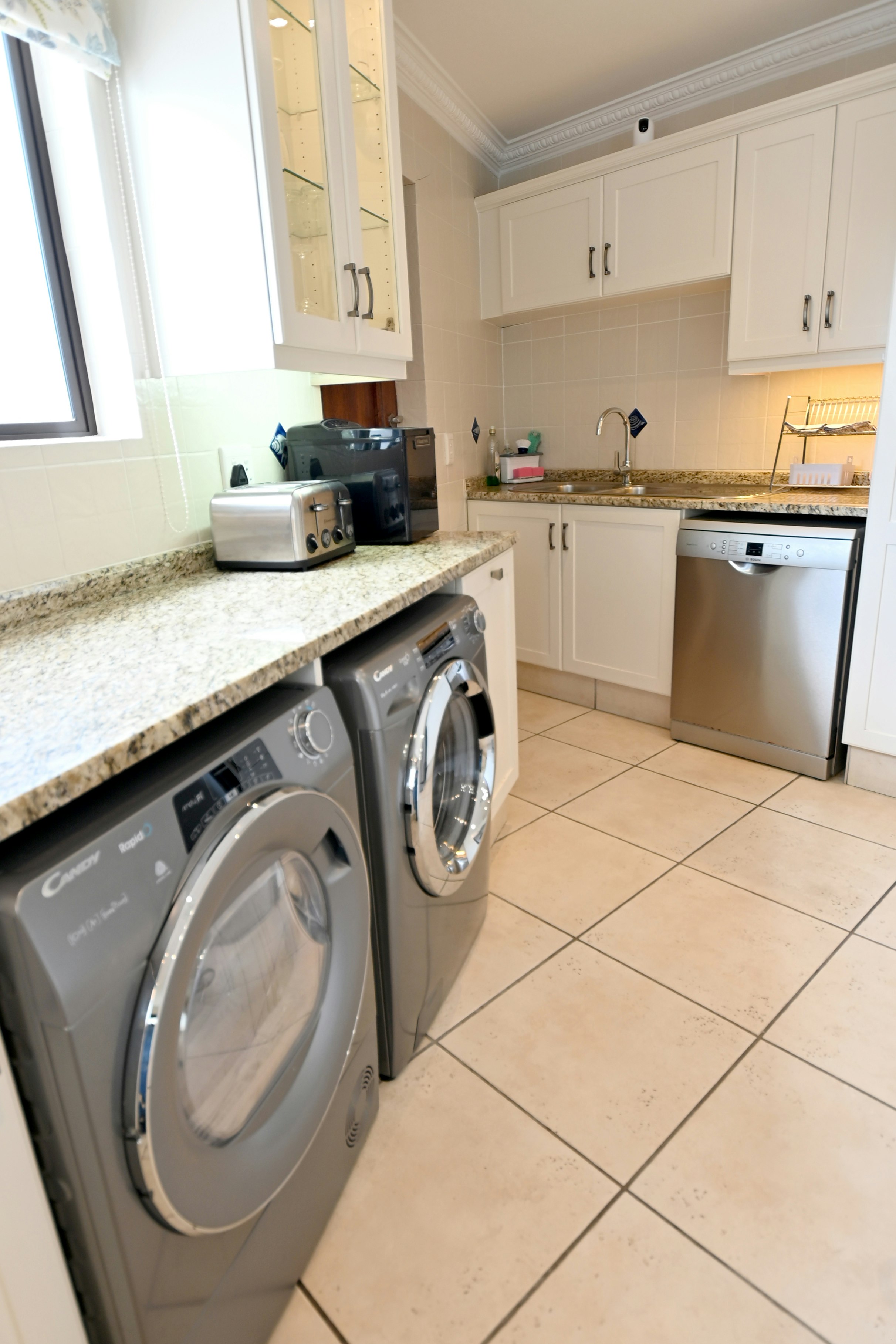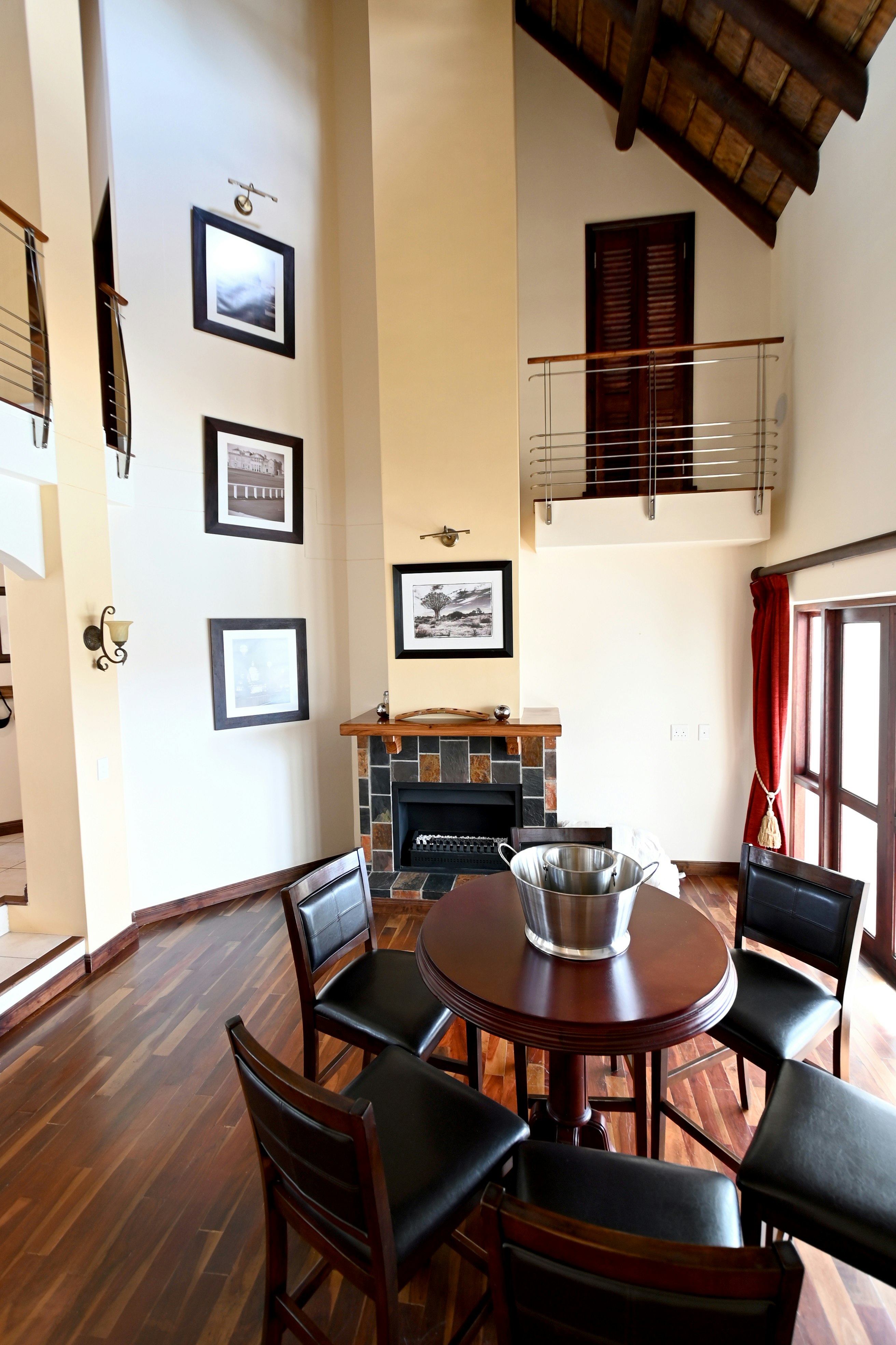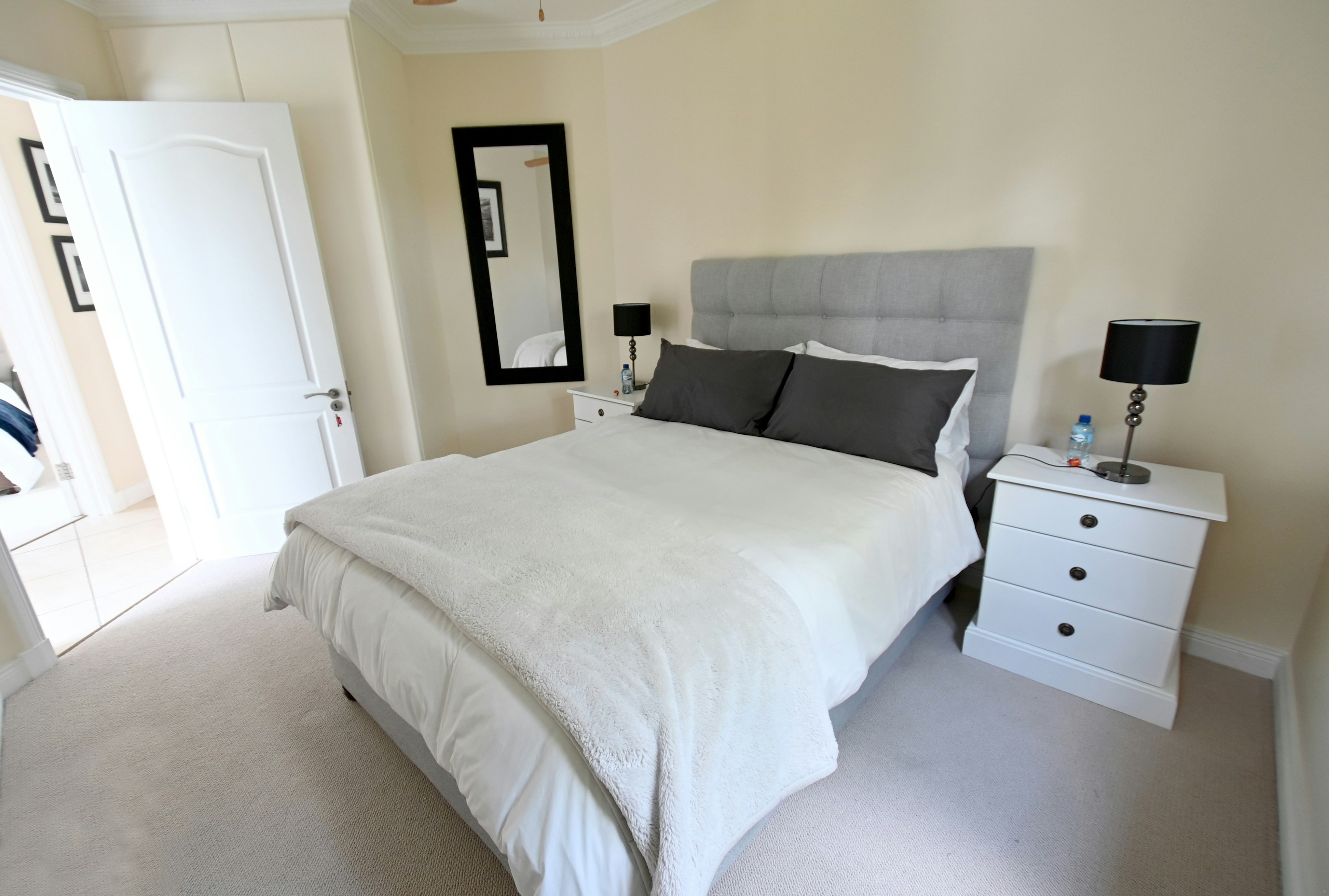 The open-plan living space features 2 lounge areas furnished with comfortable seating, a TV, a dining table, and a kitchen. The kitchen is fully equipped with a fridge-freezer, stove, oven, microwave, dishwasher, washing machine, tumble dryer, and coffee- and tea-making facilities. Additionally, guests can dine in a separate extended room offering a warm fireplace and access to the garden. Outside, a verandah with braai facilities invites guests to enjoy outdoor dining, or guests can take a dip in the refreshing swimming pool on warmer days. Secure parking is conveniently available on-site.