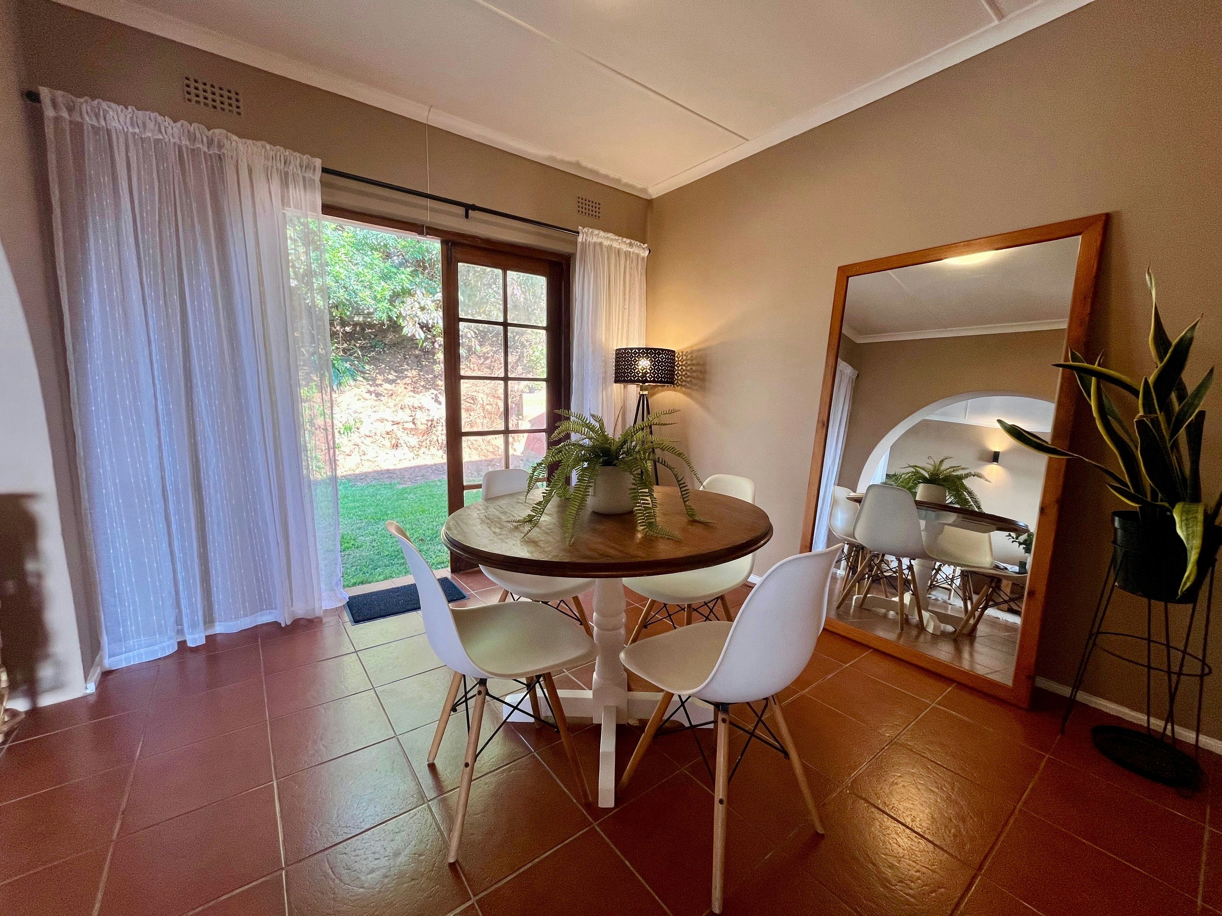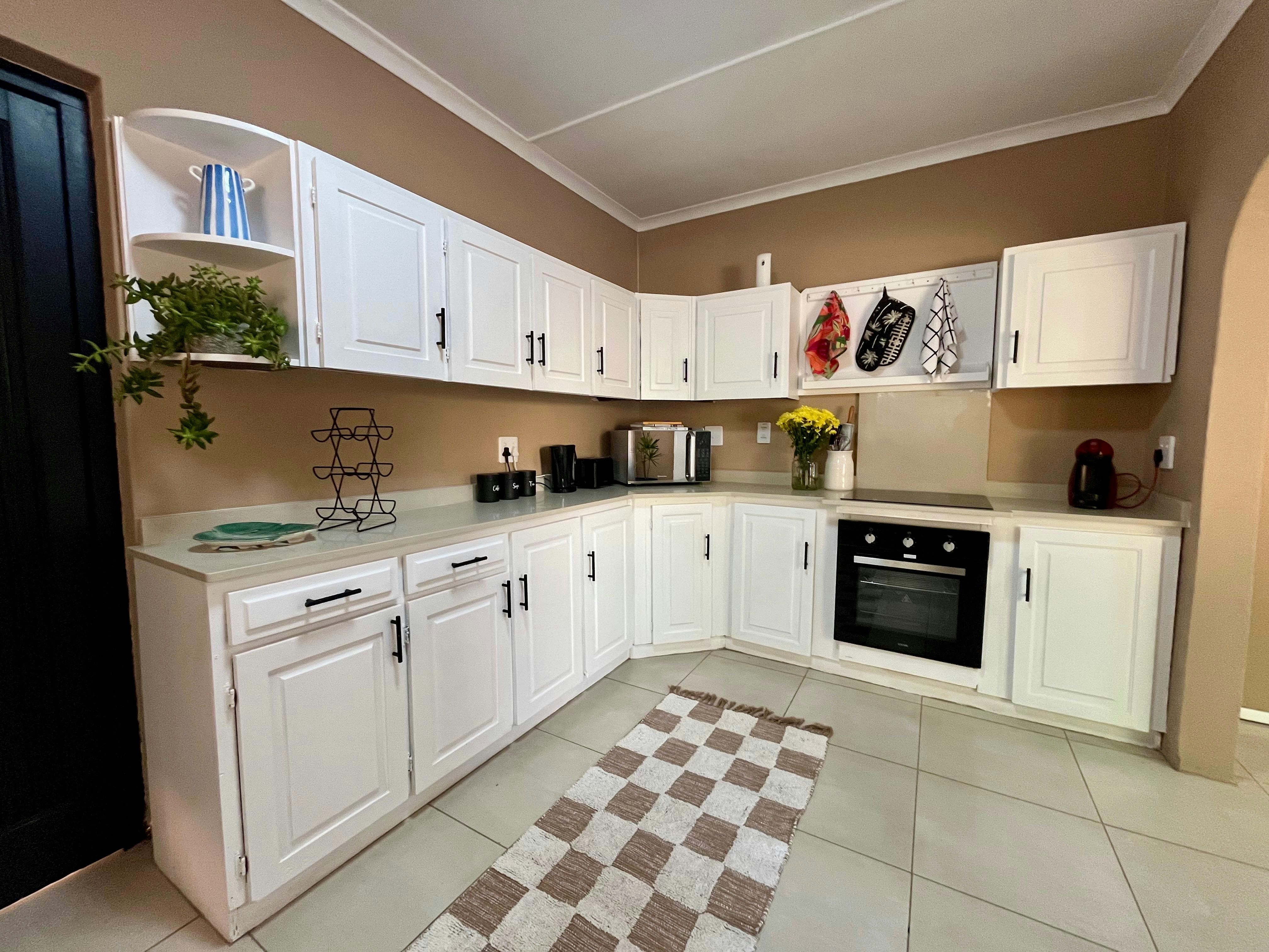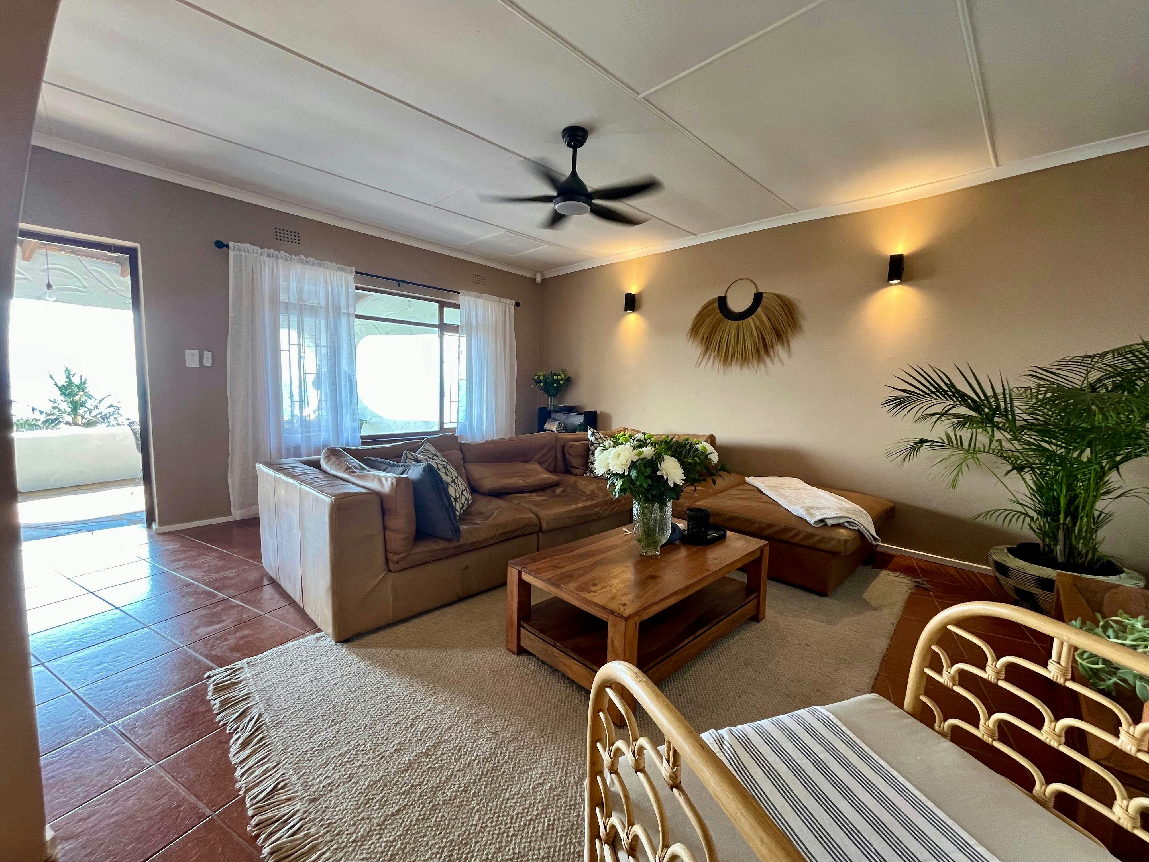 The kitchen is fully equipped with a stove, oven, microwave, cutlery, crockery, utensils, kettle, toaster, fridge-freezer, and a coffee machine. The kitchen flows to the lounge area, furnished with comfortable seating, a TV with streaming options, and Wi-Fi for your entertainment, and walks out onto a patio with outdoor furniture and an ocean view. The lounge leads to the dining area that offers a 4-seater dining table and walks out into the garden.