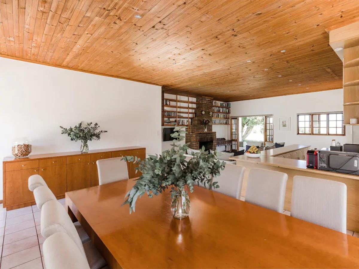 The open-plan living area features a kitchen fully equipped with a gas stove, electric oven, microwave, fridge-freezer, cutlery and crockery as well as a Nespresso machine. Leading from the kitchen is a cosy lounge with comfy ample seating, a fireplace and a TV with DStv. Complimentary Wi-Fi is available. Adjacent to the kitchen is a dining table where guests can enjoy their meals together.
