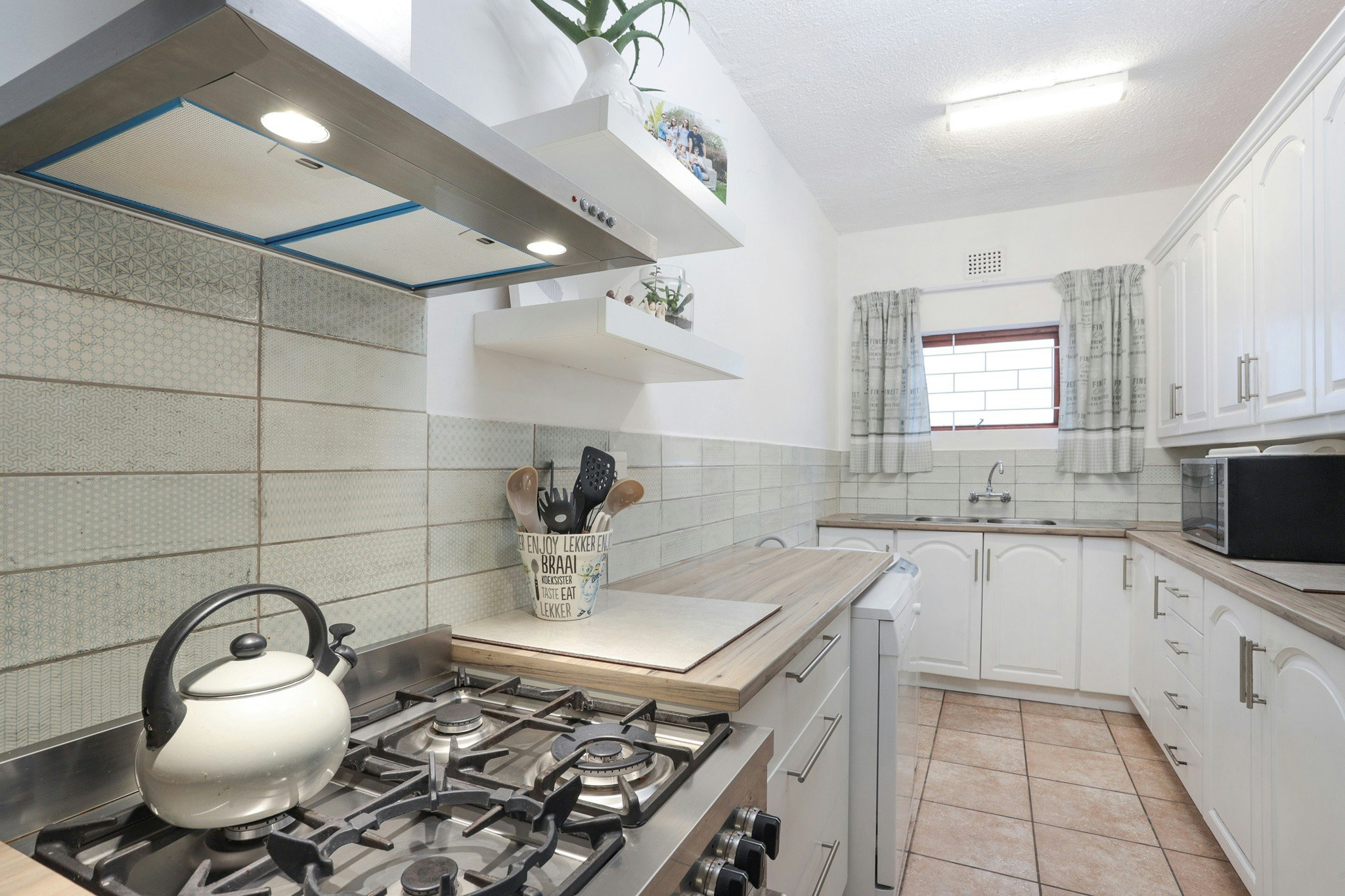 The fully equipped kitchen includes a gas stove, electric oven, microwave, fridge-freezer, cutlery, crockery, tea- and coffee-making facilities, and a breakfast bar. For added convenience, a dishwasher and washing machine are also available.