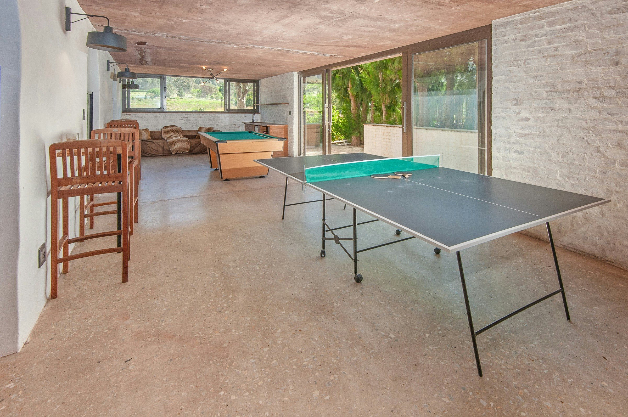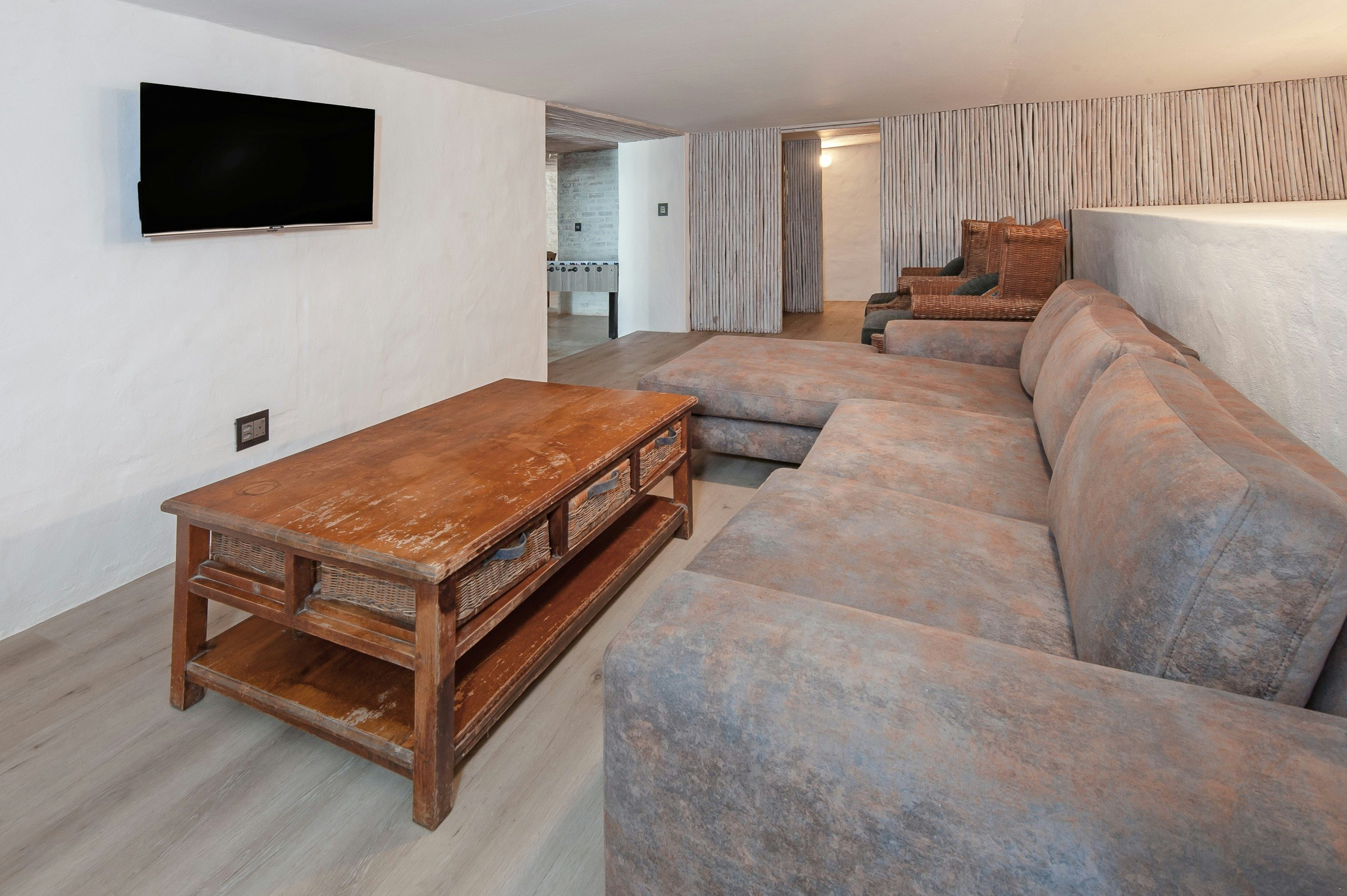 The open-plan living area includes a fully equipped kitchen with a fridge, stove, microwave, oven, coffee machine, cutlery, and crockery, as well as a central breakfast bar. Adjacent to the kitchen is a dining area and a living room with a fireplace, perfect for intimate evenings spent with friends and family. The home boasts a variety of entertainment spaces. The basement features a TV room with a 65-inch TV and a fireplace. In addition, guests are spoiled for choice with a game room offering a pool table, table tennis, and foosball, as well as a dedicated kids' TV room complete with its own shower and toilet.