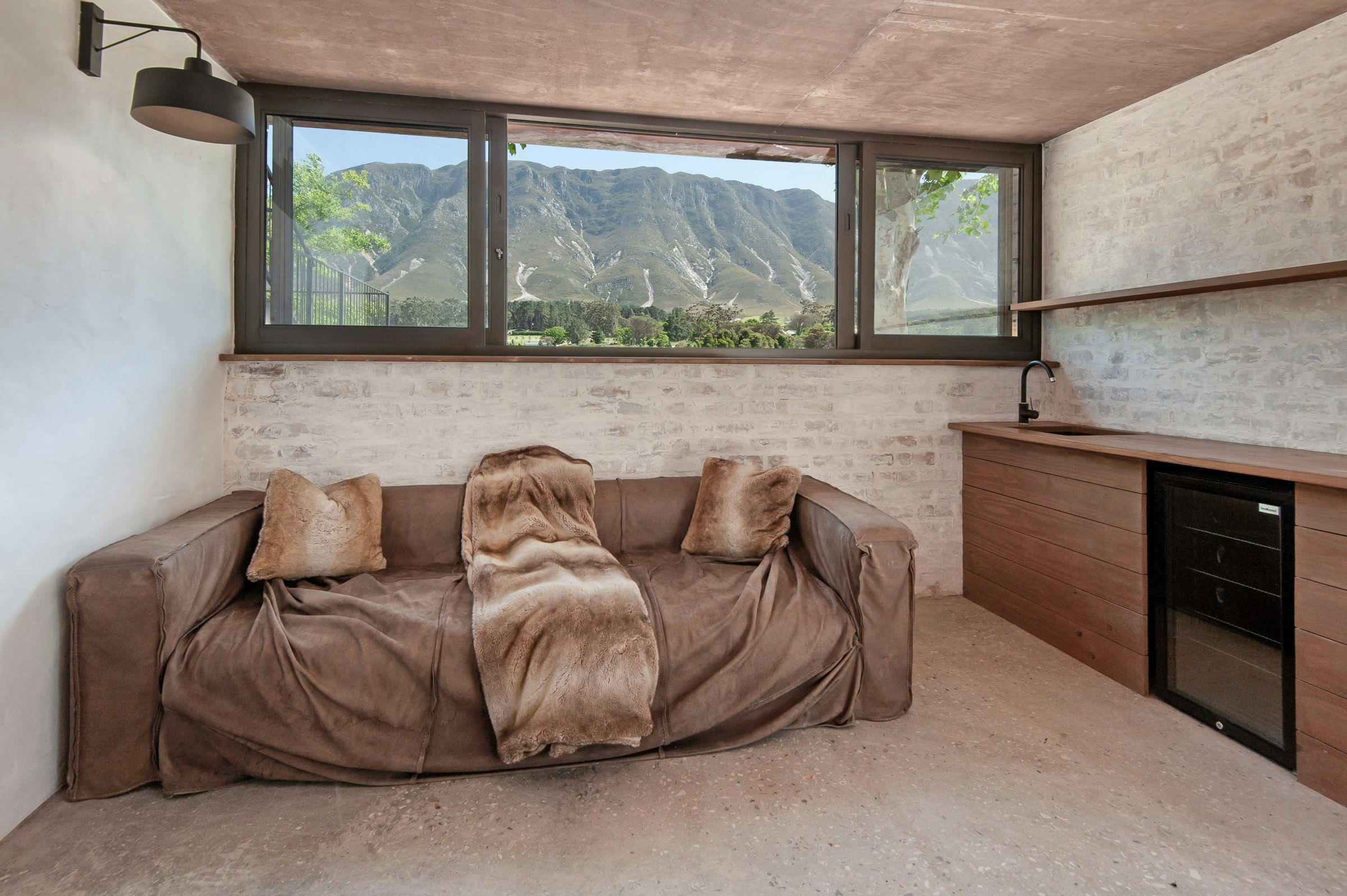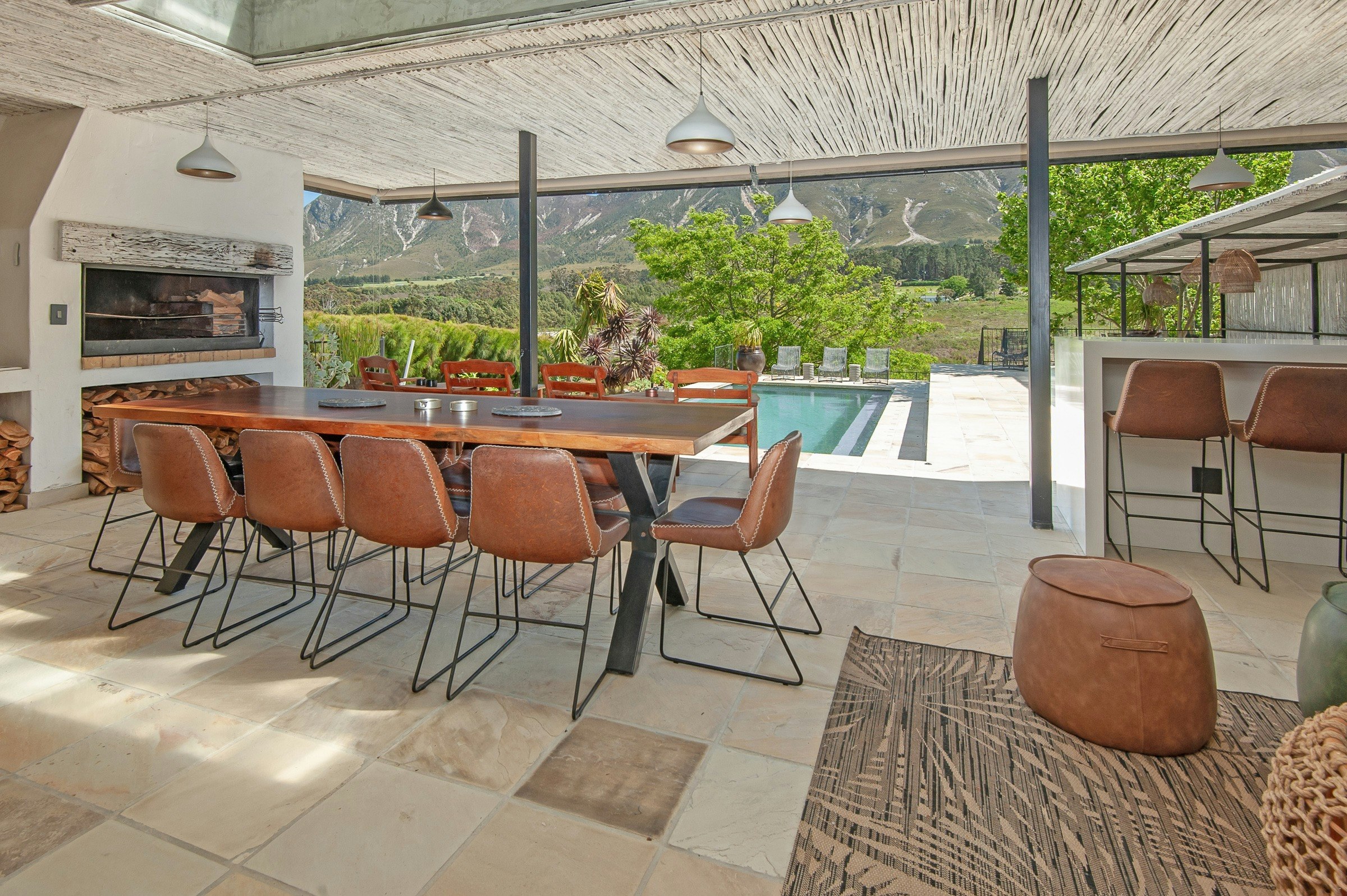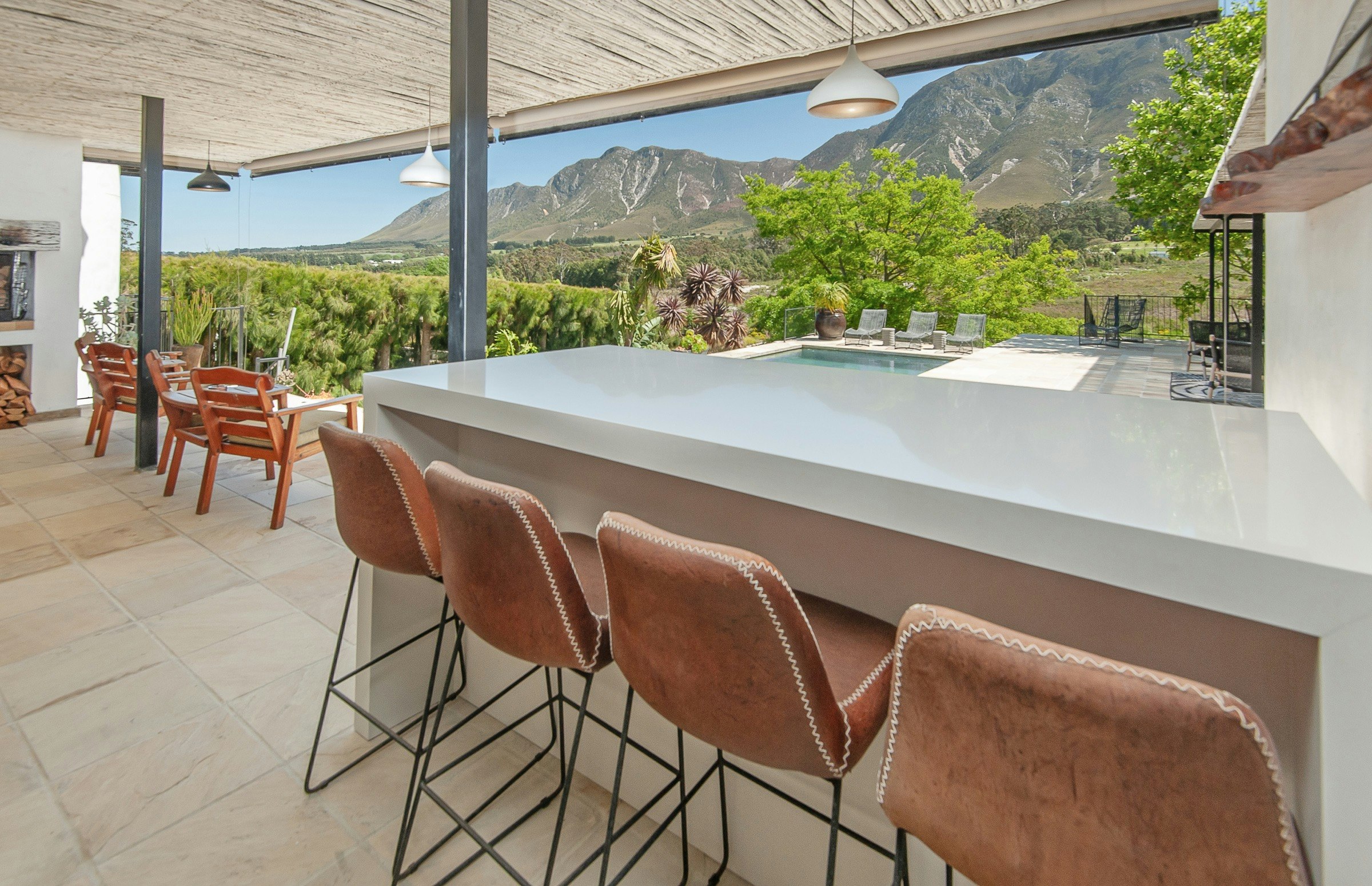 Additionally, there is an indoor bar complete with a fridge and ample seating. Outside, a furnished patio features a braai area, pizza oven, and fully equipped bar overlooking the swimming pool. Guests can also relax on the deck while enjoying views of the surrounding landscape.