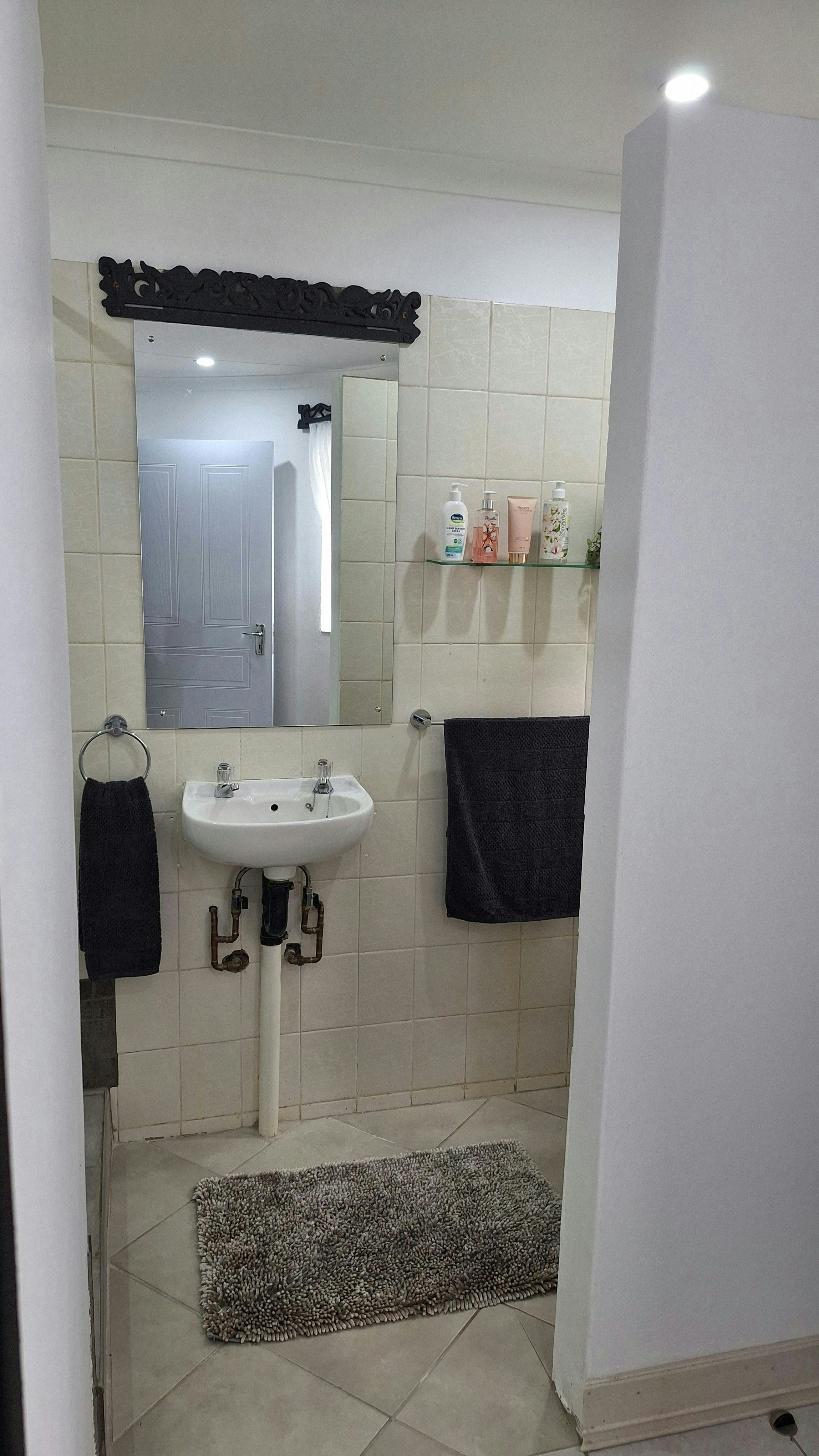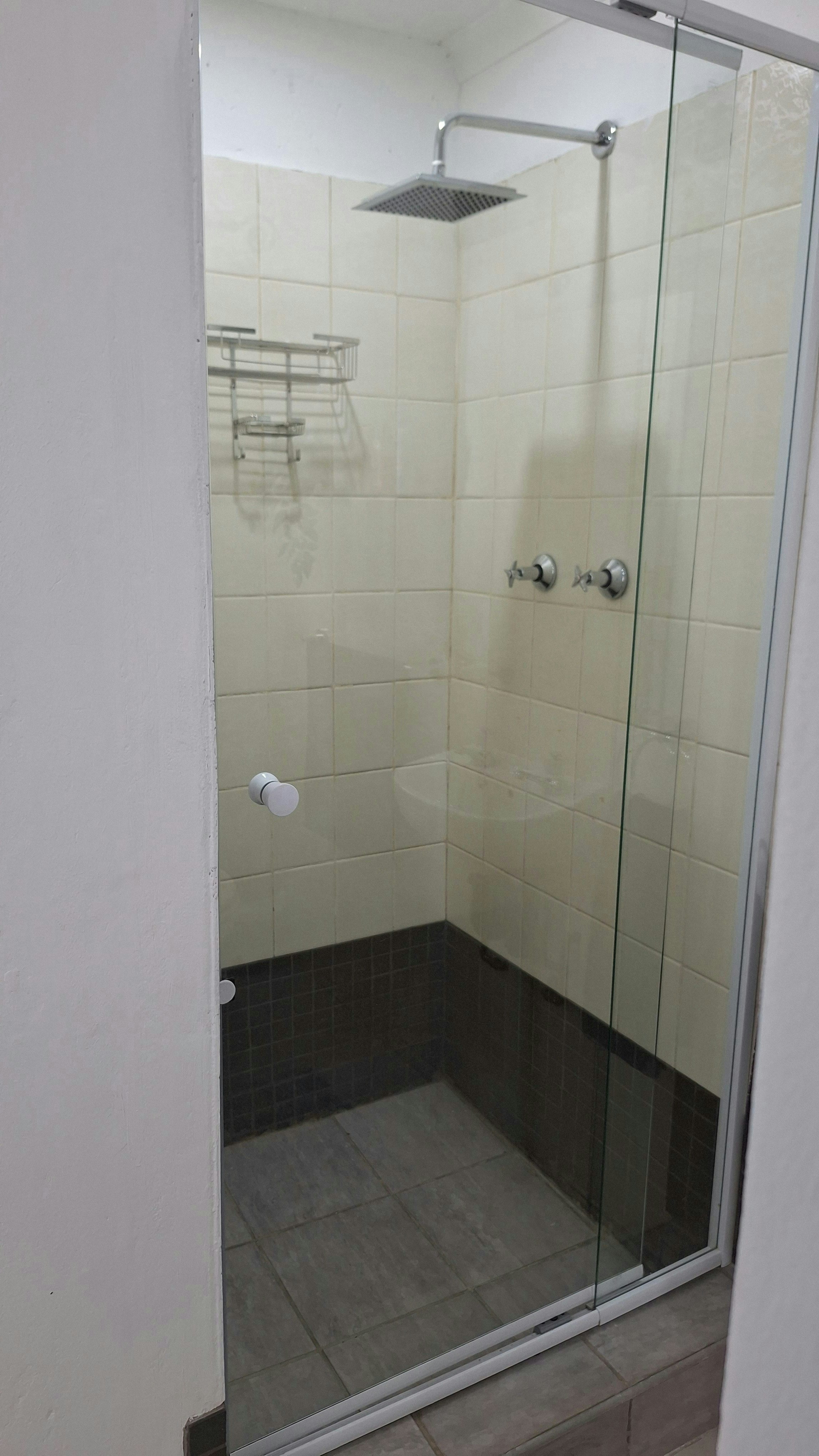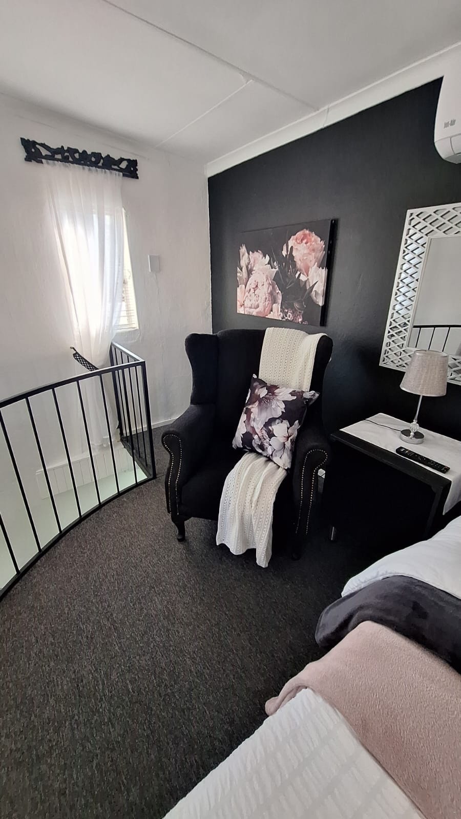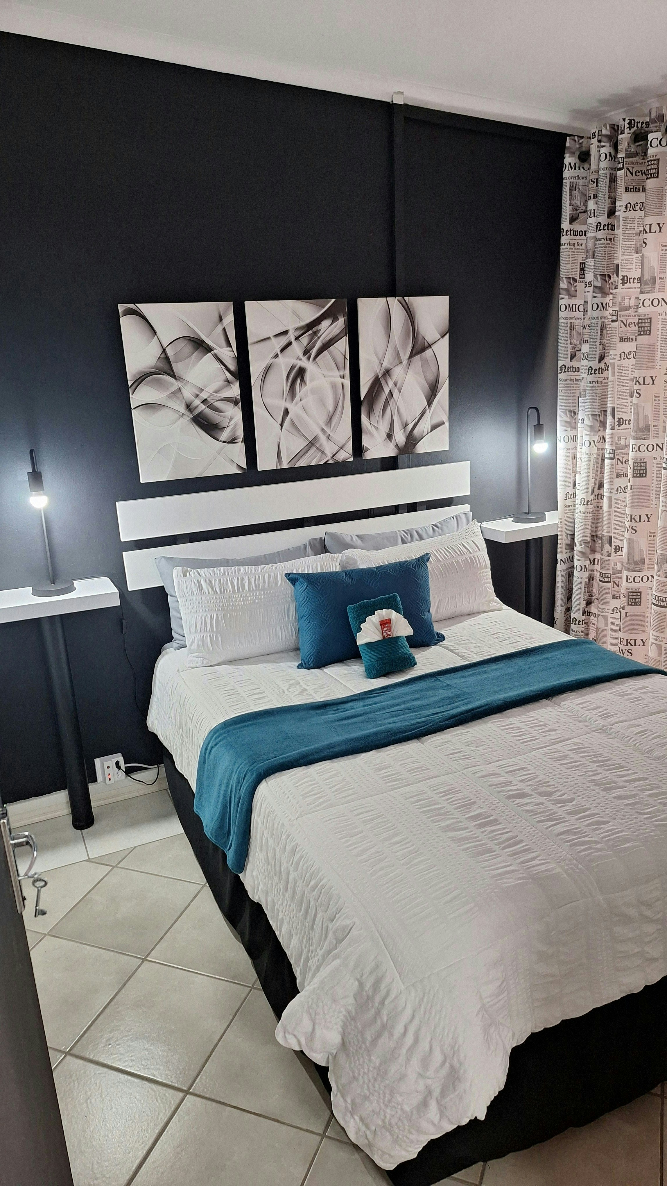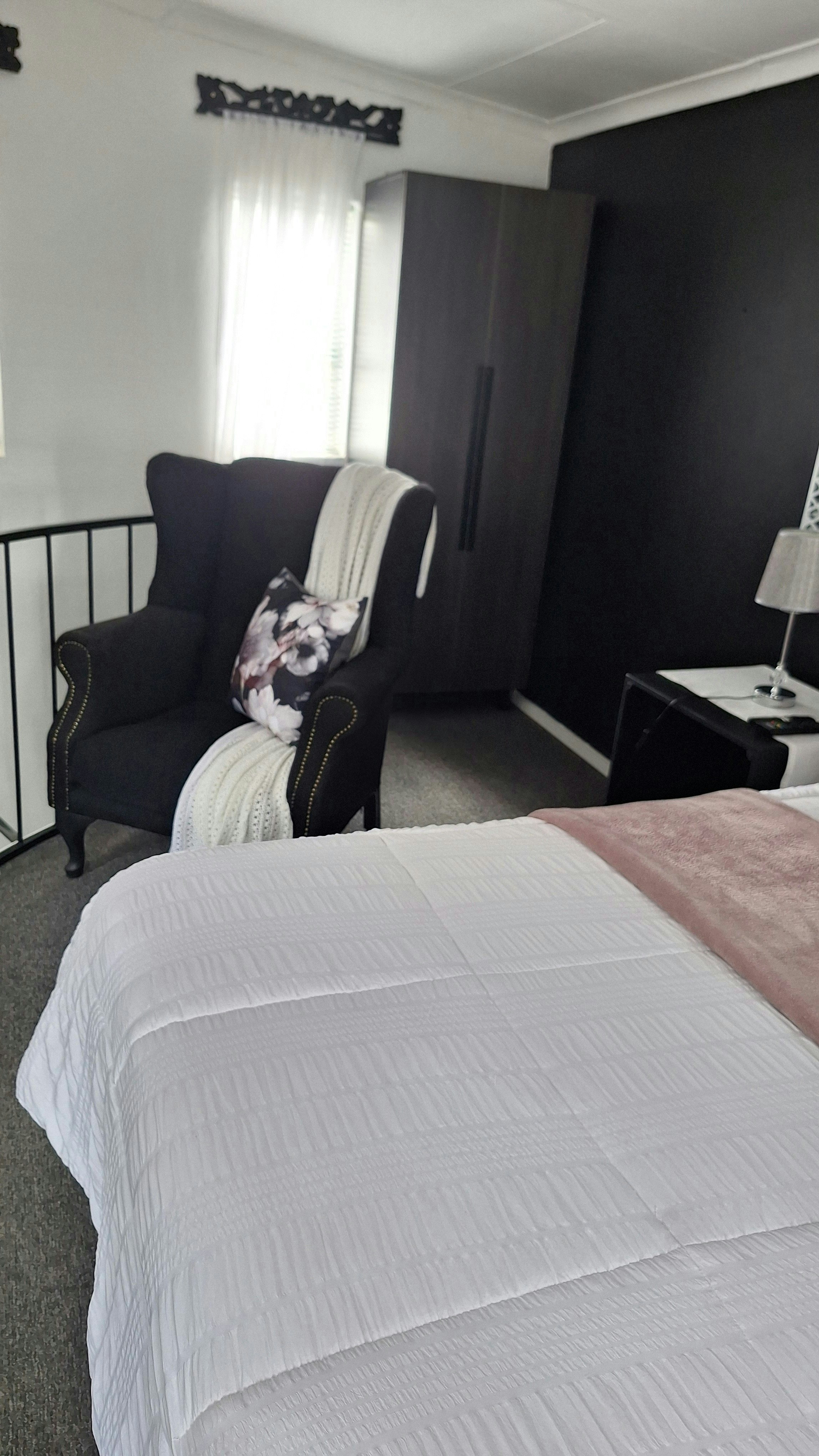 The communal kitchen is fully equipped for self-catering and contains a microwave, air fryer, fridge, toaster, kettle, and tea- and coffee-making facilities. The living area includes a TV with access to streaming services and free Wi-Fi. Guests have access to a braai area, secure parking, and airport transfer services by prior arrangement. A solar system and generator are available to assist during power interruptions, and security features include CCTV cameras, security beams, and armed response.