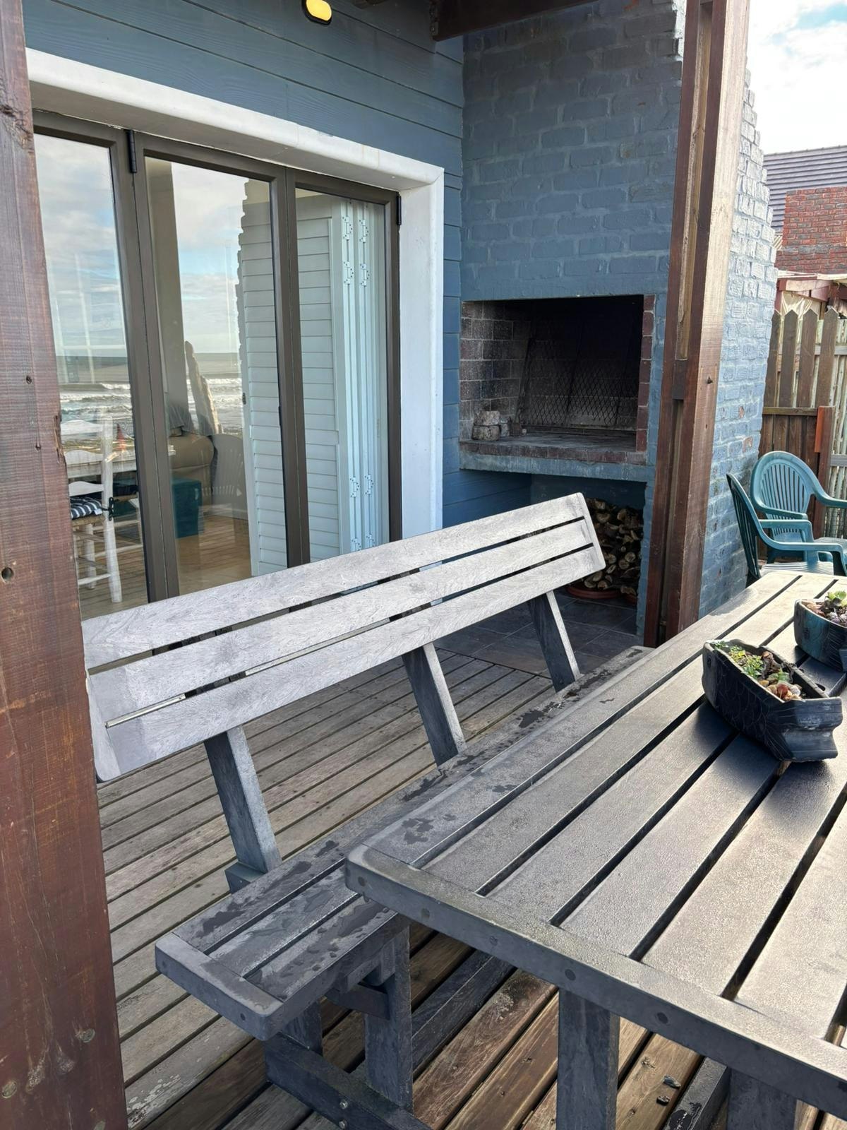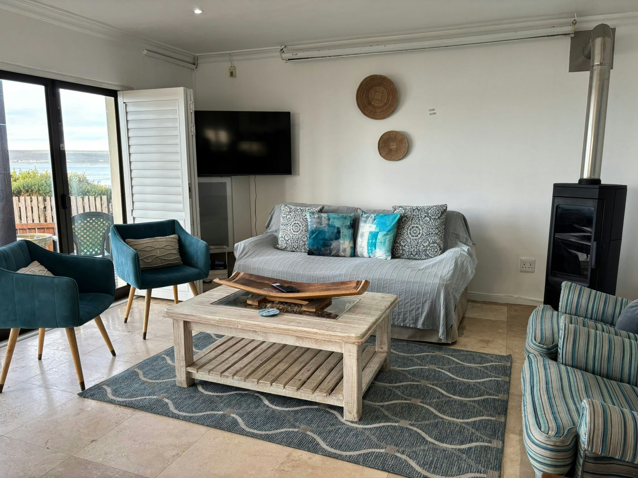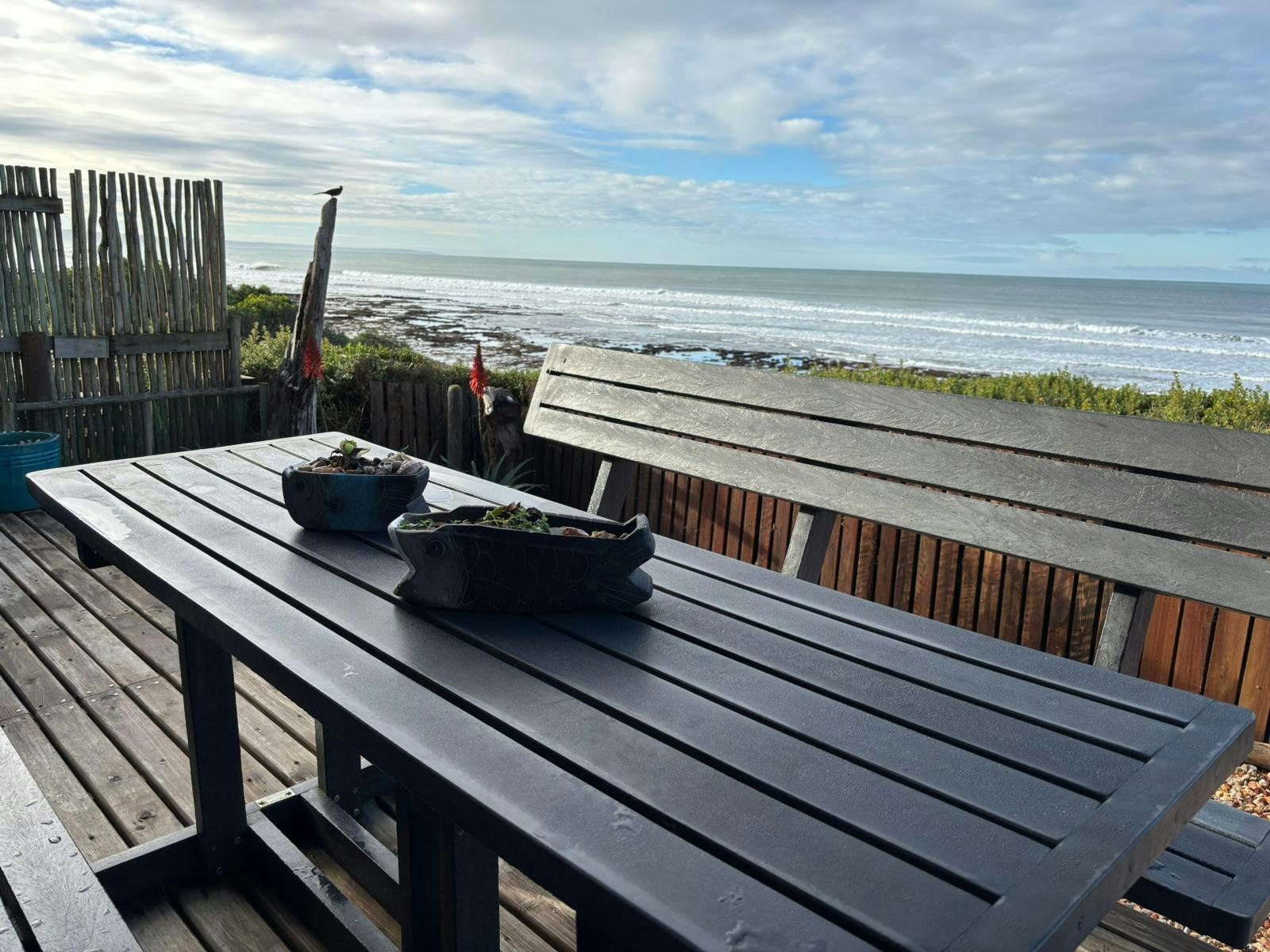 Die leefarea lei na 'n houtdek met pragtige uitsigte oor die see en 'n buitebraai om daardie perfekte oomblikke te geniet.