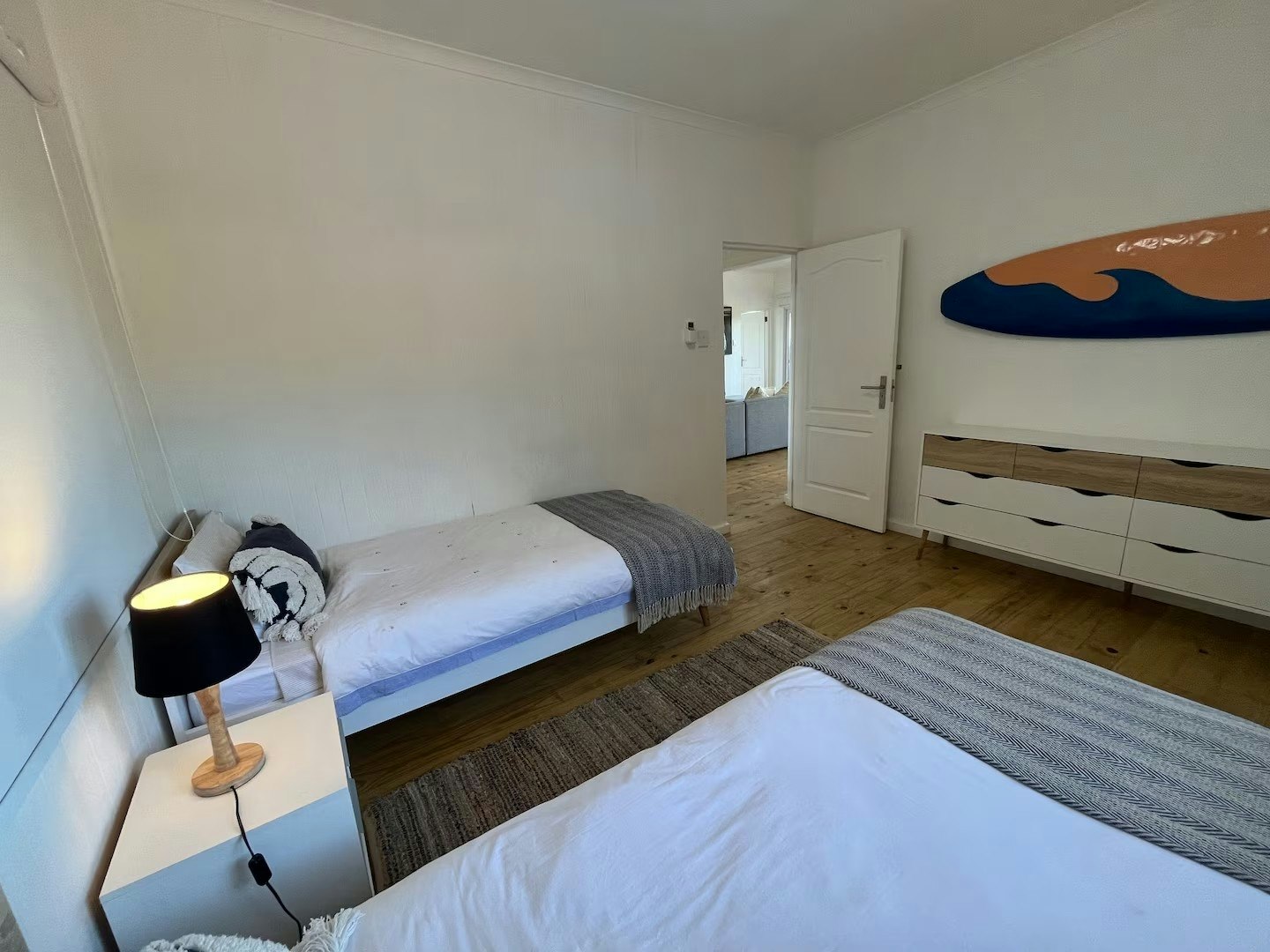 Slaapkamer 2 bied slaapplek vir 2 gaste en is gemeubileer met 2 enkelbeddens, 'n ingeboude kas en lugversorging.