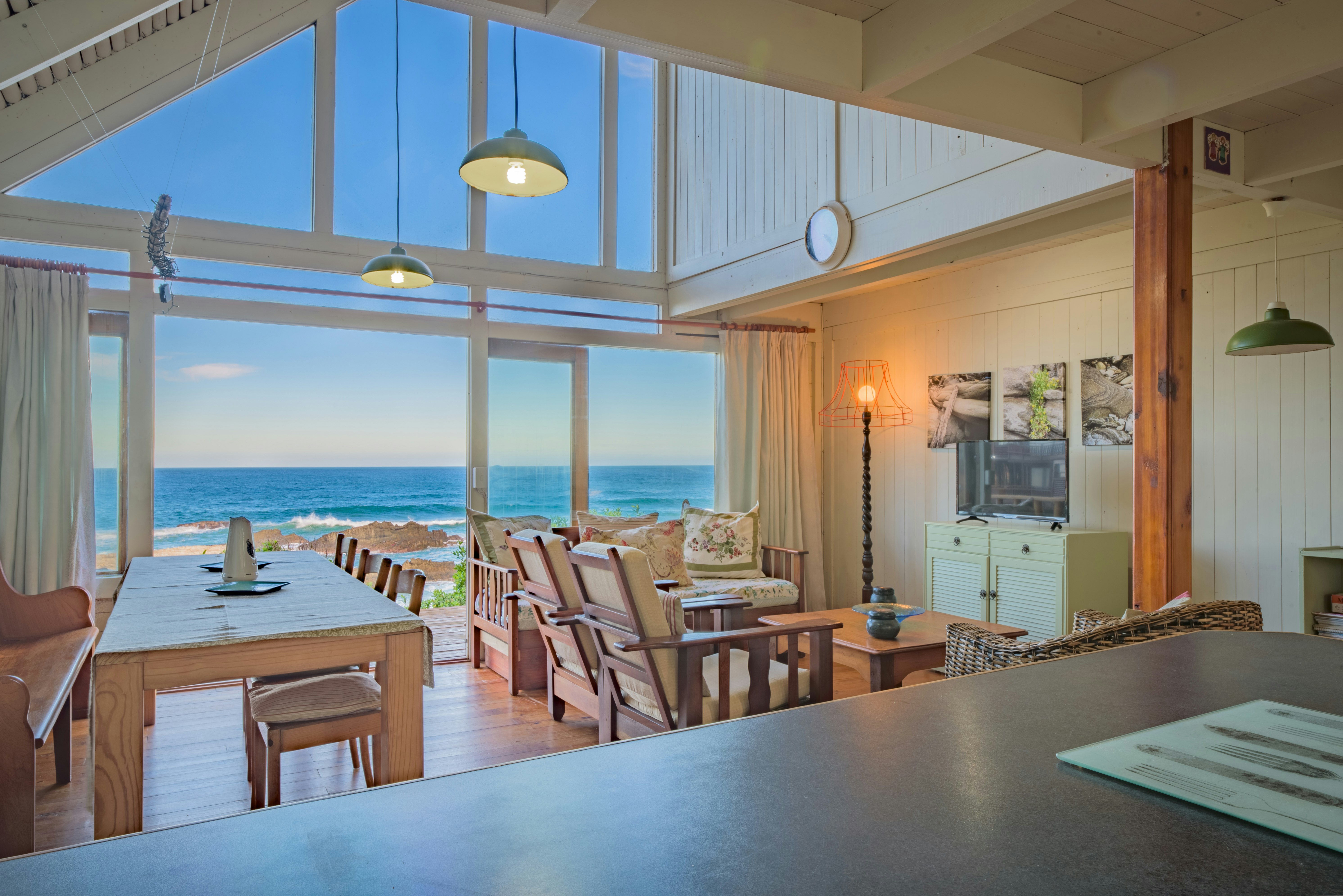 The lounge is equipped with a TV and shared DStv channels. The living area opens a deck, which offers stunning views of the sea.