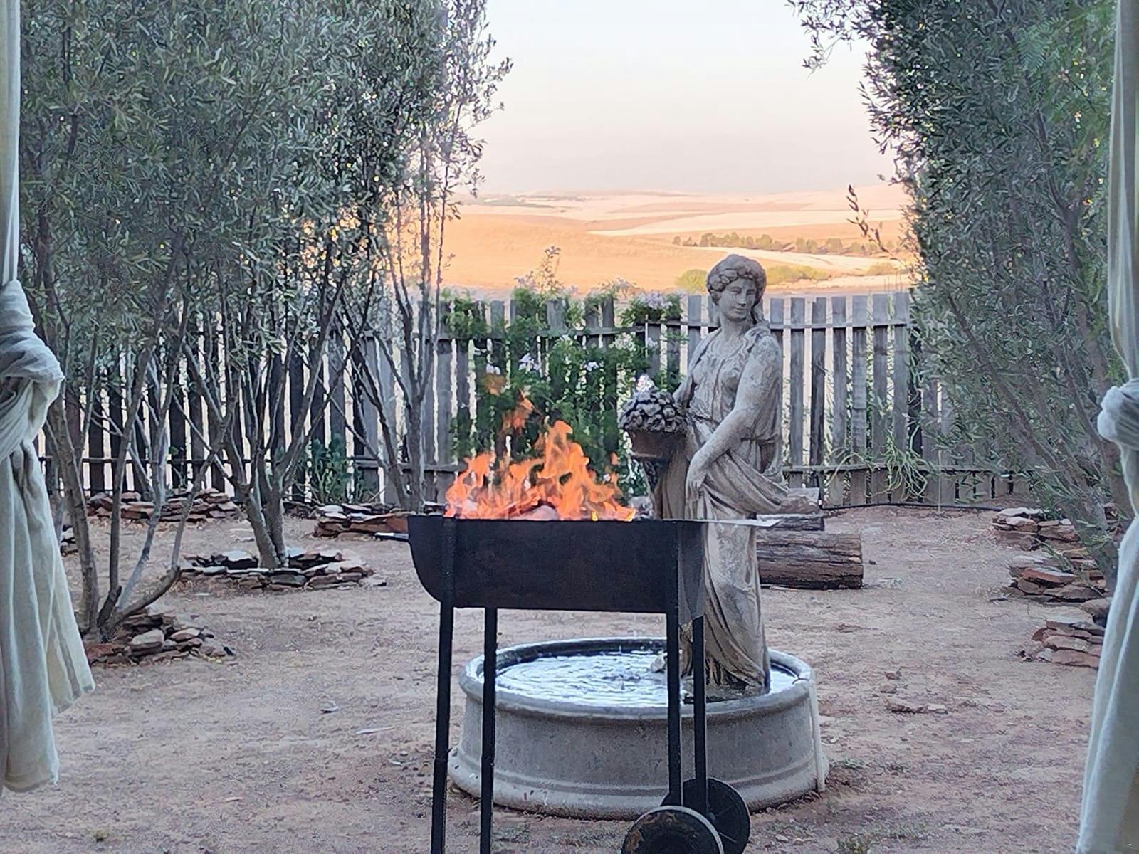 The property features an expansive garden with a fire pit, picnic tables, and braai facilities. Guests have access to a 4m x 2m x 1m portable swimming pool and a unique sandbag structure adjacent to the house, which serves as a "chill-out" space with an outdoor bar and seating area. This area is specifically designed to accommodate remote workers or creatives seeking an inspiring environment for writing or painting.