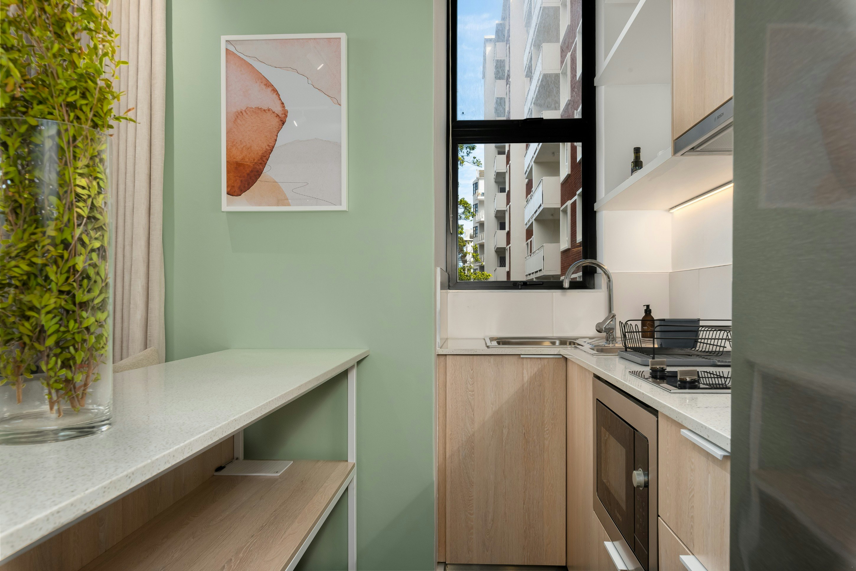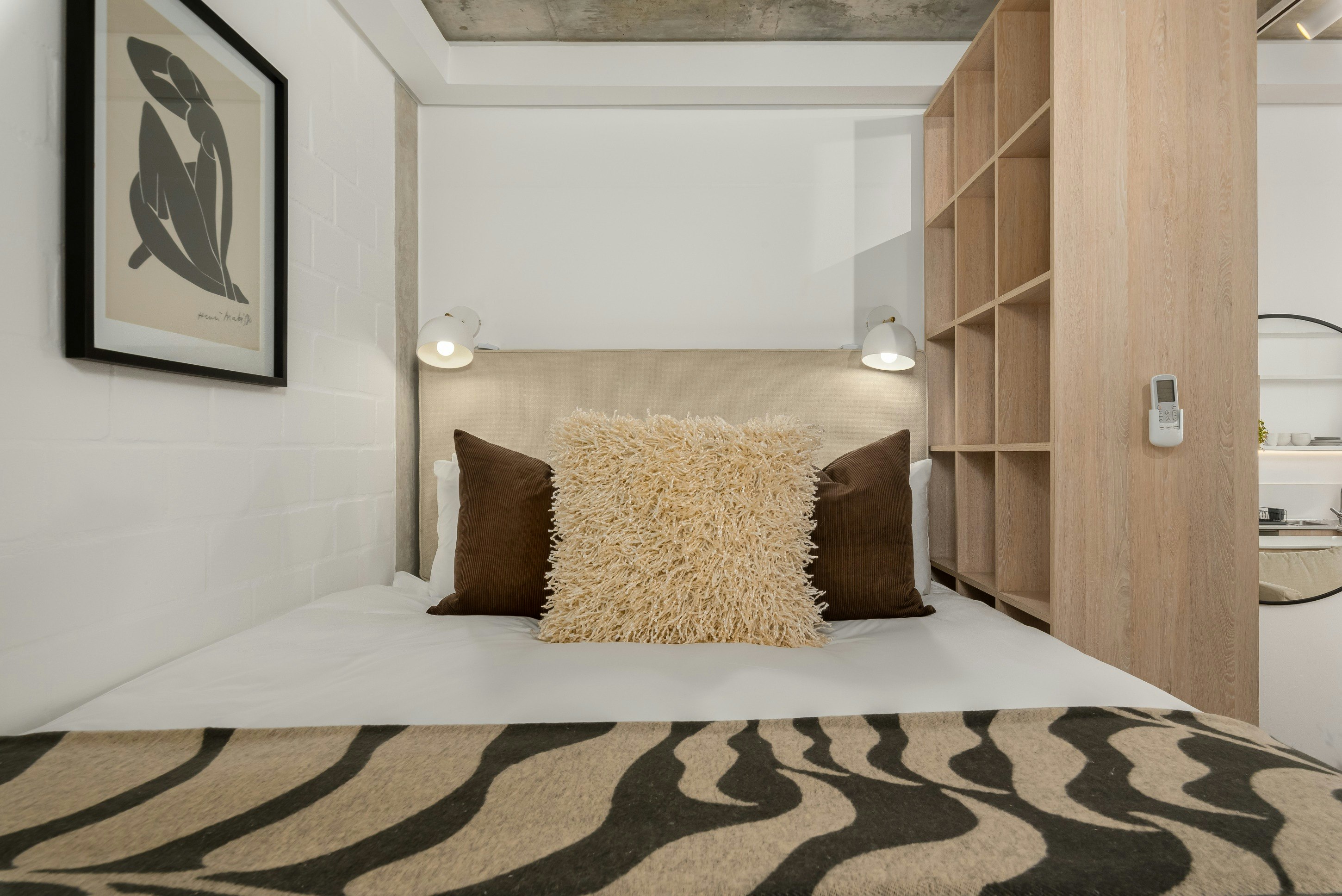 The studio apartment features a queen-size bed with ample storage and closet space, creating a cosy and functional sleeping area. The modern bathroom is fitted with a walk-in shower.