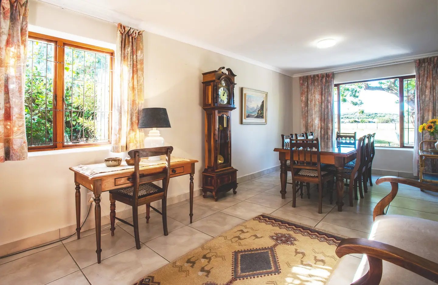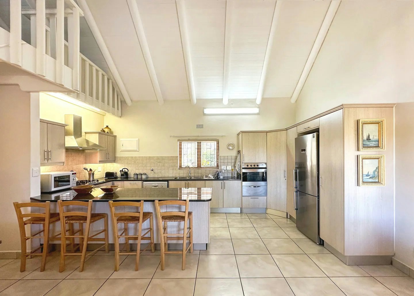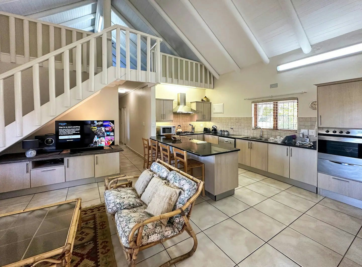 Die oopplan-kombuis is toegerus met 'n yskas-vrieskas, gasstoof, oond, mikrogolfoond en skottelgoedwasser. Die leefarea het 'n gemaklike sitarea en 'n TV, en lei na 'n aparte eetarea met 'n eetkamertafel vir 8. Die huis maak oop na 'n oordekte patio waar gaste buitelug-etes kan geniet met uitsig oor die tuin.