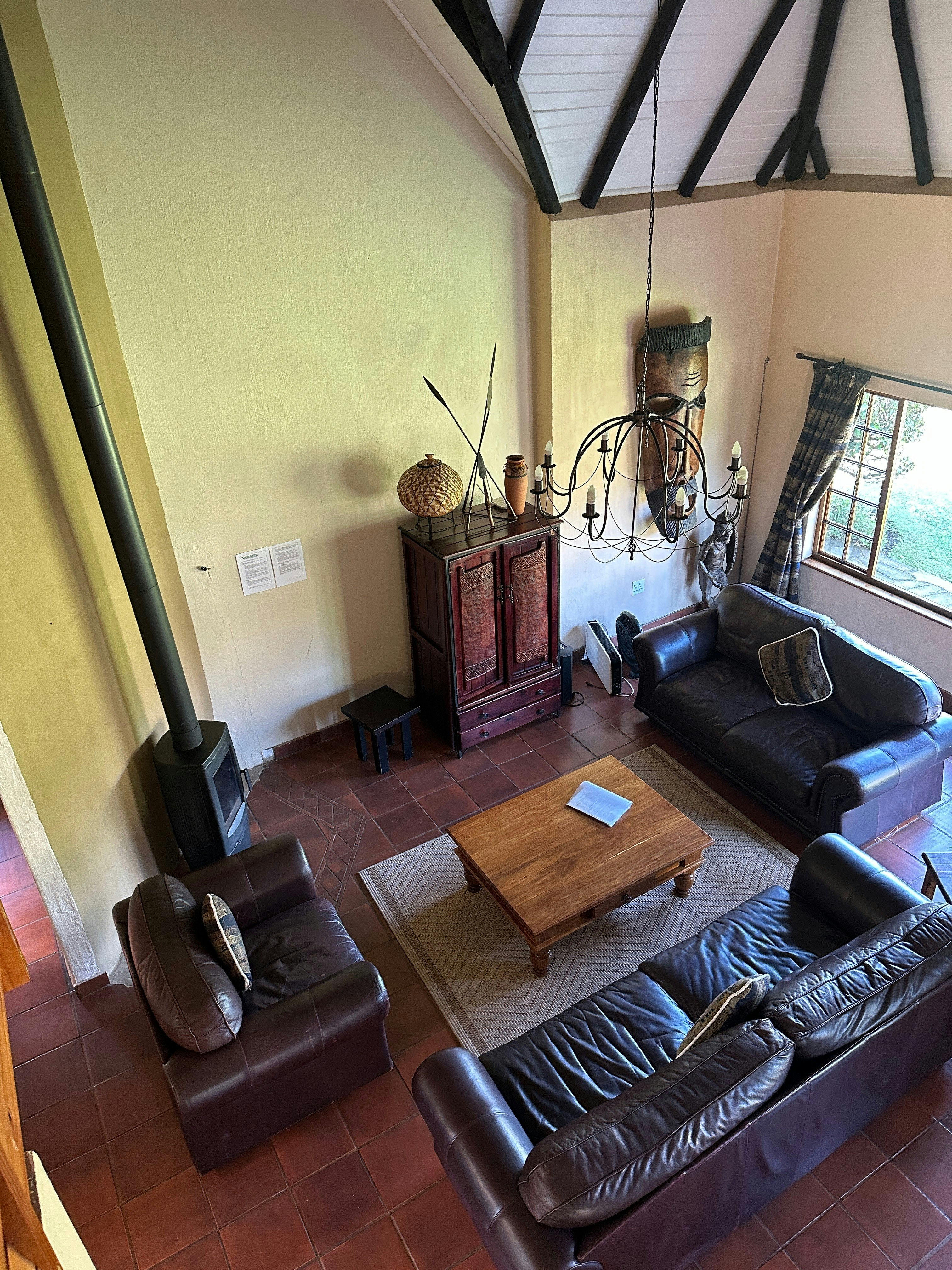 Die oopplan-leefarea beskik oor gemaklike sitplek, 'n TV met DStv-kanale, 'n eetkamertafel en 'n kombuis. Die kombuis is volledig toegerus met 'n stoof, yskas-vrieskas, mikrogolfoond, wasmasjien, tuimeldroër, eetgerei en breekware. Daar is ook 'n stadigbrandende kaggel in die sitkamer, wat omgewingswarmte bied gedurende die koue winteraande. 'n Ingeboude braai-area buite verseker baie aangename tye van ontspanning terwyl jy die asemrowende berguitsig geniet.