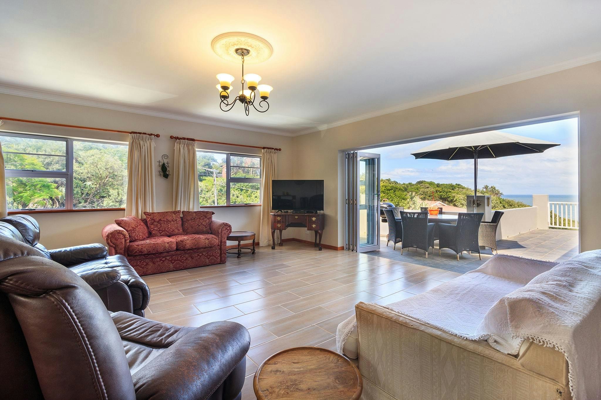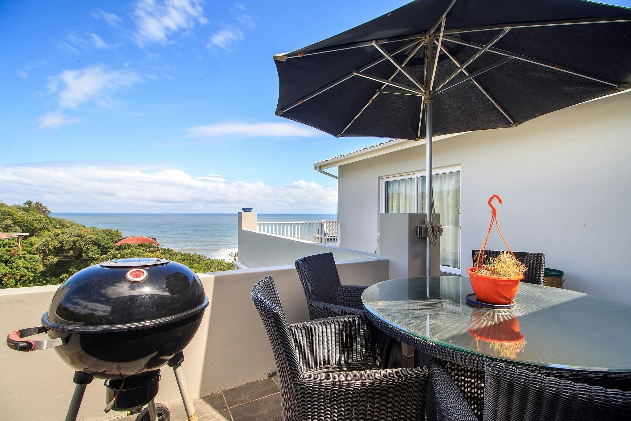 Die stapeldeure van die sitarea maak oop na 'n sonnige balkon met 'n etenstafel, 'n Weber-braai en 'n see-uitsig.