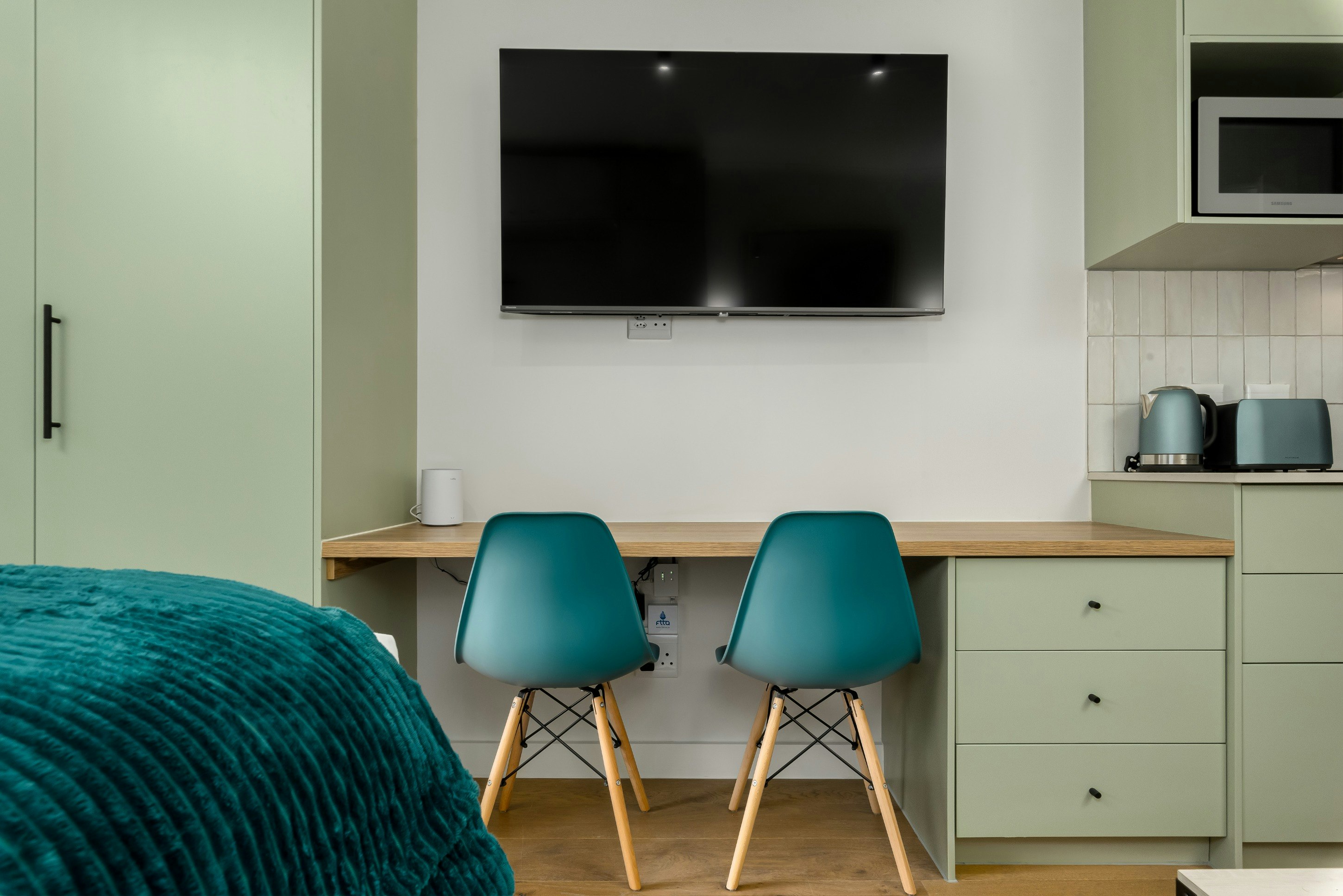 The living area boasts an open-plan design with a fully equipped kitchen, including a stove, oven, microwave, fridge-freezer, cutlery, and crockery. The lounge area is furnished with comfortable seating and a smart TV with YouTube and Netflix, along with free Wi-Fi.