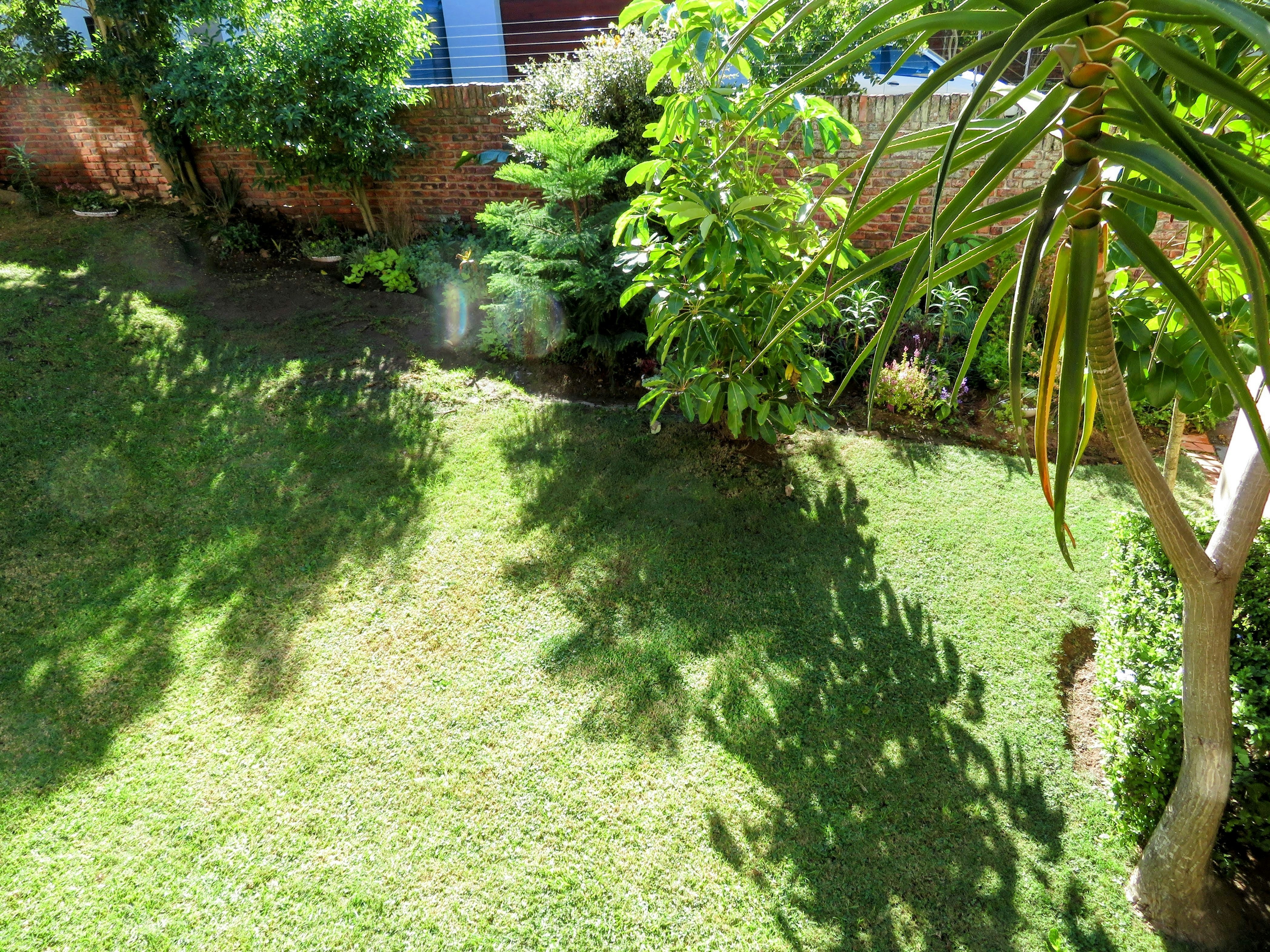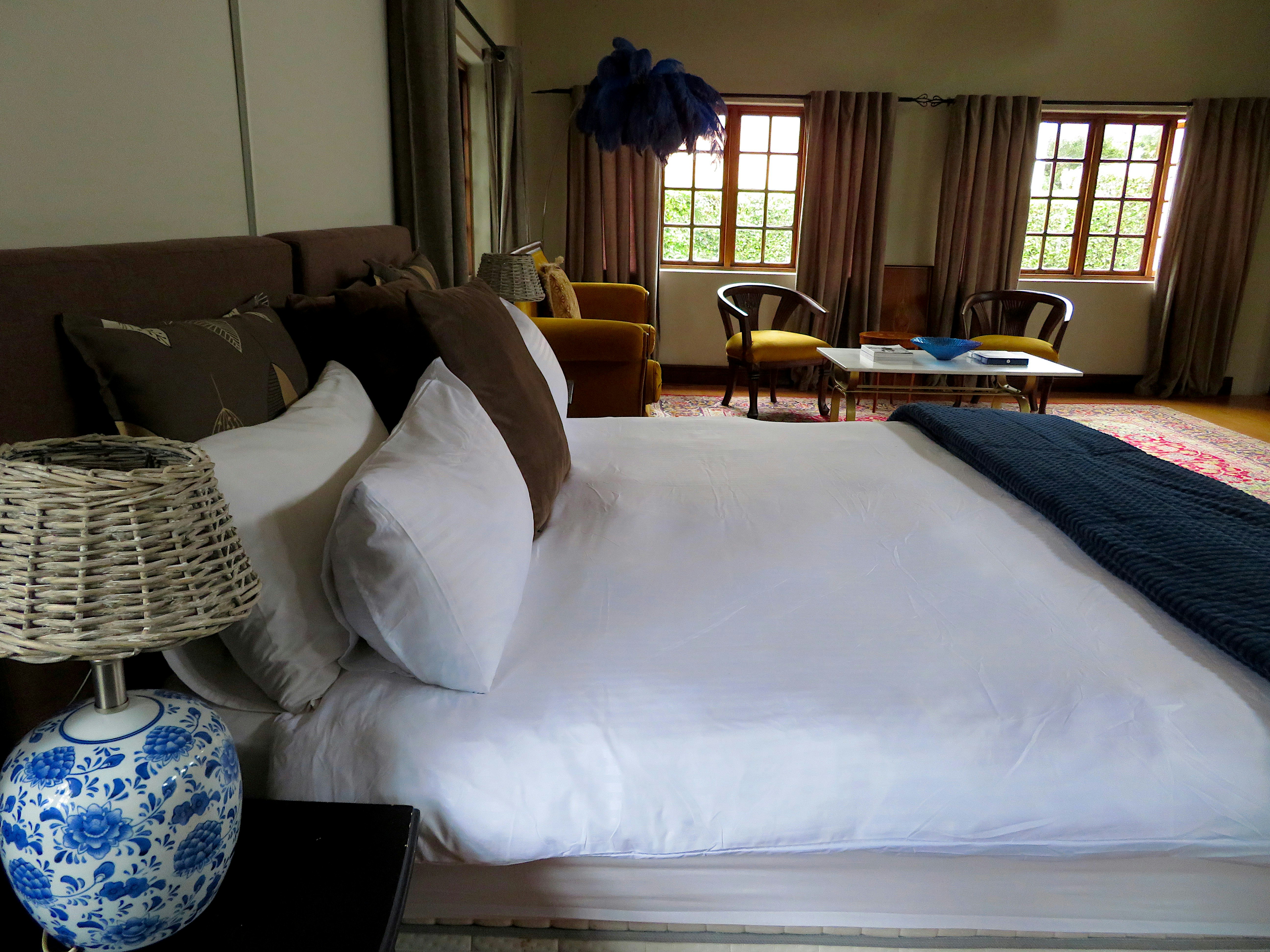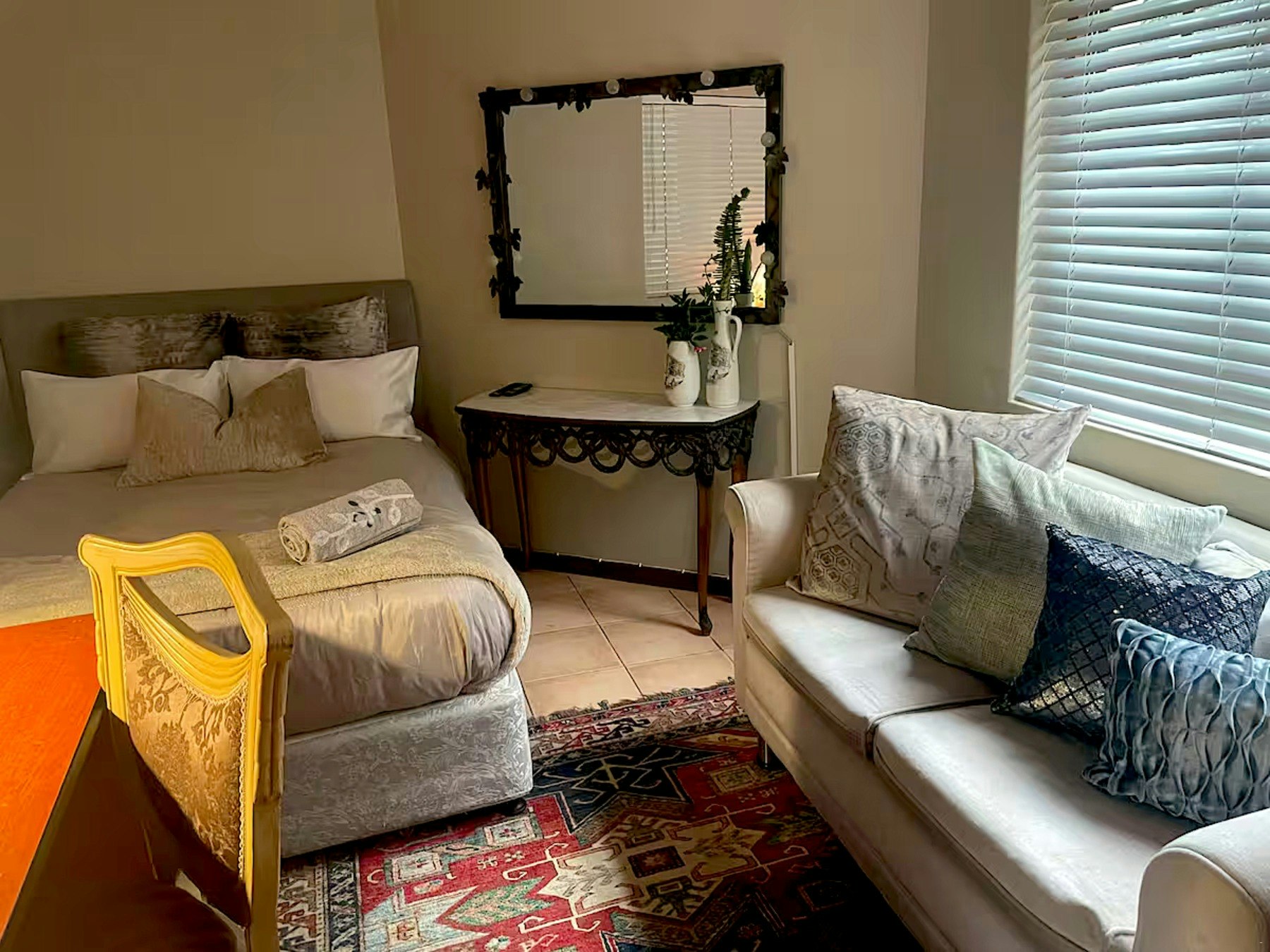The Church Road Deluxe Apartment offers a little more luxury—a spacious, beautifully styled suite with high ceilings, lush garden views, a comfy double bed, and an en-suite bathroom. The full kitchenette lets you cook at your own pace, and there's a flat-screen TV with DStv, free Wi-Fi, and secure on-site parking.