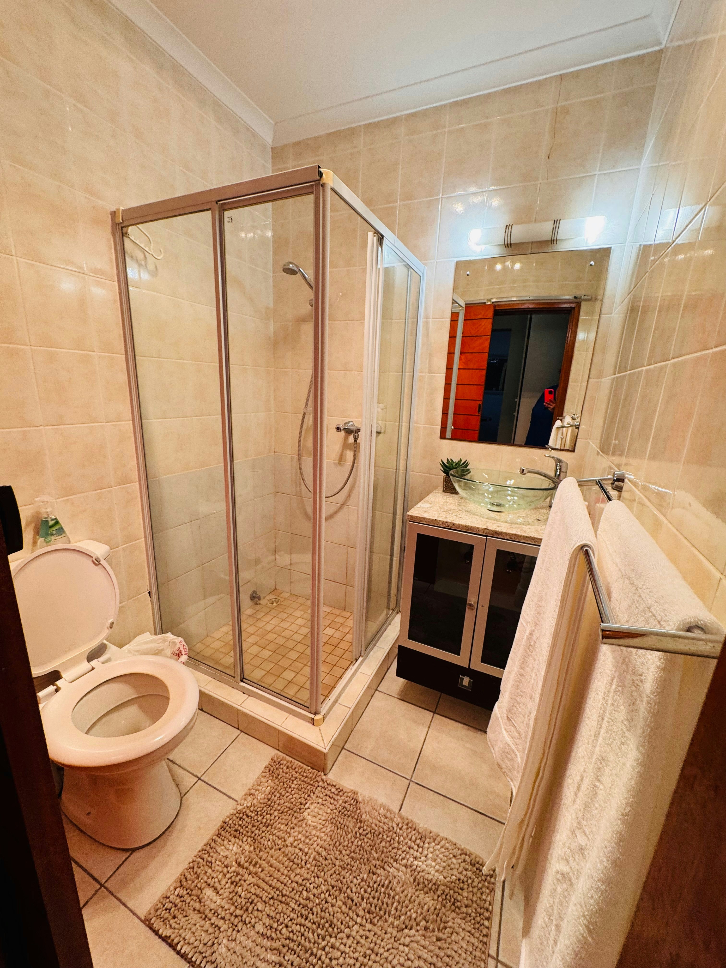 The living area features an open-plan design with a fully equipped kitchen, including a stove, oven, microwave, toaster, kettle, fridge-freezer, cutlery, and crockery. A 4-seater dining table adjacent to the kitchen is perfect for meals. The lounge area is furnished with comfortable seating, a TV with DStv channels, and free Wi-Fi facilities.