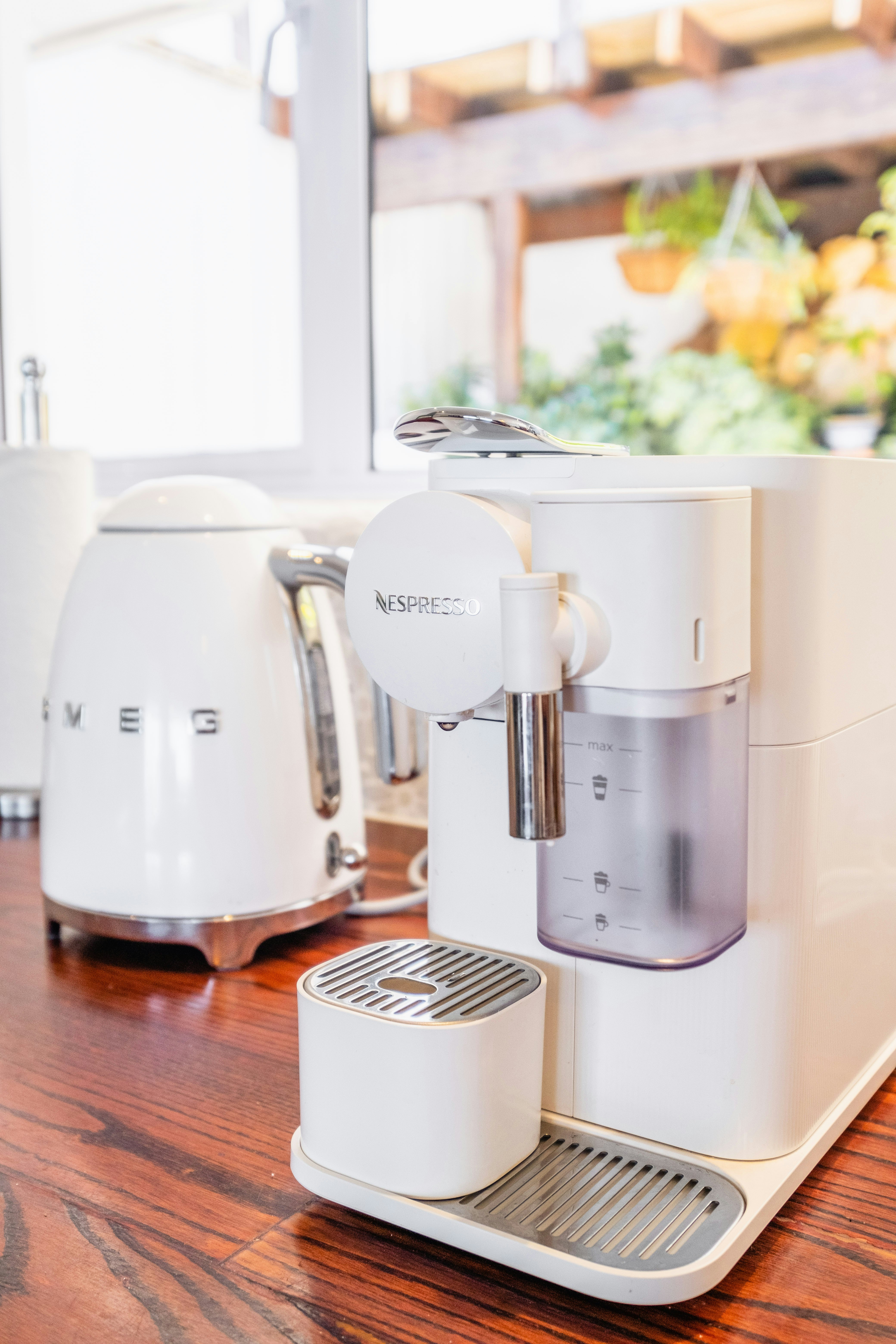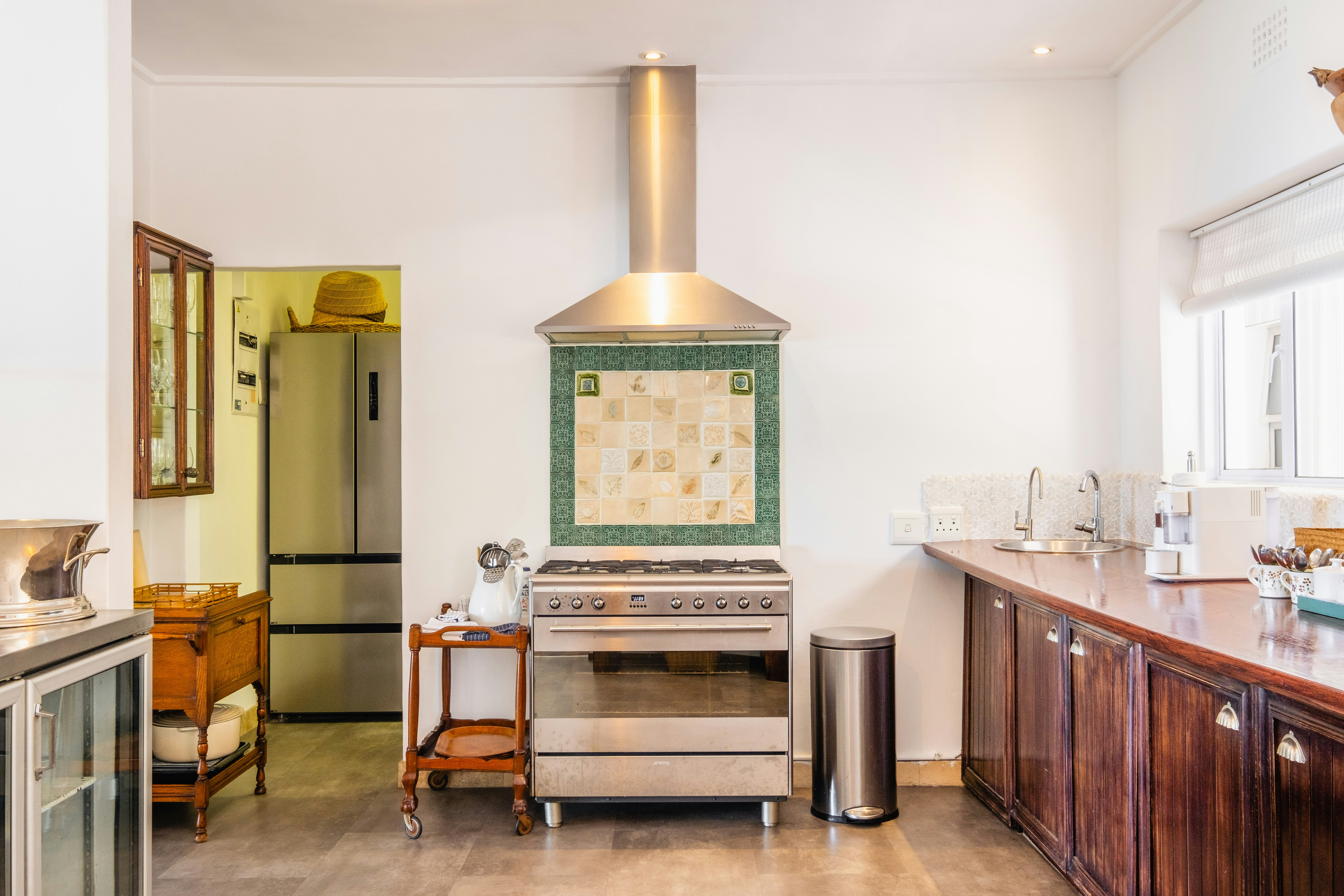The kitchen comes fully equipped with modern amenities including a fridge, microwave, stove, oven, and tea-and-coffee-making facilities.