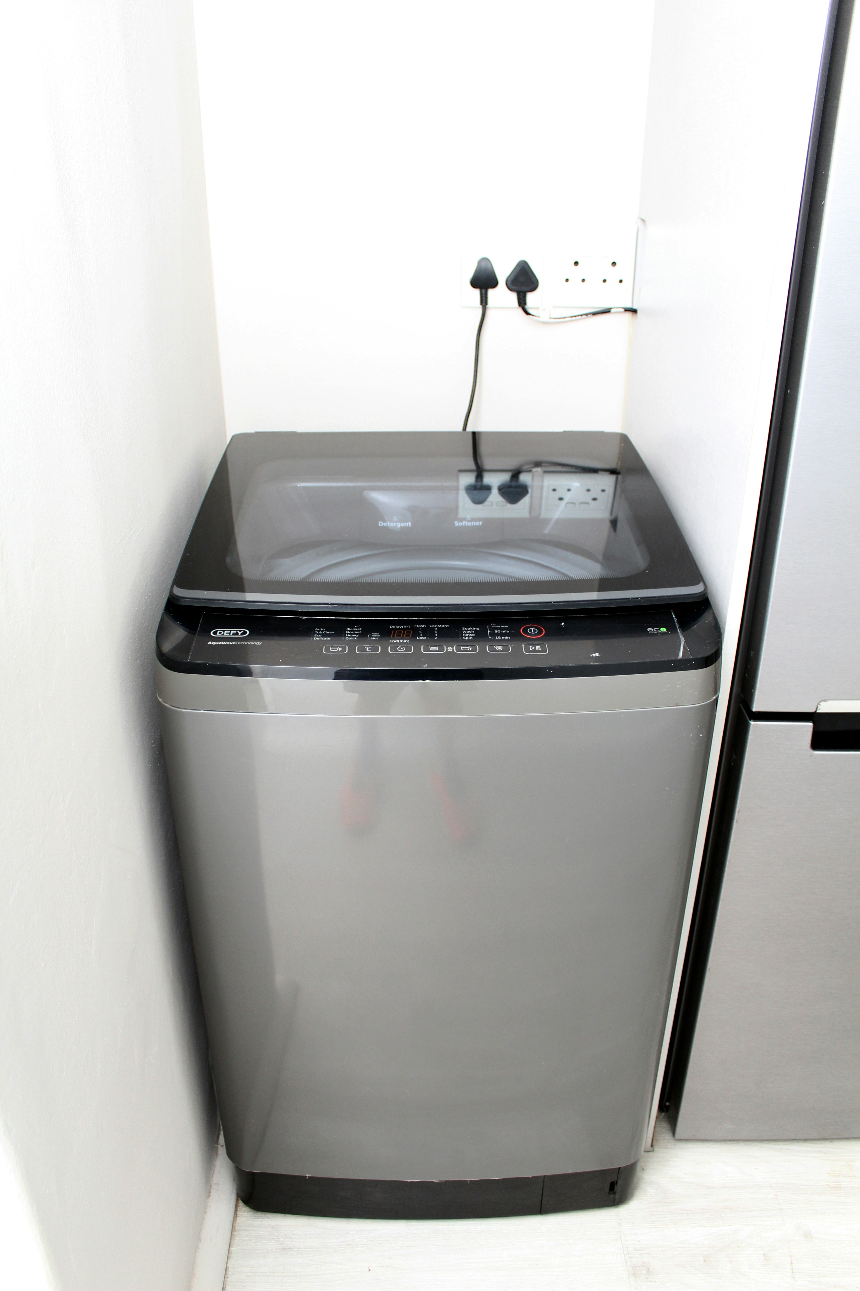 The open-plan living area features a well-equipped kitchen with a 1-plate induction hob, microwave, kettle, fridge-freezer, cutlery, and crockery, as well as a washing machine. There's also a breakfast bar with stools. The adjacent lounge has a comfortable couch and a TV.