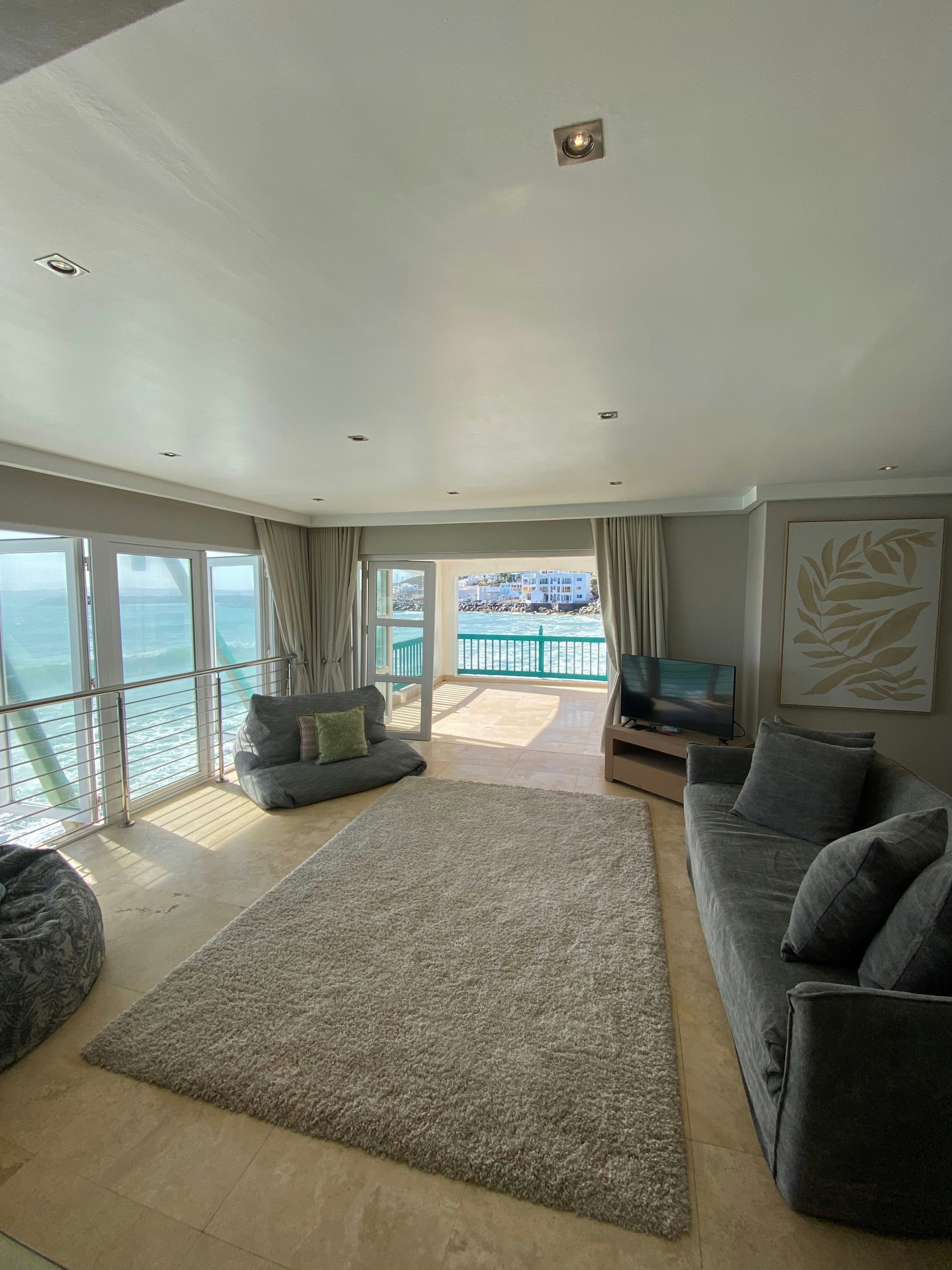 The open-plan living area invites relaxation with beautiful ocean views, comfortable seating, a TV, a dining table, and a well-equipped kitchen. Modern conveniences include a fridge-freezer, stove, oven, microwave, and coffee- and tea-making facilities, along with a built-in braai for culinary delights. Stepping outside onto the balcony, guests can unwind while making use of the braai facilities and soaking in the captivating views. Secure on-site parking is provided.