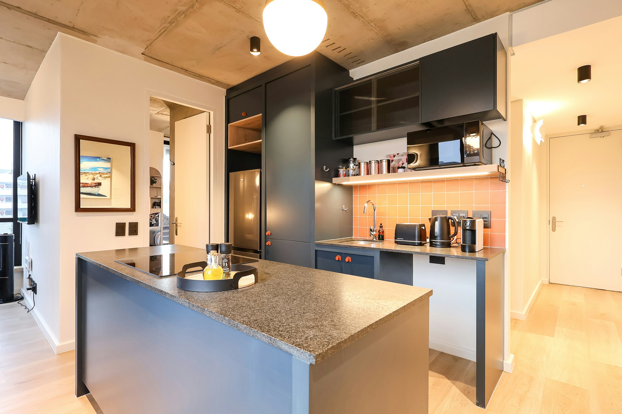 The living area features comfortable seating, a TV, and a dining table, while the kitchen is fully equipped with a fridge-freezer, stove, oven, microwave, and coffee- and tea-making facilities. Guests can relax on a private balcony or make use of the rooftop communal swimming pool.