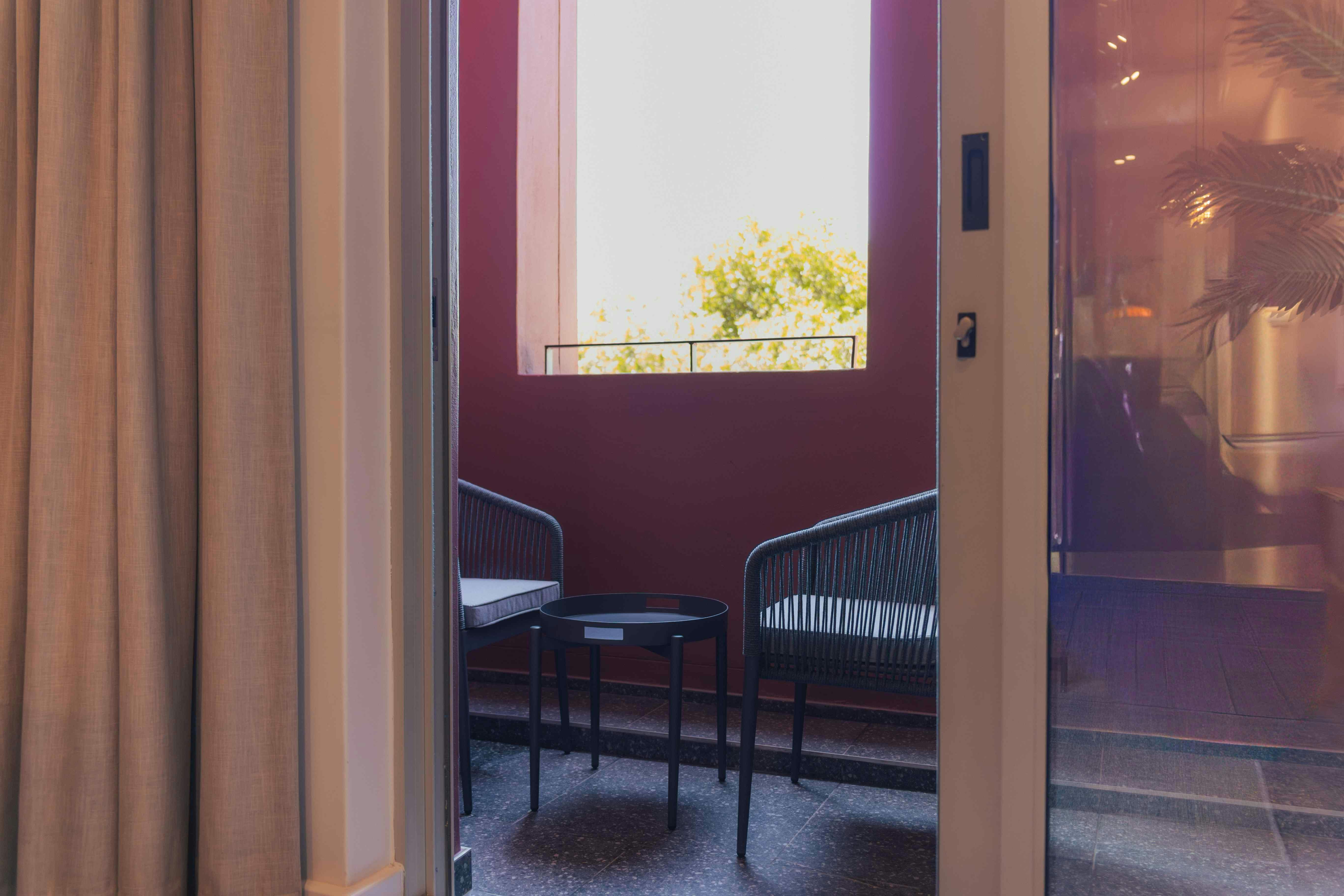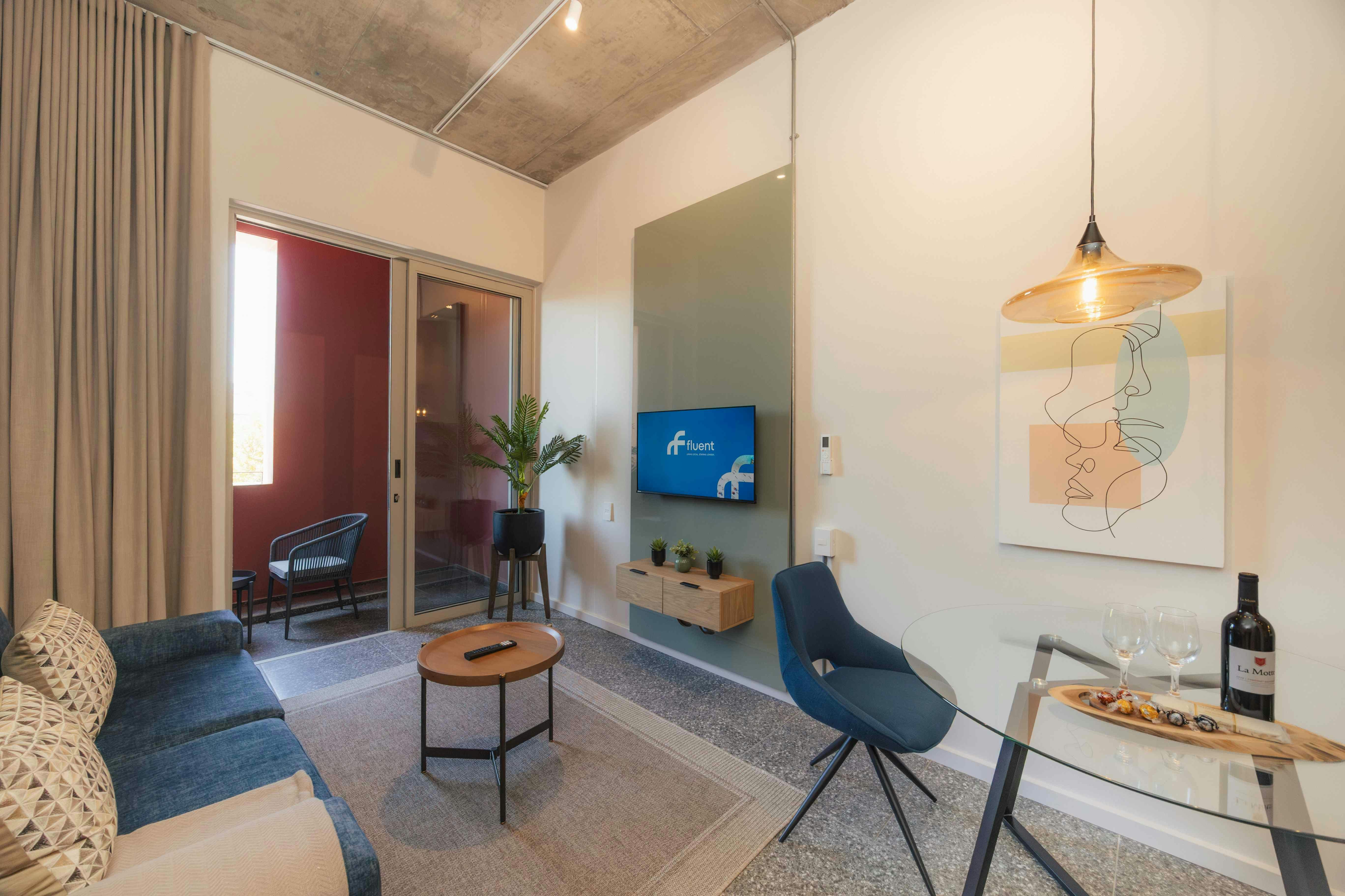 The kitchenette is equipped with a fridge, microwave, kettle, stove, oven, toaster, tea- and coffee-making facilities, and a small dining table. A washing machine, iron, and drying rack are available for convenience. Additional amenities include air-conditioning, a TV with streaming capability, and free Wi-Fi. The unit opens onto a private balcony with views of the surrounding area.