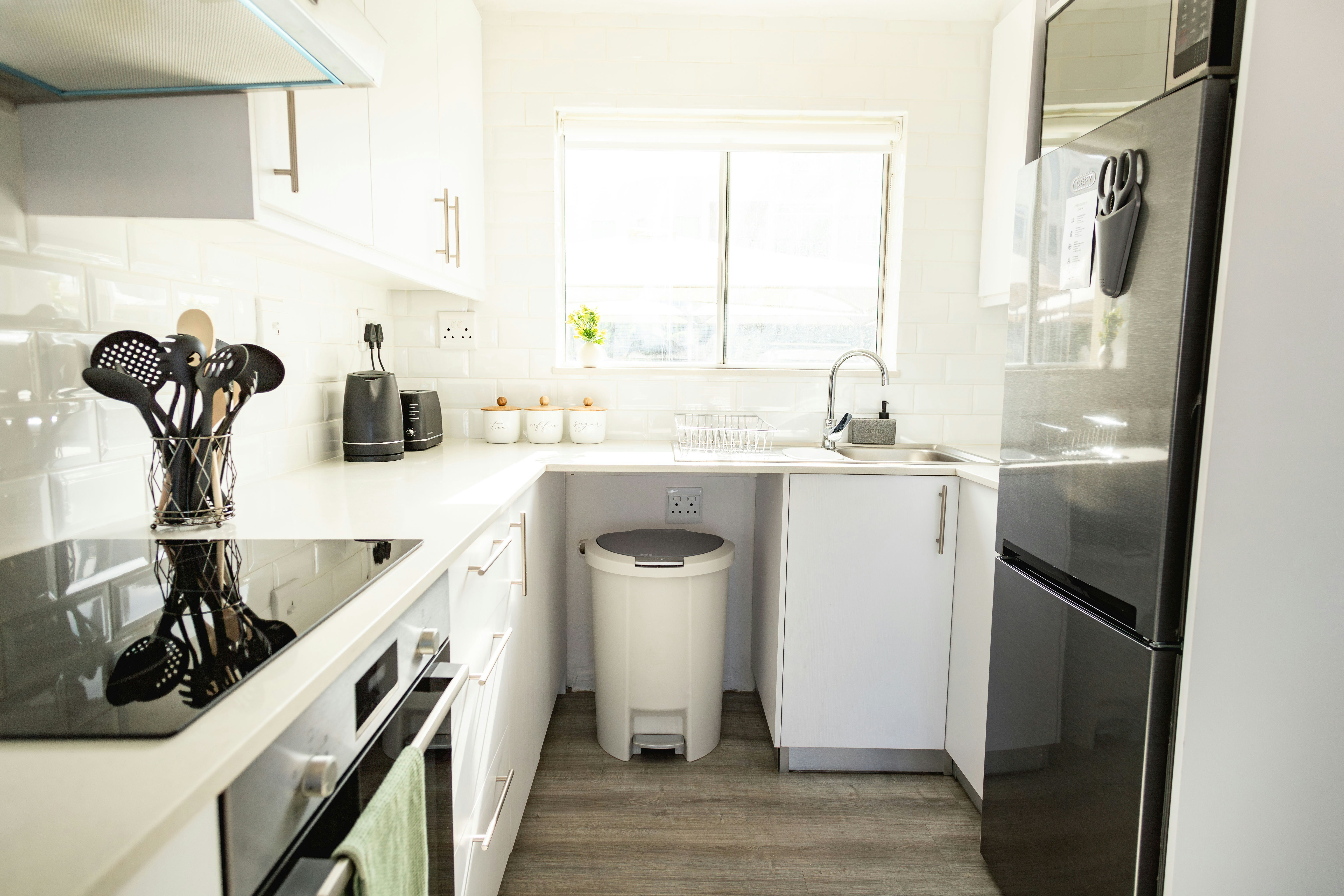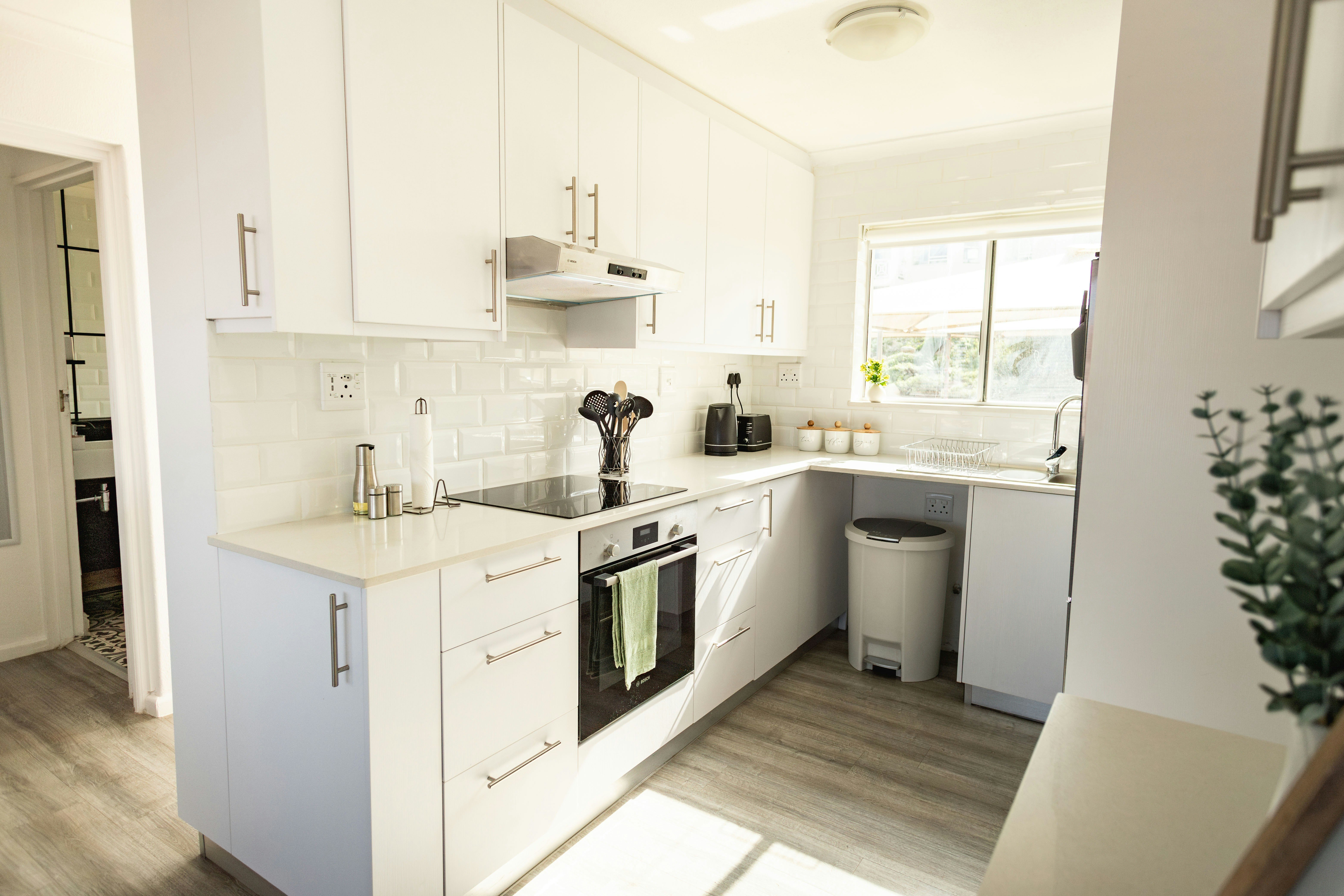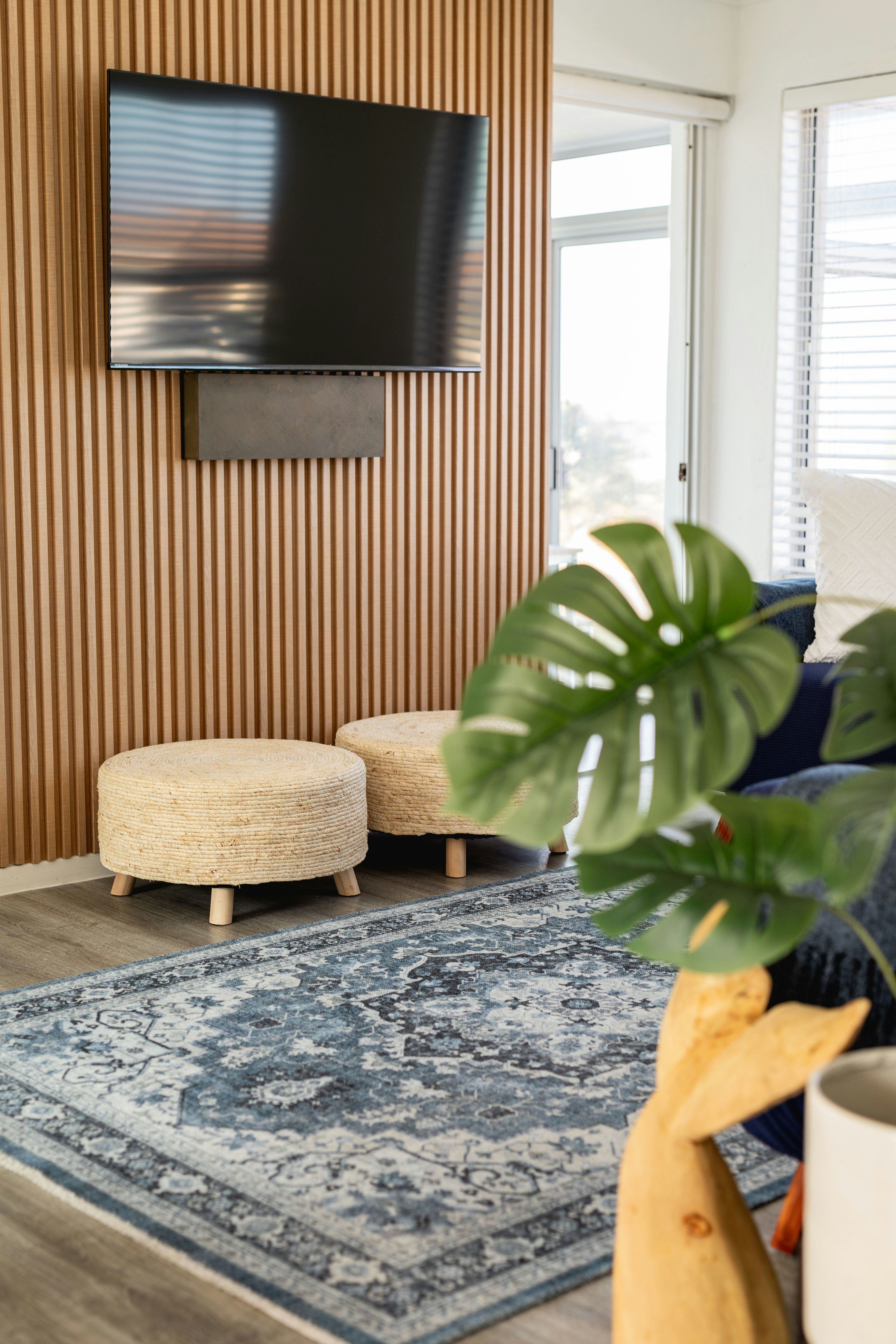 Die oopplan-leefarea beskik oor 'n sitarea met gemaklike rusbanke, 'n TV met stroomdienste, 'n toonbank met sitplek en 'n kombuis wat met 'n yskas-vrieskas, stoof, oond en mikrogolfoond toegerus is.