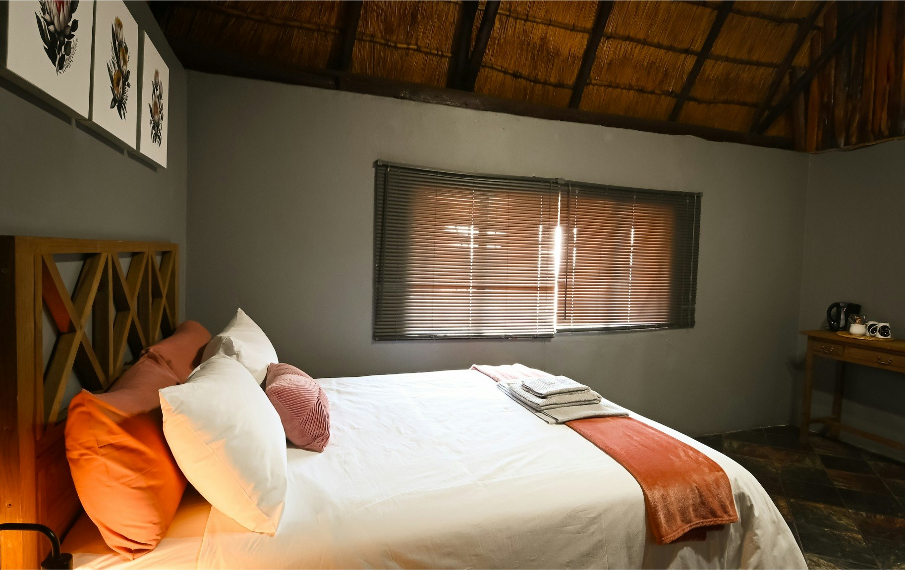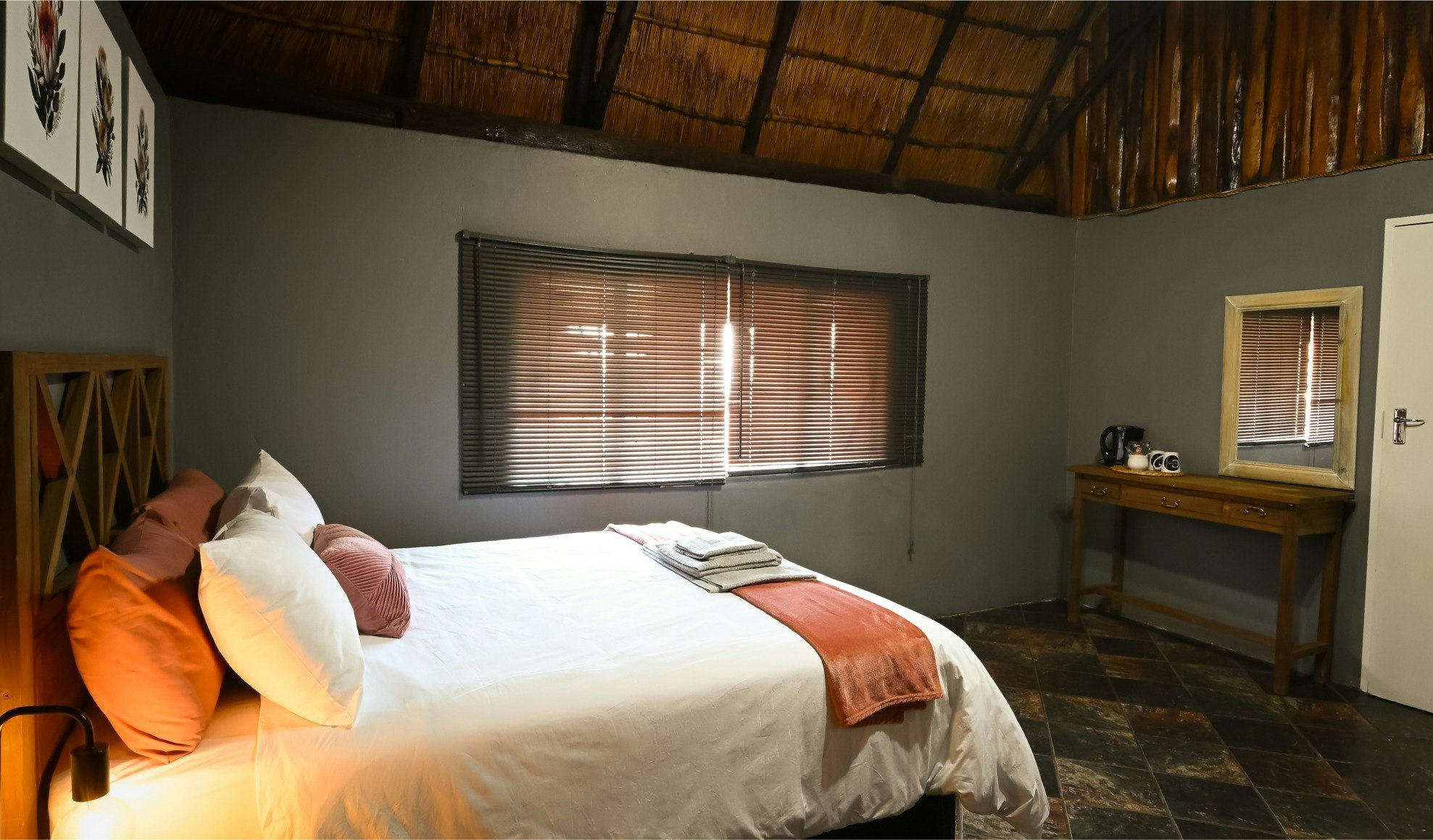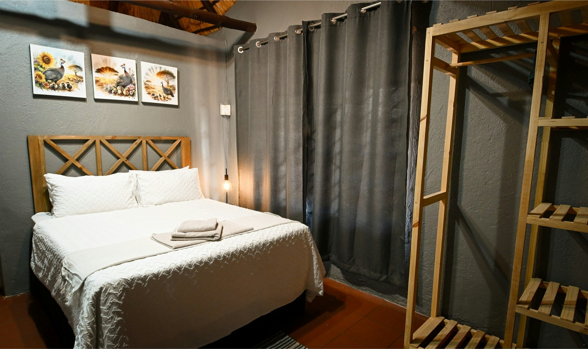Die lodge beskik oor 10 pragtige chalets, elk met 'n en suite-badkamer. Die kamers het gemaklike beddens, sagte duvets, kraakvars linne en privaat ingange. Bykomende geriewe sluit TV's met DStv en WiFi in, tesame met yskassies, tee- en koffiemaakgeriewe, en toegewyde werkstasies in die chalets.