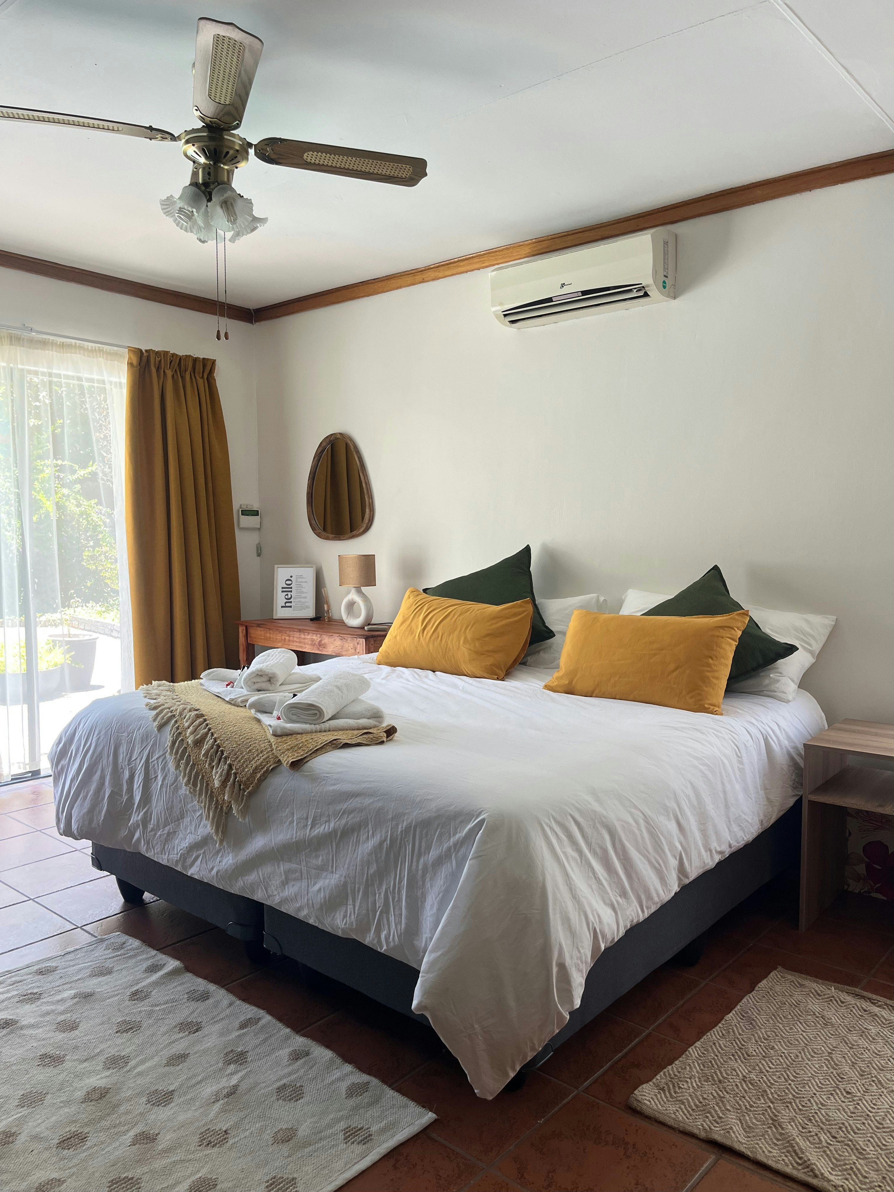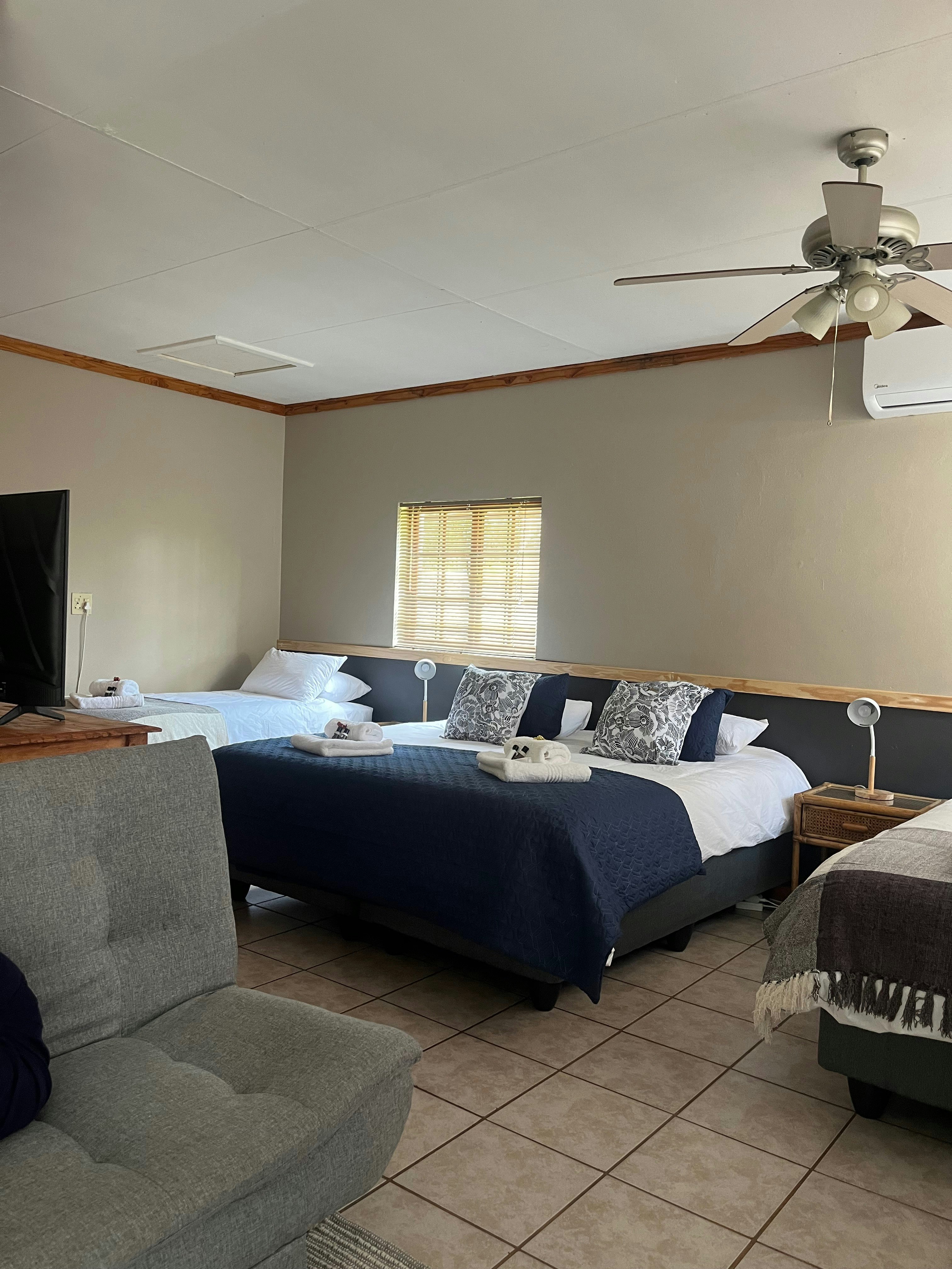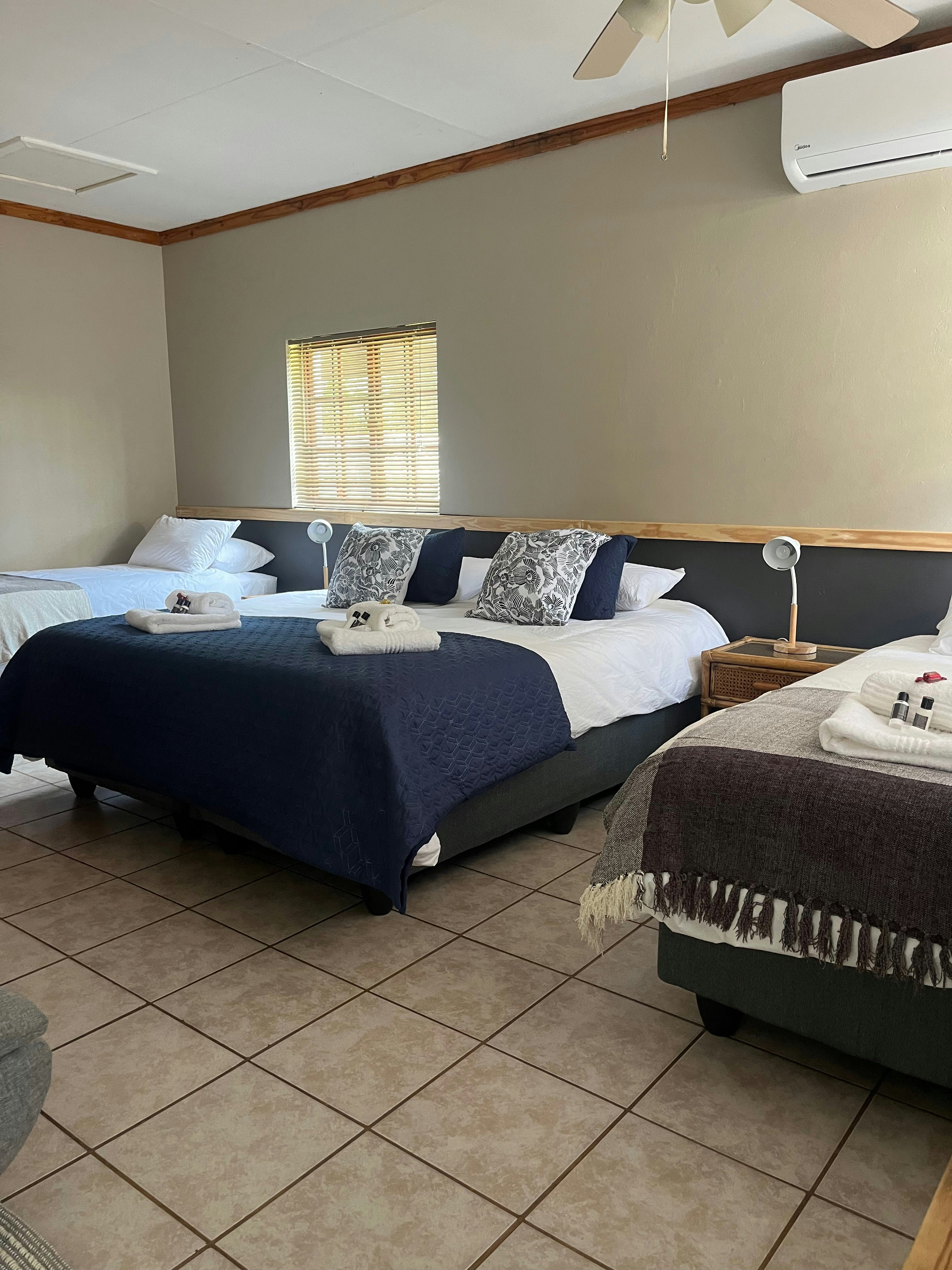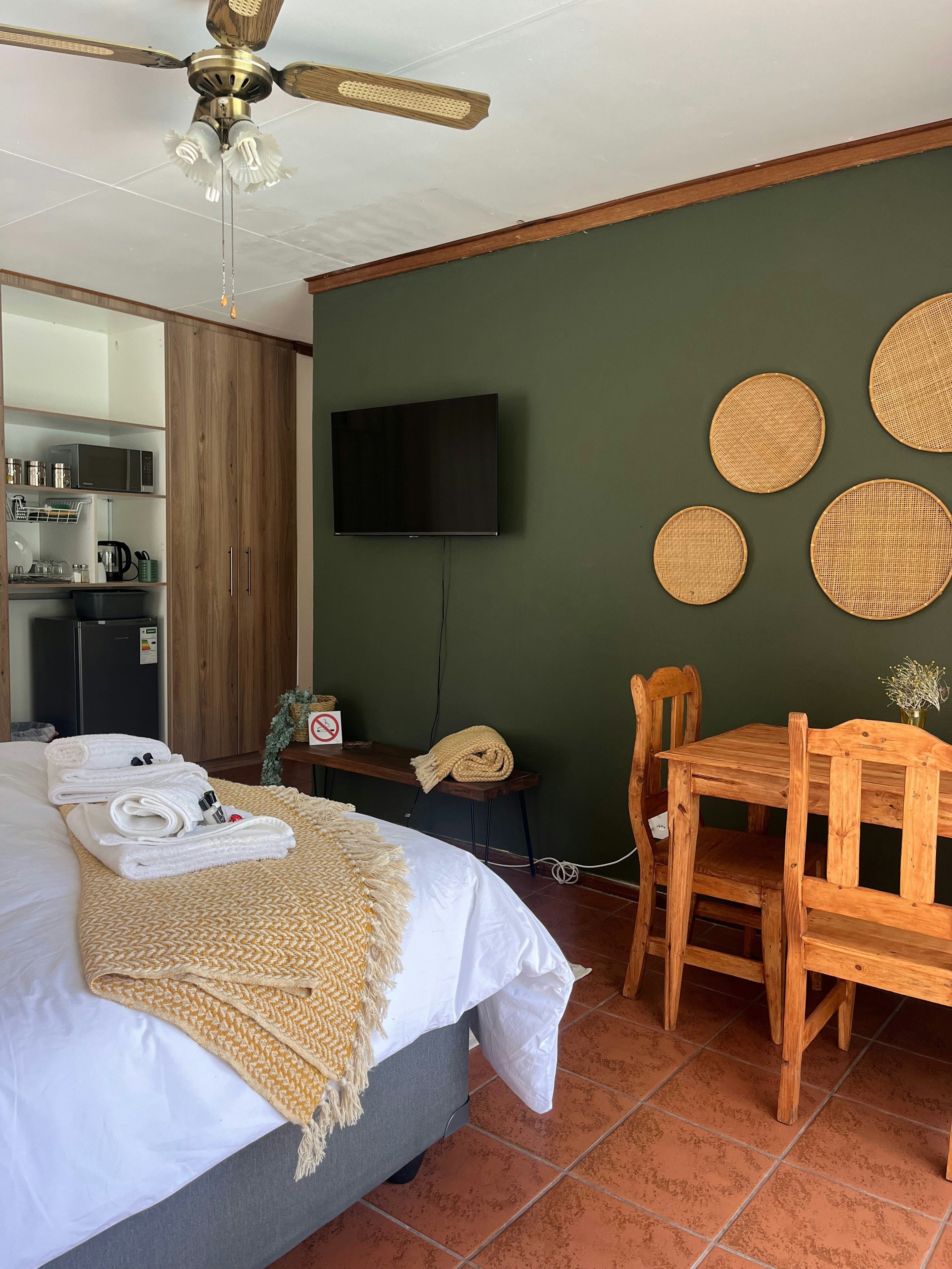 Guests have access to secure on-site parking, with additional space for caravans or trailers. Communal facilities include a swimming pool and a lapa with an indoor braai, providing a perfect setting for relaxation and outdoor meals.