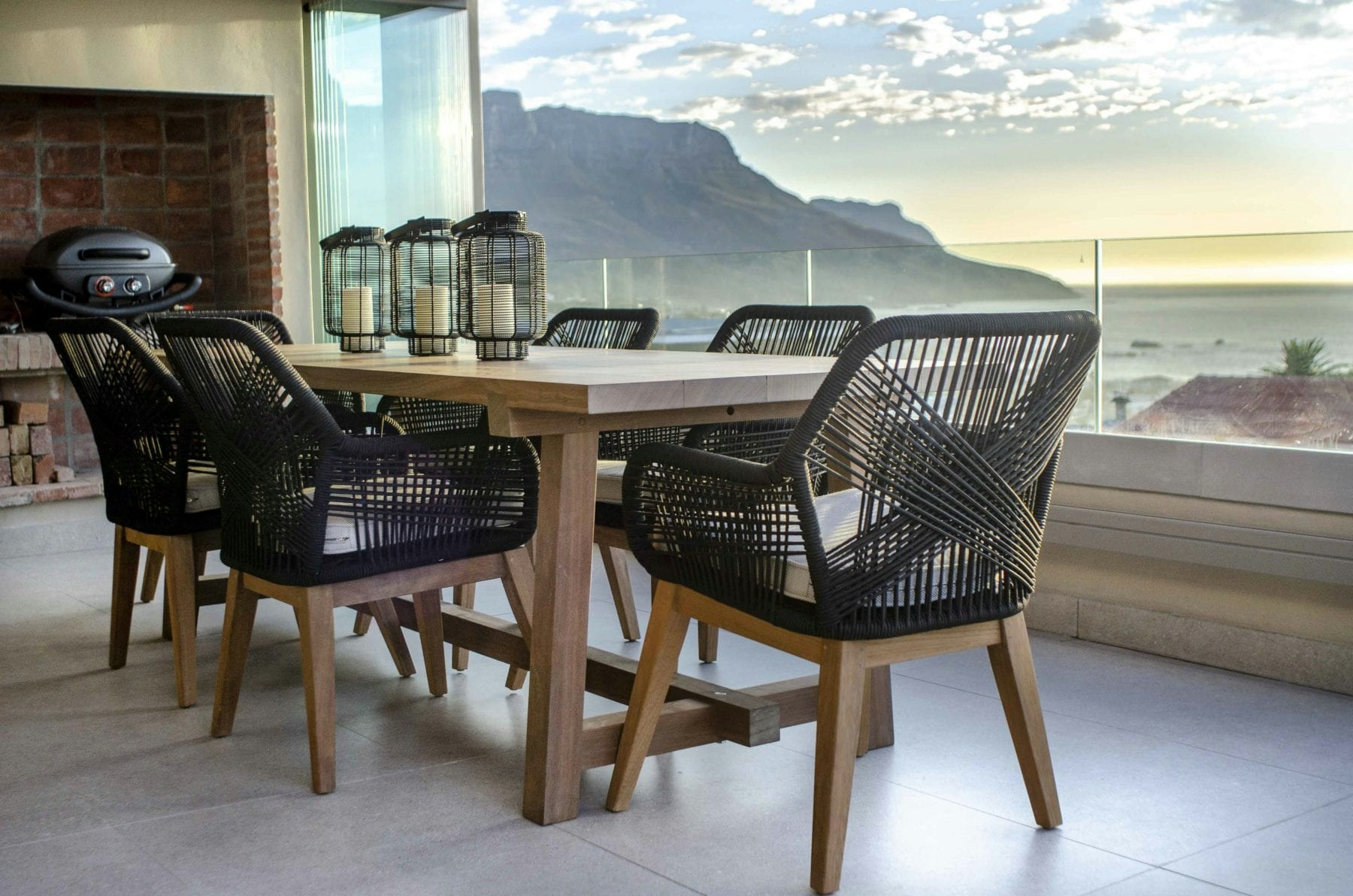 Kuier op die balkon buite en geniet die uitsig oor Kampsbaai. Die stoep het sitplek, gas- en houtbraaigeriewe en 'n etenstafel met sitplek vir 8.
