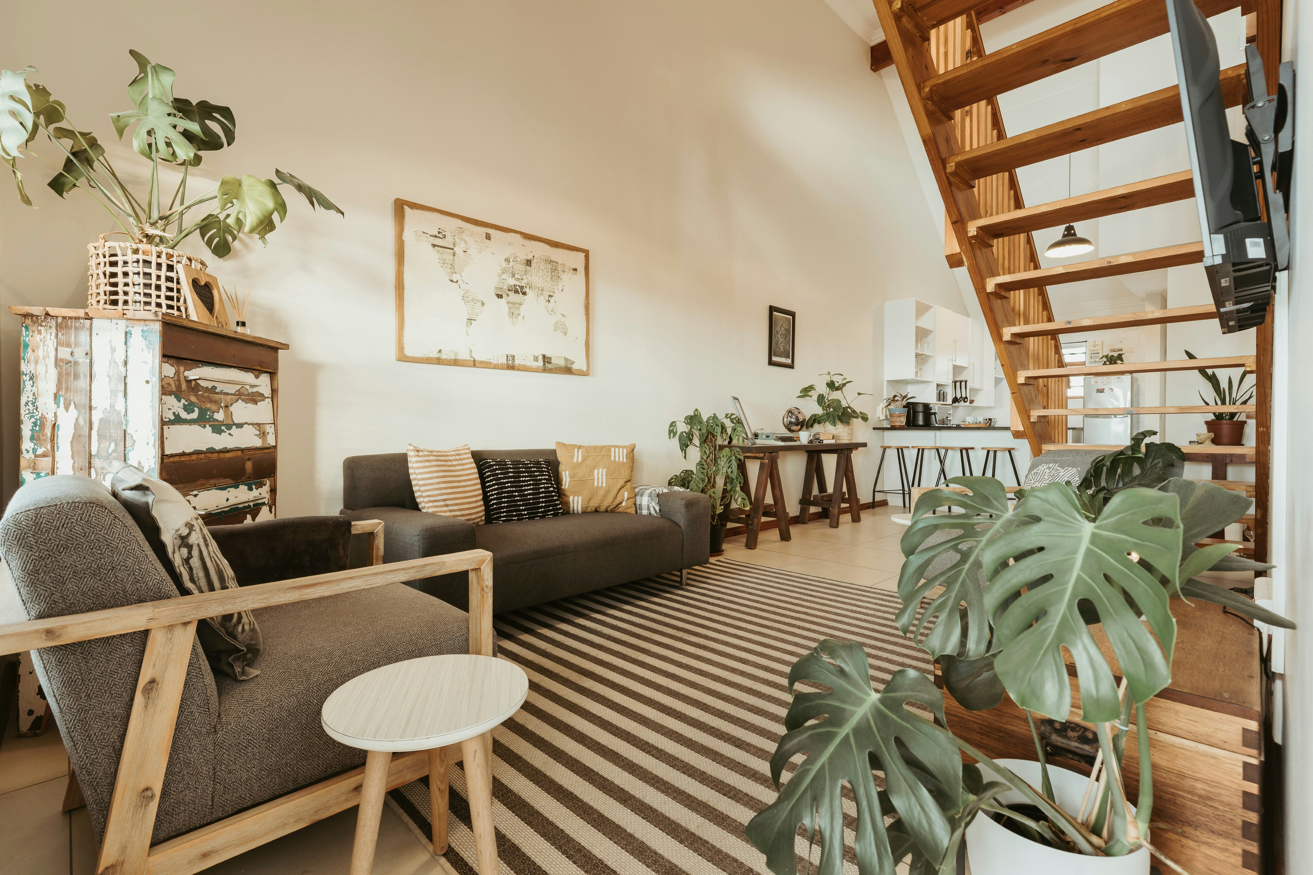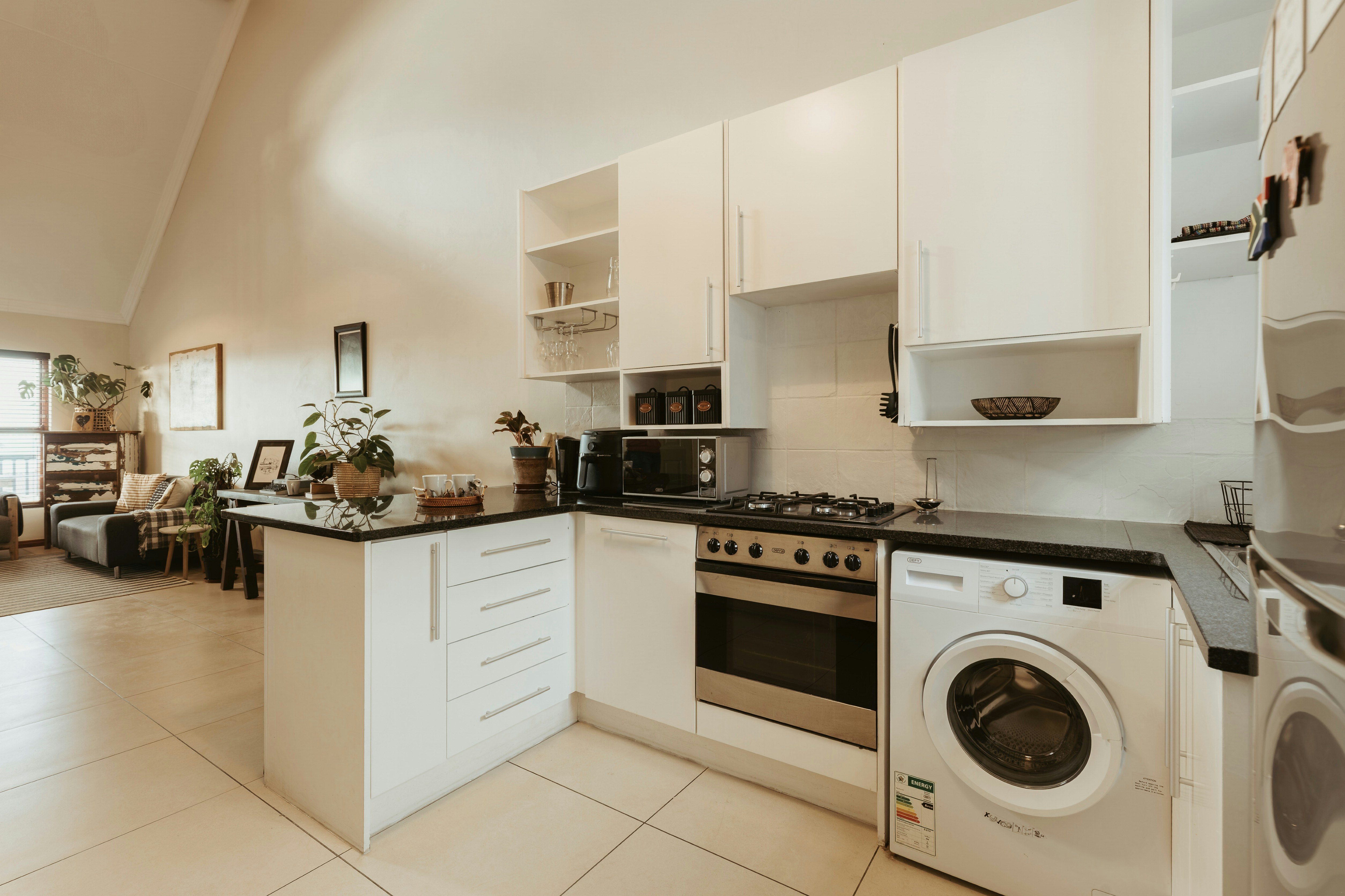 The kitchen is well-equipped for self-catering and includes a fridge-freezer, stove, oven, microwave, washing machine, and a breakfast counter with bar stools. The living area features comfortable seating and a TV. Upstairs, a loft area serves as an entertainment space and offers a selection of books, board games, and a futon.