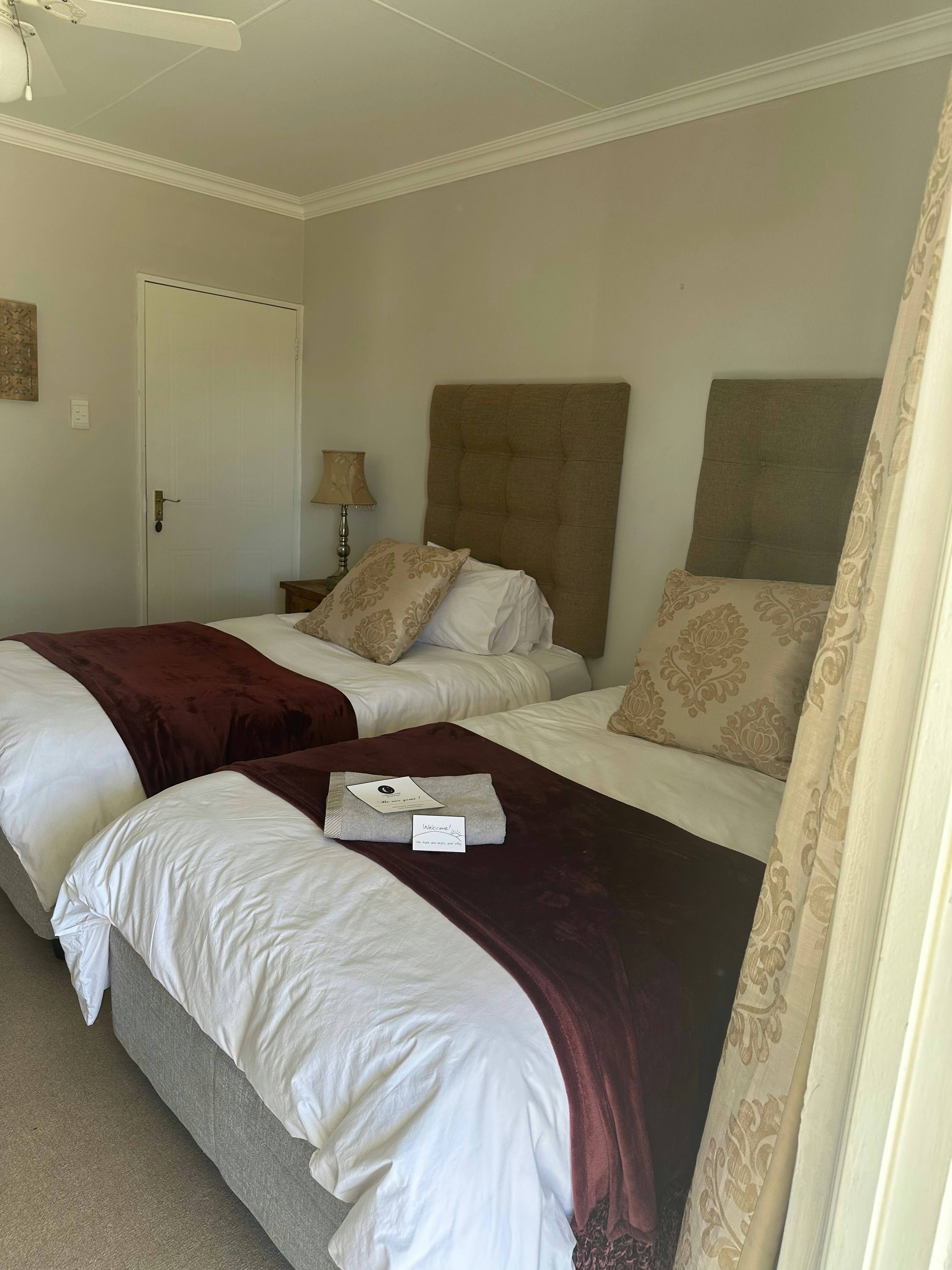We offer 4 beautifully decorated guest rooms, each furnished with comfortable beds, ceiling fans, TV, DStv, and an en-suite bathroom fitted with a shower/ bath, toilet, and basin for your convenience.