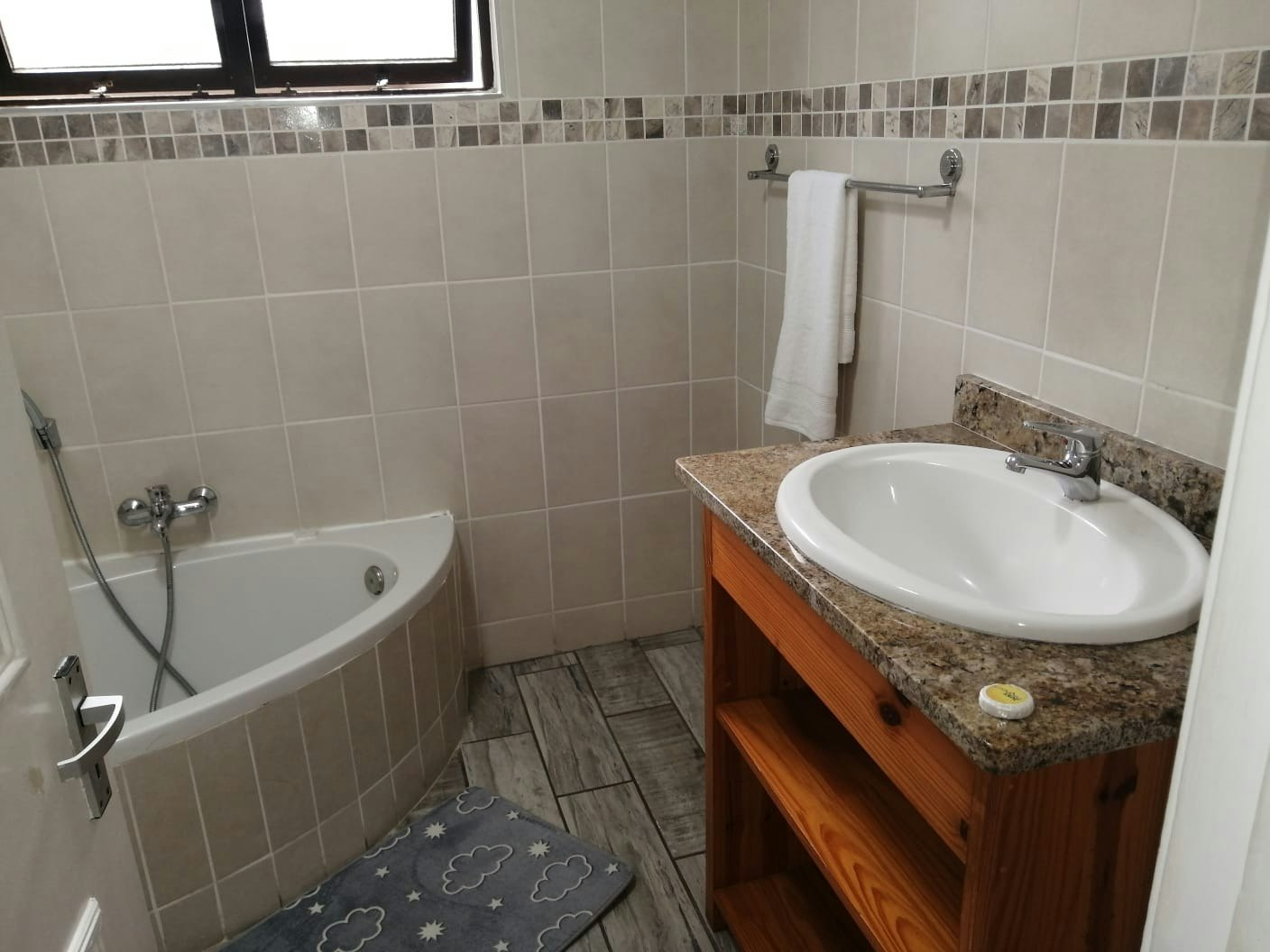 Hierdie eenheid kan tot 6 gaste op 'n slag akkommodeer en bestaan uit 3 slaapkamers, 2 badkamers en 'n gastetoilet. Die hoofslaapkamer is gemaklik gemeubileer met 'n dubbelbed en beskik oor 'n en suite-badkamer met 'n bad. Die tweede en derde slaapkamers het ook dubbelbeddens en deel die gebruik van die tweede badkamer, wat met 'n stort toegerus is. Linne word voorsien; gaste moet egter hul eie bad- en swemhanddoeke saambring.