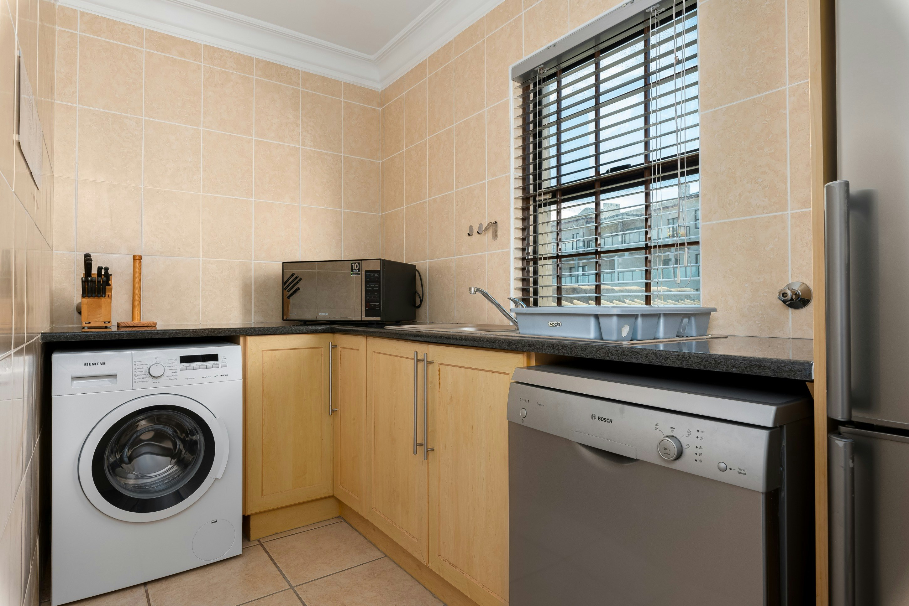 Die eenheid beskik oor 'n volledig toegeruste kombuis en opwasarea, insluitend 'n stoof, oond, mikrogolfoond, ketel, koffiemasjien, broodrooster, yskas-vrieskas, skottelgoedwasser, wasmasjien en 'n ontbyttoonbank met stoele. Die sitkamer en eetarea bied gemaklike sitplek vir gaste om te eet en te ontspan, terwyl vermaak deur 'n slim-TV en gratis WiFi verskaf word.